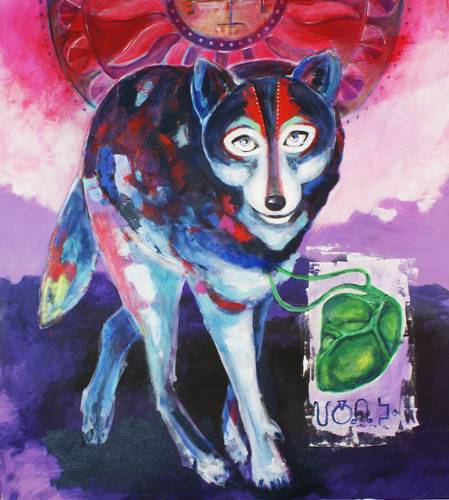 Obraz przyciąga uwagę eksplozją kolorów, gdzie purpura i róż przenikają się z żywymi tonami niebieskiego i czerwieni. Centralnym punktem jest intrygujący wilk, którego oczy zdają się patrzeć wprost na widza, jakby skrywał jakąś tajemnicę. Kompozycja jest dynamiczna, a tło pełne abstrakcyjnych form dodaje głębi. Atmosfera jest dość surrealistyczna, jakby wciągała nas do innego świata. Mówiąc szczerze, ten obraz jest po prostu 'wow'. Artysta zastosował technikę mieszania farb, tworząc efekt warstwowości i tekstury. Te kolory żyją swoim życiem. Obraz może wywoływać u odbiorcy uczucie zaskoczenia, a nawet lekki niepokój – jakby coś się kryło za tym uśmiechem zwierzęcia. „Wielka zielona liść!” - może odpowedzieć dziecko, zauważając detal na obrazie. Dla mnie, osobiście, to jak spojrzenie w głąb marzenia sennego, w którym rzeczywistość miesza się z iluzją. Po angielsku powiedziałbym, że to takie 'mind-bending'. W prostocie tego chaosu jest coś naprawdę pięknego.