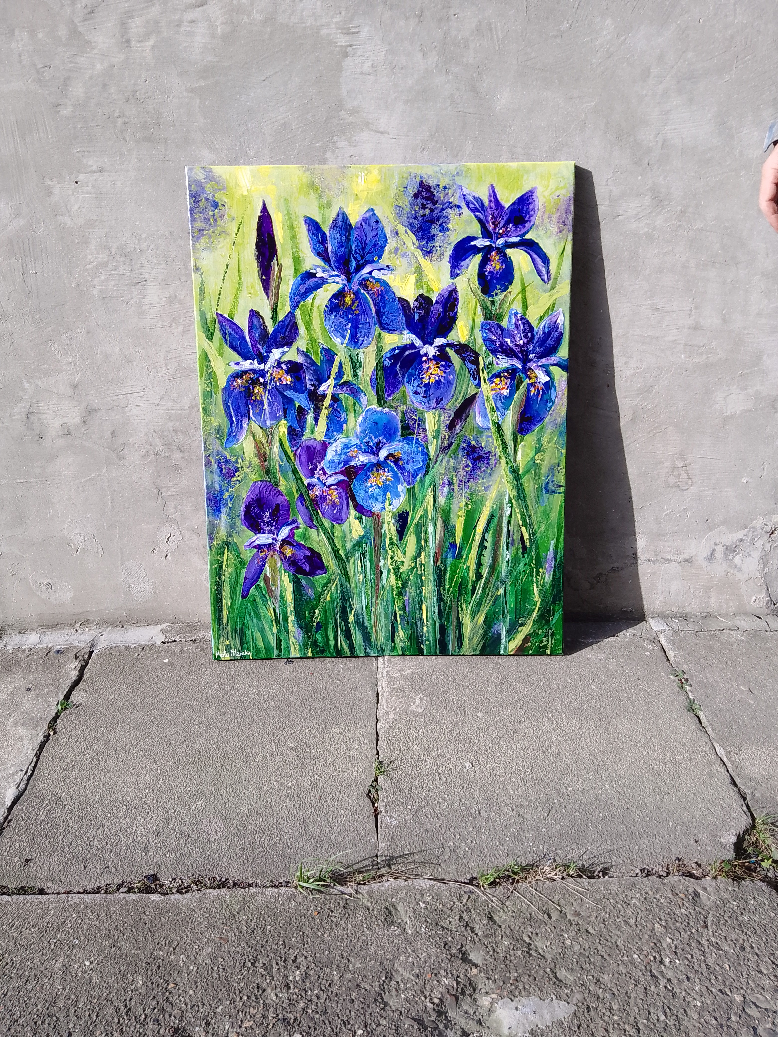 Obraz "Irysy" ma wyraziste, intensywne kolory, które ożywią każde wnętrze. Ma wyrazistą fakturę. Farba częściowo nakładana pędzlami, a częściowo szpachelkami.