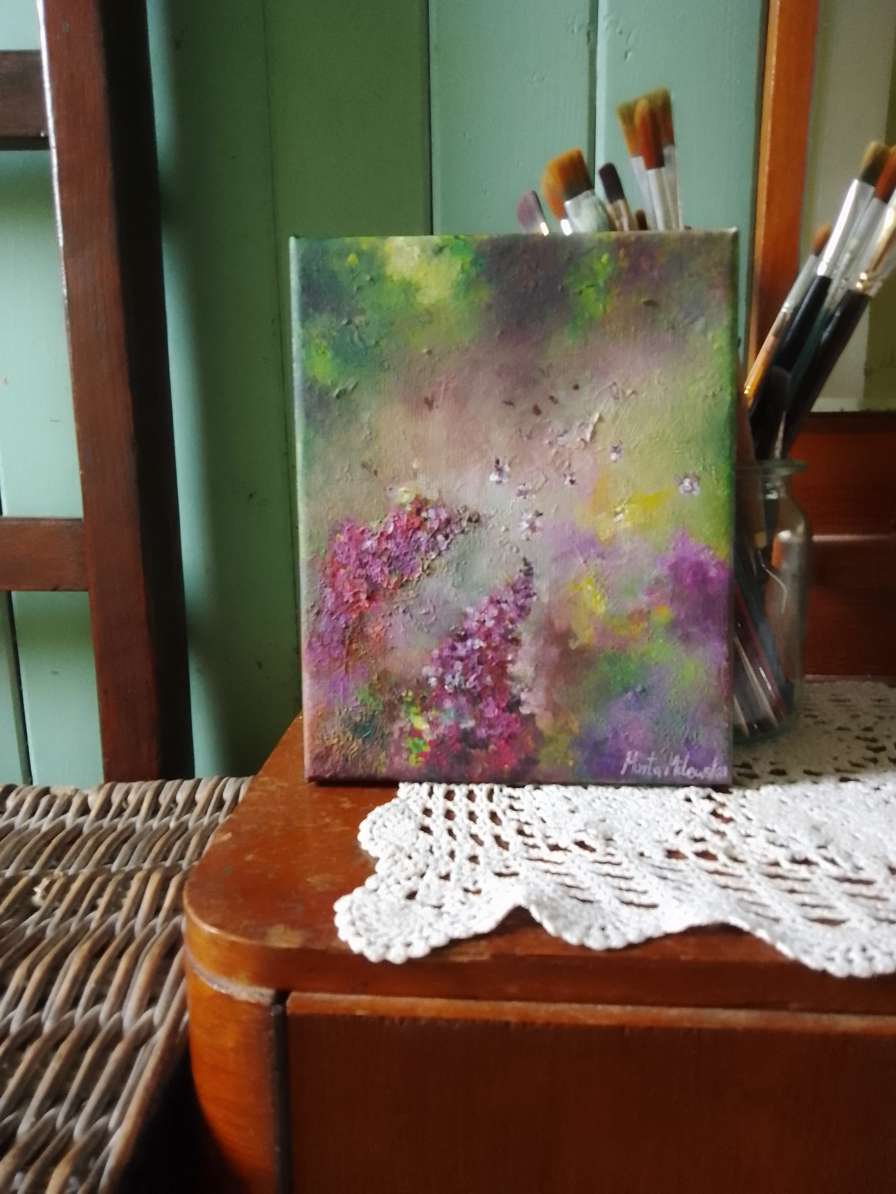 Obraz przedstawia kwiaty bzu namalowane w stylu abstrakcyjnym. Kolory są intensywne, nasycone, oddają wiosenny nastrój, ale i ulotność kwitnienia. Obraz jest pełen życia i kolorów. Dominuje tu paleta zieleni, fioletów i różu, które płynnie się przenikają, tworząc harmonijną kompozycję. Artysta zastosował technikę rozmytej faktury. Ruch pędzla jest wyraźny, jakby zamaszysty, nadając dynamiki i lekkości. Nastrój na obrazie jest intrygujący, niemal magiczny. Czujesz, że patrzysz na scenę z bajki, gdzie rośliny szepczą do siebie tajemnice. Aż chce się być częścią tej kolorowej krainy. Natura tu żyje. Styl przypomina nieco impresjonizm; rozmyte kontury, zwiewne formy. Artysta zdecydowanie postawił na emocje, a nie na detale. Wywołuje to ciepło i spokój, ale też pobudza wyobraźnię. Odnosi się wrażenie bycia na łące w ciepłe, letnie popołudnie, gdzie świat wiruje w swoim własnym rytmie.