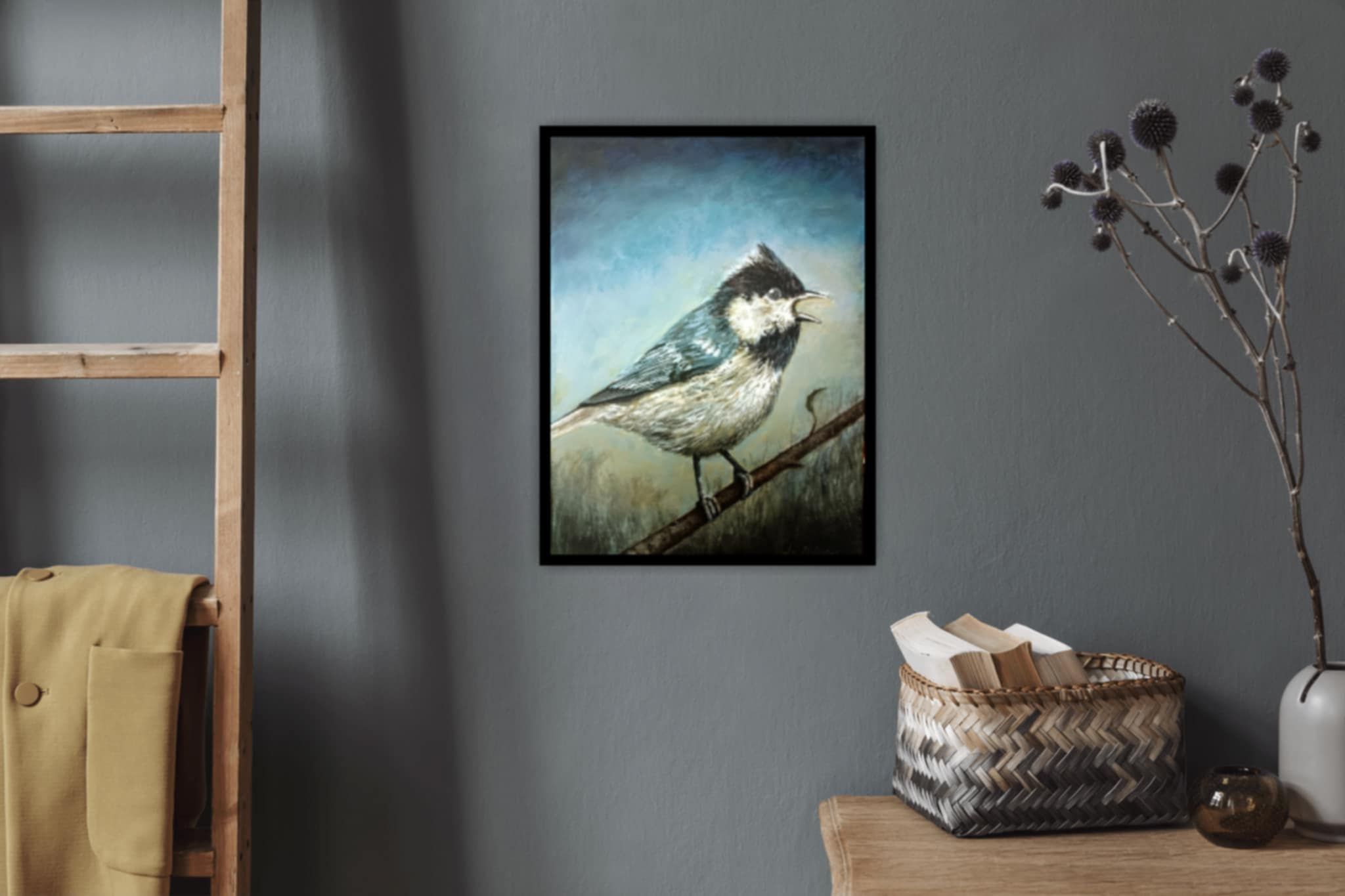 Obraz przedstawia pięknego ptaka, siedzącego na cienkiej gałązce. Jego upierzenie mieni się odcieniami niebieskiego, białego i czarnego, tworząc harmoniczną kompozycję. Tło obrazu, delikatnie rozmyte, utrzymane jest w miękkich tonacjach niebiesko-zielonych, które dodają scenie spokoju i uczucia przestrzeni. Wyraźne pociągnięcia pędzla nadają obrazowi dynamikę, a jednocześnie emanują delikatnością. Styl, którym artysta się posłużył, przywodzi na myśl klasyczne malarstwo, ale z nowoczesnym twistem. Można poczuć ciepło i przytulność, jakby obserwować ten ptasi widok z okna własnego domu. Spontaniczne ujęcie oddaje chwilę, kiedy ptak otworzył dziób, być może śpiewając czy też nawołując towarzyszy. Obraz może wywoływać u odbiorcy uczucie harmonii z naturą i przypominać o ulotnych, codziennych momentach piękna. Jest w nim coś magicznego i porywającego, co sprawia, że ma się ochotę westchnąć z zachwytem. Wszystko to składa się na niezwykły klimat. *Obraz sprzedawany jest bez ramy