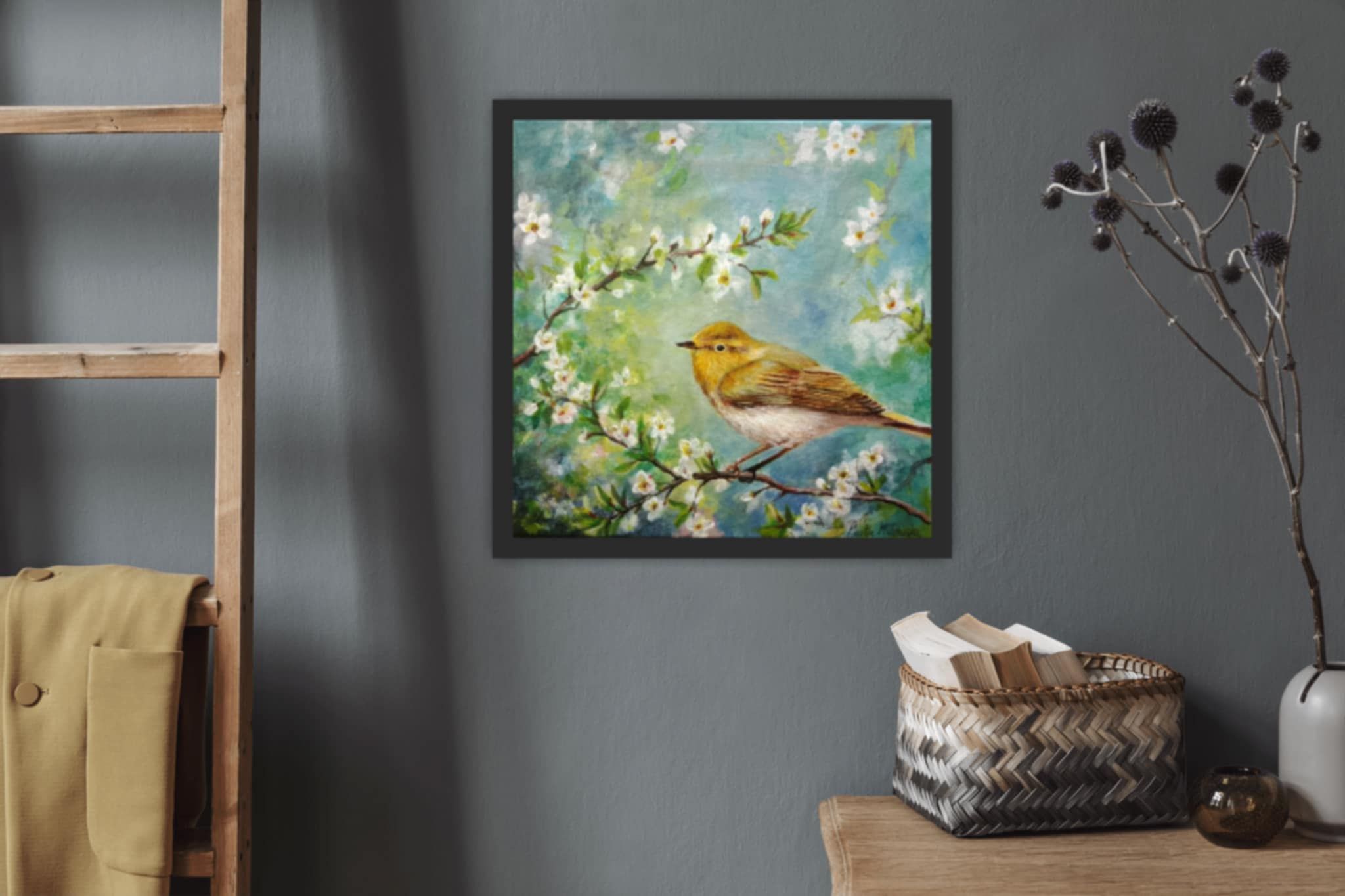 Na tym uroczym obrazie widzimy ptaka siedzącego na gałęzi drzewa obsypanej białymi kwiatami. Tło jest łagodnie zamazane, co dodaje głębi i sprawia, że patrzymy przede wszystkim na ptaka i kwiaty. Kolory są delikatne, z przewagą świeżej zieleni i błękitu, co nadaje dziełu wiosenny, radosny nastrój. Styl artystyczny jest realistyczny, ale z nutą impresjonizmu. Widoczne są precyzyjne pociągnięcia pędzla, szczególnie w piórach ptaka i płatkach kwiatów. To wszystko stwarza wrażenie, jakbyśmy niemal mogli dotknąć tych delikatnych elementów. Ptak wygląda jak część bajkowego świata, gdzie przyroda szepcze swoje sekrety. Obraz emanuje takim ciepłem i spokojem, że aż chce się uśmiechać, w drobnych chwilach kryją się największe cuda. *Obraz sprzedawany jest bez ramy