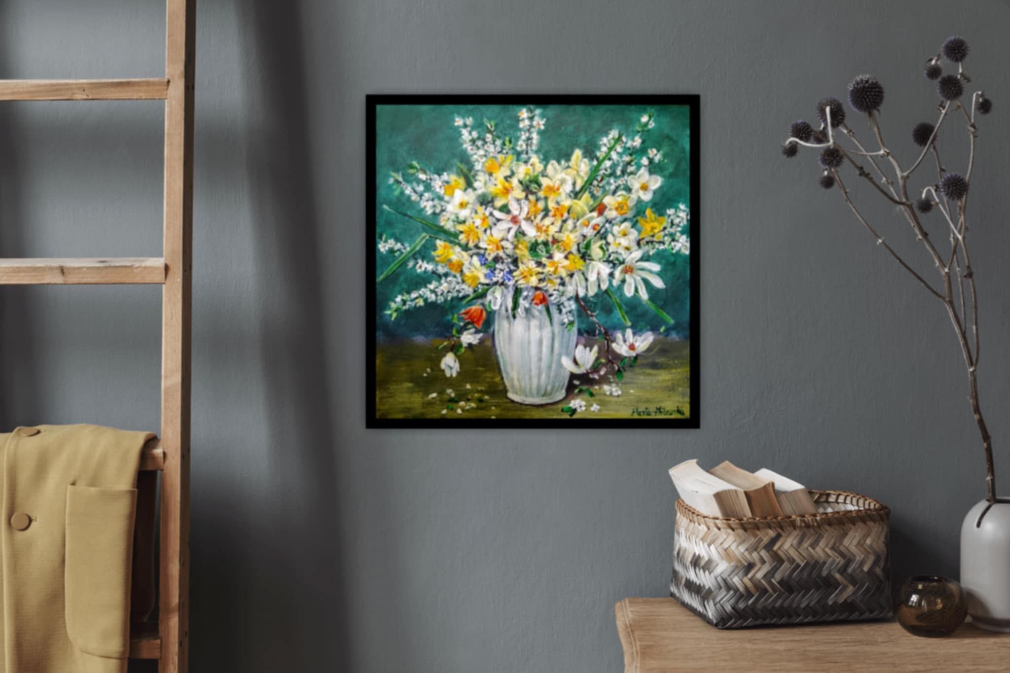 Obraz przedstawia bukiet pełen energetycznych barw, który przyciąga wzrok niczym magnes. Białe i żółte kwiaty, schowane w eleganckim, białym wazonie, tworzą harmonijną kompozycję na tle zielonej ściany. Barwy są intensywne. Wybijają się ciepłe kolory i kontrast z chłodnym tłem. Kwiaty wydają się niemal tańczyć na płótnie, ich płatki delikatnie zakrzywione, jakby poruszane przez niewidzialny wiatr. Magiczny wręcz spokój bije z tego dzieła. Atmosfera jest radosna, niemal wiosenna, a jednocześnie nostalgicza i spokojna. Artysta wydaje się używać techniki impastu, co dodaje obrazowi faktury i życia. Grube pociągnięcia pędzlem nadają florystycznej kompozycji trójwymiarowość. Patrząc na ten obraz, czujemy zapach świeżych kwiatów i ciepły promień słońca na twarzy. Obraz ten może skłonić do refleksji nad ulotnością chwili, przypominając o pięknie codzienności, jak chwilowy zapach wiosny. *Obraz jest sprzedawany bez ramy