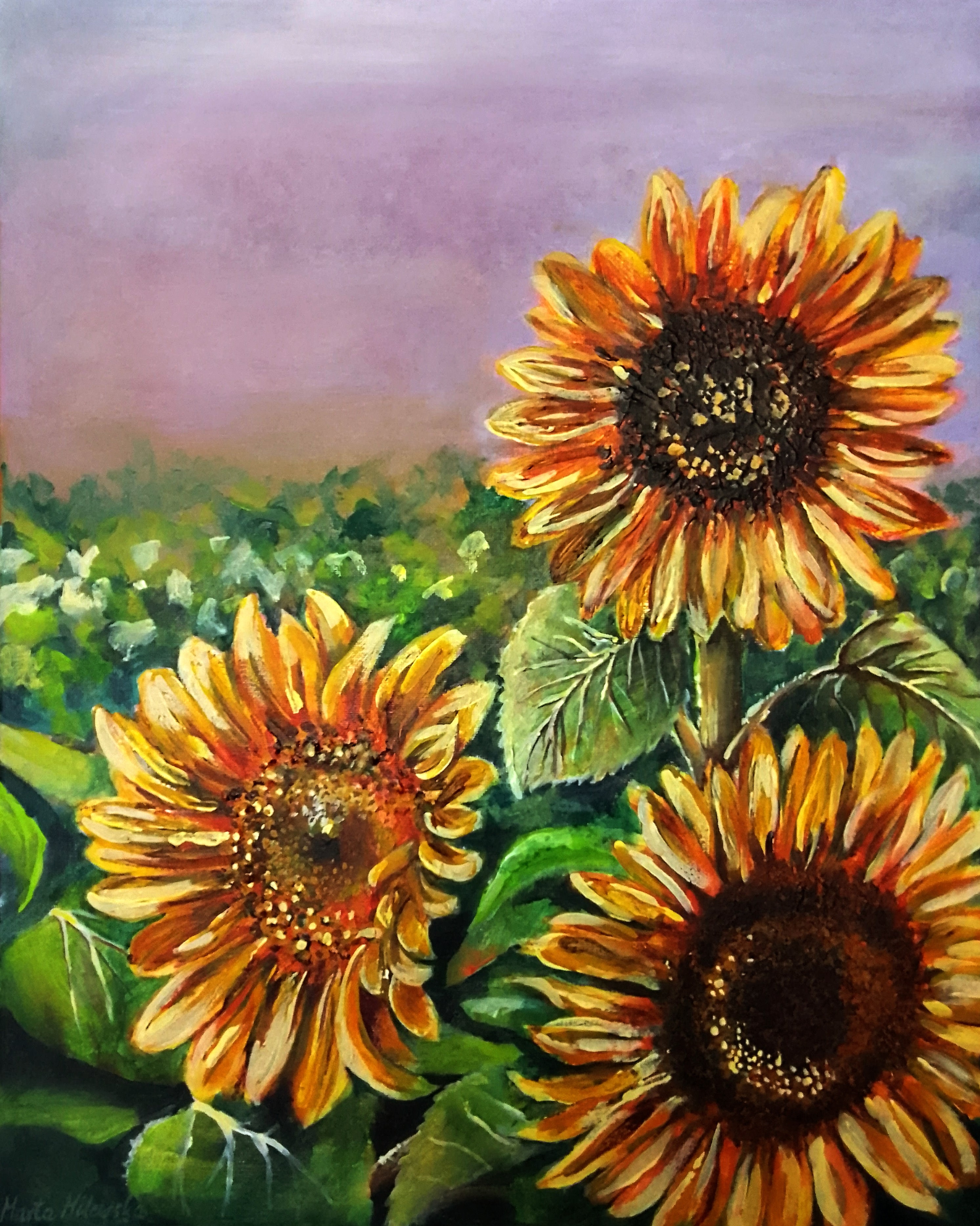 Obraz przedstawia trzy słoneczniki dumnie stojące na tle rozmytego różowo-fioletowego nieba. Ich płatki są jakby dotknięte złotem, przeplatają się odcienie żółtego i pomarańczowego, tworząc ciepłą i promienną kompozycję. To trochę jak patrzeć na małe słońca, które rozświetlają krajobraz. Zielone liście wypełniają dolną część obrazu, dodając głębi i kontrastu. Atmosfera jest sielska, pełna letniego ciepła i spokoju. Artysta użył techniki impastu, co dodaje faktury i życia płatkom i liściom. *Obraz jest sprzedawany bez ramy Patrząc na to dzieło, można poczuć przypływ radości. Słoneczniki zdają się być pełne energii, niemalże słychać ich szept na wietrze. Obraz skłania do refleksji nad przemijaniem i pięknem teraźniejszości. Niezwykle angażujący, działa jak ciepły uścisk.