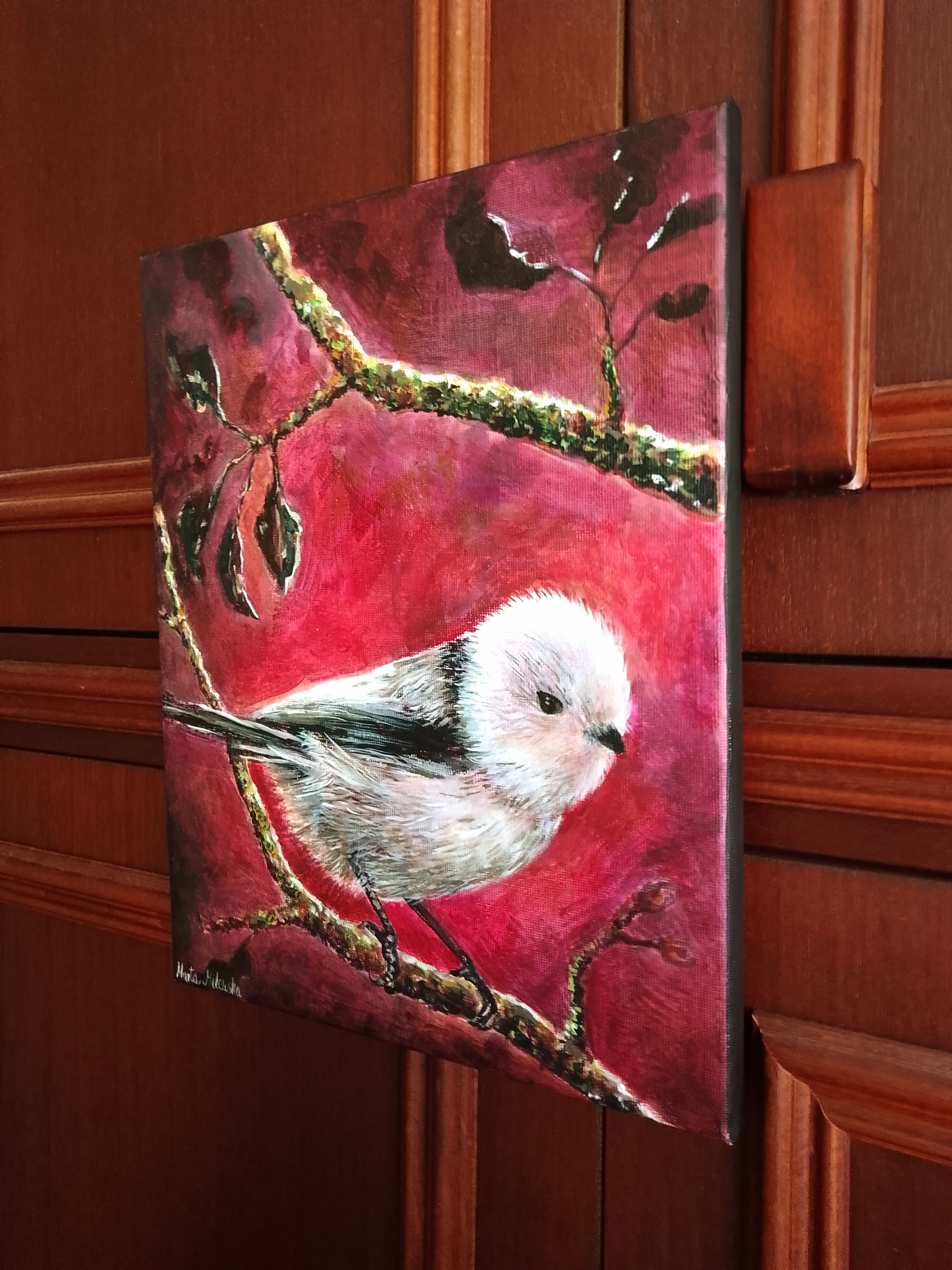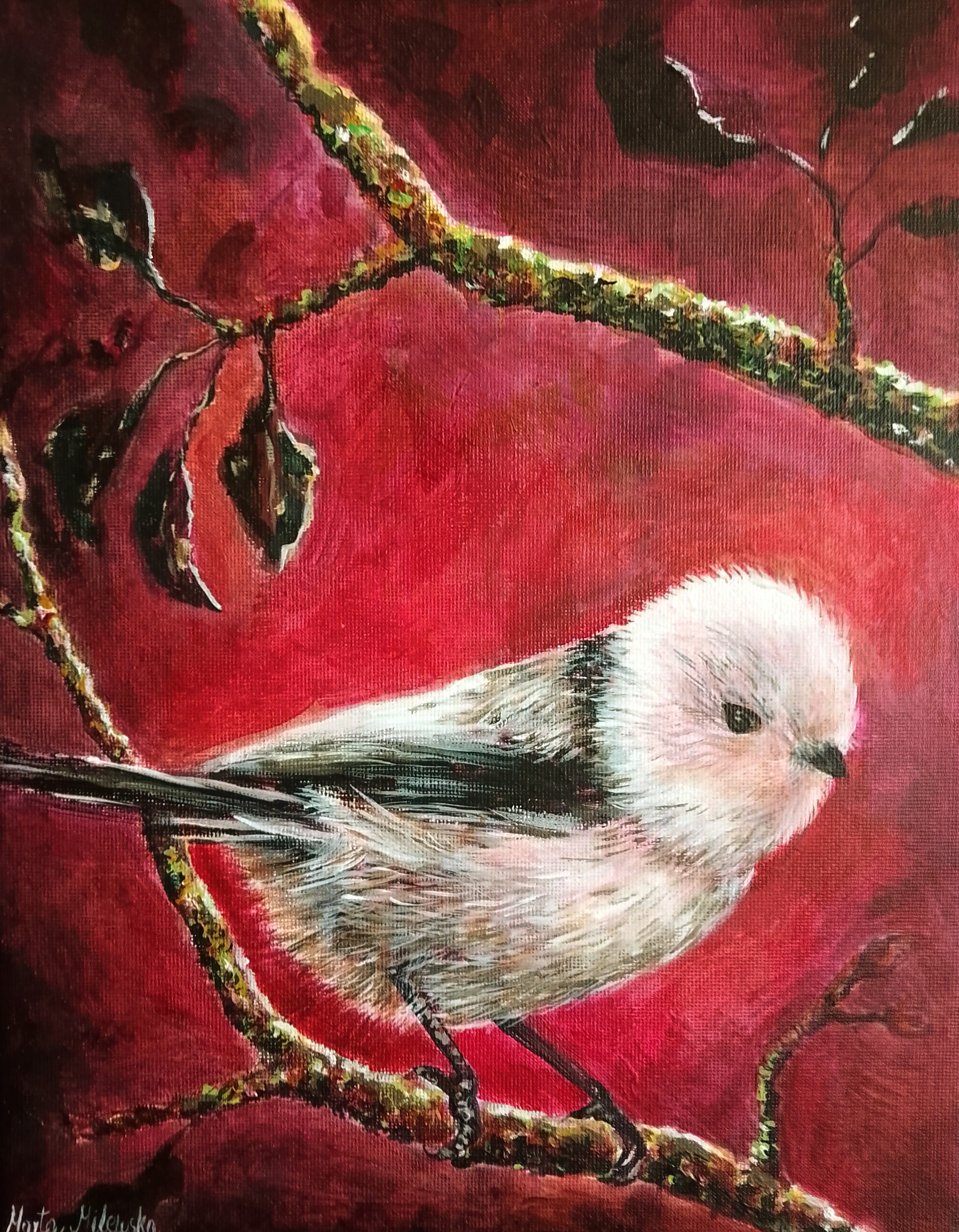 Na obrazie mały ptak siedzi na ukośnej, omszałej gałązce, a za nim pulsuje ściana karminów i burgundów z domieszką różu, jak żar po zachodzie. Pióra modelowane krótkimi, nerwowymi pociągnięciami są perliste i trochę glossy, z połyskami bieli i popielu. Kontury liści są poszarpane, niemal cieniowe, co porządnie dociąża kompozycję. Ten ptaszek jest miękki jak chmurka. Atmosfera jest ciepła, ale i trochę niepokojąca, jakby cisza przed pierwszym śniegiem. Czuć zapach wilgotnej kory. To malarstwo akrylowe, z laserunkowym tłem i impastowymi akcentami. Widać kruchość życia i odwagę trzymania równowagi nad pustką. Troche melancholii, troche nadziei.