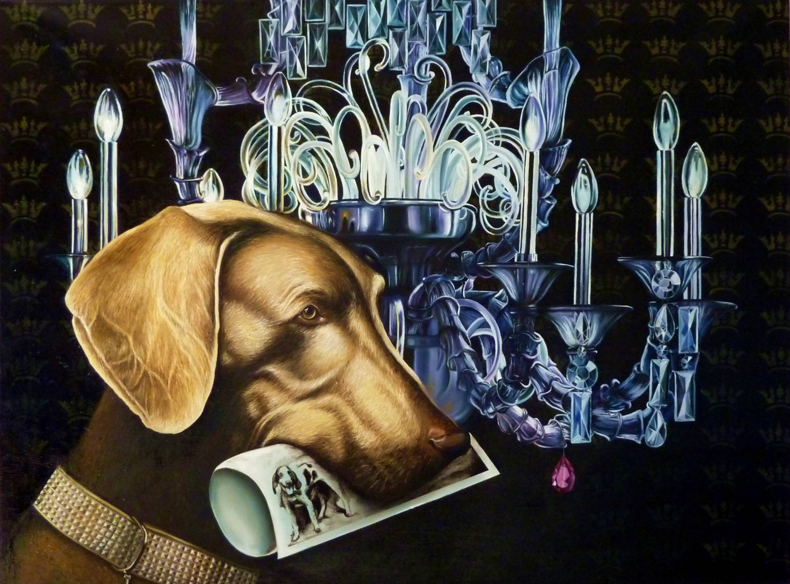 Na obrazie widać psa o złocistym umaszczeniu, trzymającego w pysku białą filiżankę z wizerunkiem psów. Tło to bogato zdobiony żyrandol, skrzący się w odcieniach błękitu i fioletu. Światło odbija się od kryształowych elementów, tworząc magiczną, wręcz bajkową aurę. Atmosfera obrazu jest nieco surrealistyczna, jakby czas się zatrzymał, a bohater wpadł w bajkowy snu. Artysta zastosował realistyczną technikę, precyzyjnie oddając detale jak faktura sierści czy blask kryształów. Niby proste, ale jednak intrygujące. Pies wygląda na spokojnego, a jednocześnie jego spojrzenie można odczytać jako pełne głębokiej refleksji. Czy on coś knuje? Może zastanawia się, dokąd zabierze swoją filiżankę. Obraz może wywoływać różne emocje. Dla jednych to zabawny widok pieska arystokraty, dla innych to symbol samotności, dostojnie odnajdujący się w splendorze luksusowego wnętrza. Wow, jaki ten pies elegancki! Każdy interpretujący może dostrzec w tej scenie coś innego, może nawet własne pragnienia freedom. Patrząc na tę sztukę, myślę o ukrytych marzeniach i granicach, które przekracza sztuka.