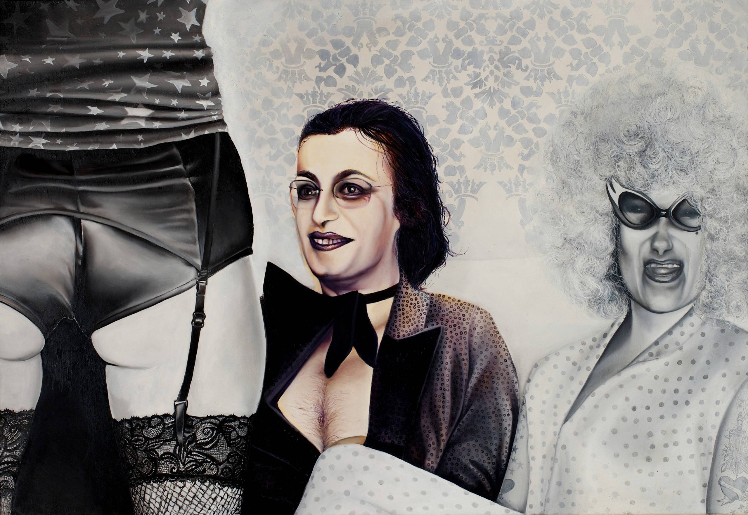 Na obrazie dominują ciemne barwy, przeplatające się z różnymi odcieniami szarości. Te kontrasty tworzą dynamiczną kompozycję. Kontury postaci są wyraźne, a linie przerywają monotonię, jakby obraz opowiadał własną historię. Jeden z bohaterów ma na sobie elegancki strój z koronką, która dodaje nutkę dekadencji i tajemnicy. Obok, twarz w okularach kotka przyciąga wzrok, emanując nonszalancją i pewnością siebie. Tło z motywem kwiatowym dodaje subtelnego uroku. Atmosfera obrazu jest nieco nostalgiczna, ale też z odrobiną buntu. Artysta zastosował techniki realistyczne z nutką surrealizmu, co sprawia, że dzieło jest jednocześnie prawdziwe i nie z tego świata. Obraz może wywoływać emocje związane z wewnętrzną wolnością, a także zasygnalizować walkę z konwenansami. To jakby miszmasz emocji lekką ręką zapisany na płótnie. "Dziwnie się śmieją te postacie!" – mogłoby powiedzieć dziecko, patrząc na nie. A patrząc na całość, człowiek czuje, że życie to rollercoaster, pełen niespodzianek i dziwnych spotkań. Taki obraz łatwo przyciąga uwagę, bo pokazuje, że everyday life może być barwne i interesujące, jeśli spojrzymy na nie z odpowiedniej perspektywy. W tym wszystkim jest pewność, że artysta tchnął w swoje dzieło prawdziwe emocje, czasem ukryte za maską frywolności.