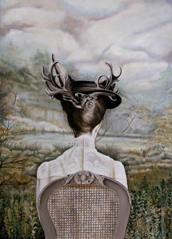 Obraz intryguje od pierwszego spojrzenia. Widoczna postać siedzi tyłem na delikatnie zdobionym fotelu. Jej głowę zdobi niezwykła konstrukcja przypominająca rogi, co wprowadza element surrealizmu. Kolory są stonowane, dominują odcienie ziemni: zielenie, brązy i beże, co nadaje całej scenie nieco jesienny, nostalgic mood. W tle rozciąga się spokojny krajobraz; przyroda zdaje się być zamglona, co wzmacnia uczucie tajemnicy. Artystyczny styl obrazu balansuje między realizmem a surrealizmem. Detale, takie jak misternie wykonana koronka na sukni, kontrastują z fantazyjną stylizacją włosów. To połączenie wprawia widza w pełen wątpliwości stan, zmuszając do refleksji na temat granic między rzeczywistością a fantazją. Można prawie poczuć, jakby czas się zatrzymał. Obraz budzi skojarzenia z magią i naturą. Czy to symbol wolności, czy może zaproszenie do świata wyobraźni? Dzieło zmusza do zadawania pytań. Dlaczego ta osoba ma rogi jak jeleń? Takie pytania rodzą się w głowie. Byłoby super mieć takie rogi na bal maskowy! Atmosfera obrazu jest pełna spokoju, ale z nutką niepokoju. Wprowadzona tajemnica jest jak szczypta chili w czekoladzie. Może to być opowieść o harmonii z naturą lub wyzywająca gra z tradycją. Moje myśli ciągle wracają do tego jednego pytania - co artysta chciał przez to powiedzieć? Fascynujące jest to, jak jedno dzieło może budzić tyle różnych emocji.