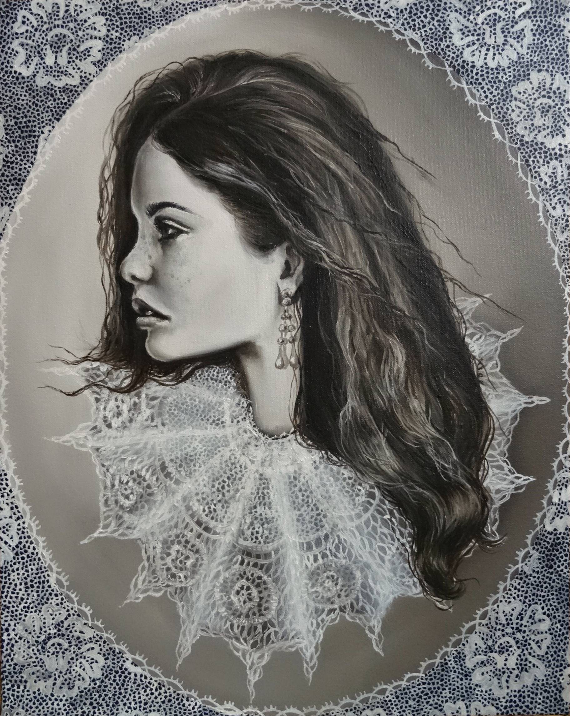 Obraz przedstawia profil kobiety z długimi, falującymi włosami w odcieniach sepii, które dodają mu nostalgicznego charakteru. Tło jest subtelne, stłumione kolory podkreślają delikatność postaci. Artysta zastosował technikę, która łączy realistyczne detale z koronkową fakturą otaczającą postać. Ta koronkowa rama jest niczym fancy ornament, dodając elegancji i delikatności. Atmosfera obrazu jest spokojna, nieco melancholijna. Można poczuć nutkę tajemnicy, jakby portret skrywał opowieść z przeszłości. Styl malarza to mieszanka realizmu i dekoracyjności, mistrzowsko operuje światłem i cieniem, aby uchwycić subtelne emocje na twarzy kobiety. Patrząc na obraz, można odczuć spokój, a jednocześnie lekki niepokój - kim była ta dama? Małe dziecko mogłoby powiedzieć: "Ona nosi bardzo ładną koronkową bluzkę!" To jakby malarz zaprosił nas do rozmowy z innym wiekiem, czasem pełnym tajemnic. Obraz budzi chęć zanurzenia się w tej opowieści i poznania jej szczegółów. Sztuka ma moc przenosić nas w czasie, a ten portret jest tego doskonałym przykładem.