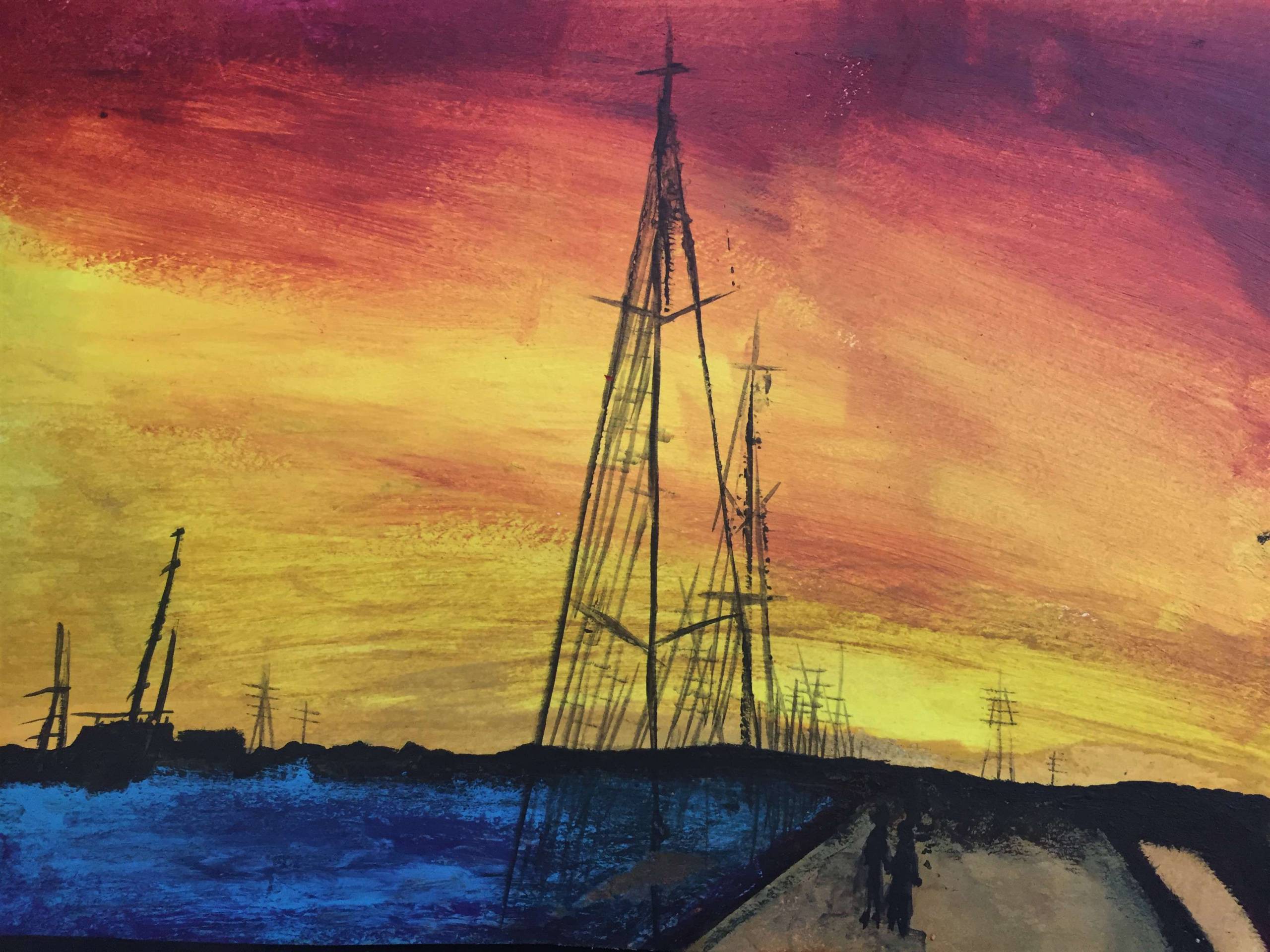 Słońce zachodzi nad horyzontem, a niebo płonie kolorem czerwonym i złocistym. To jakby ktoś wylał na płótno całą paletę ciepłych barw, tworząc niesamowitą mieszankę odcieni. Po niebie rozciągają się smukłe, ciemne sylwetki masztów i linii energetycznych, ich ostre kształty kontrastują z miękkością tła. Czuć tu niepokój, jakby tuż przed burzą lub po długim dniu pełnym wyzwań. Artysta użył techniki akwareli, delikatnie zacierając granice między kolorami, co dodaje głębi i dynamiki. Ta scena wprowadza w refleksyjny nastrój, skłaniając do przemyśleń o przemijaniu i potędze natury. Może przypominać gęste linie życia w czerwonym morzu wspomnień. "I love sunset!" powiedziałby mały artysta patrząc na to dzieło. Patrząc na tę kompozycję, czuję ciepło, jakby wieczór otulał mnie miękkim kocem. Kiedy przyglądasz się obecniej, zauważasz, jak każdy detal zdaje się mieć swoją własną historię do opowiedzenia.