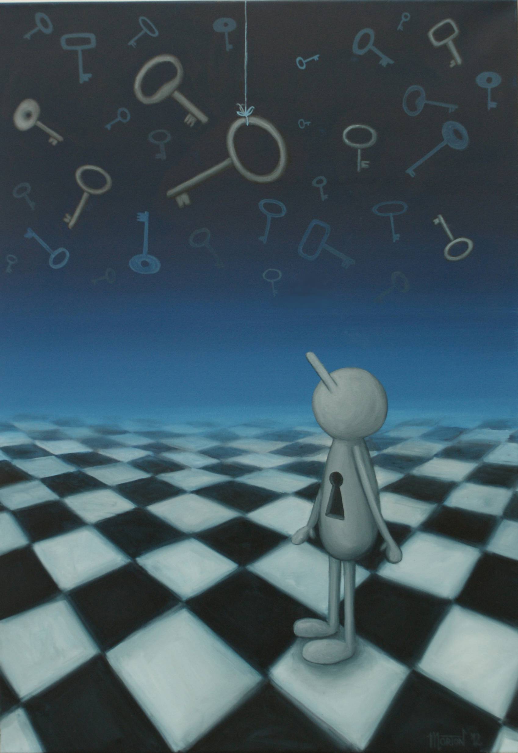 Każdy człowiek pragnie być szczęśliwy. Dla każdego to słowo oznacza coś innego.Każdy, gdzie indziej szuka, spotyka szczęście. Obrazy są ilustracjami symbolicznymi o charakterze dekoracyjnym. Ukazują różne sposoby poszukiwania szczęścia.Symbolem szczęścia są klucze, a pragnienia otwór na brzuszku ludzika. Postać poszukującego przedstawiona jest bezosobowo oraz nie wyraża uczuć, by każdy oglądający niezależnie od płci i wieku mógł się z nim utożsamić i po swojemu określić emocje jakie wzbudza oglądana scena w nim samym. Obraz po dwóch wystawach indywidualnych w Lublinie i Warszawie.