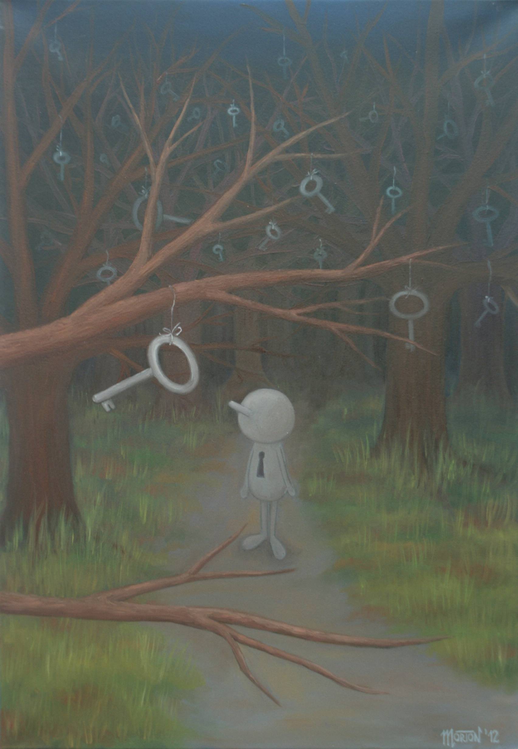 Każdy człowiek pragnie być szczęśliwy. Dla każdego to słowo oznacza coś innego.Każdy, gdzie indziej szuka, spotyka szczęście. Obrazy są ilustracjami symbolicznymi o charakterze dekoracyjnym. Ukazują różne sposoby poszukiwania szczęścia.Symbolem szczęścia są klucze, a pragnienia otwór na brzuszku ludzika. Postać poszukującego przedstawiona jest bezosobowo oraz nie wyraża uczuć, by każdy oglądający niezależnie od płci i wieku mógł się z nim utożsamić i po swojemu określić emocje jakie wzbudza oglądana scena w nim samym. Obraz po dwóch wystawach indywidualnych w Lublinie i Warszawie.