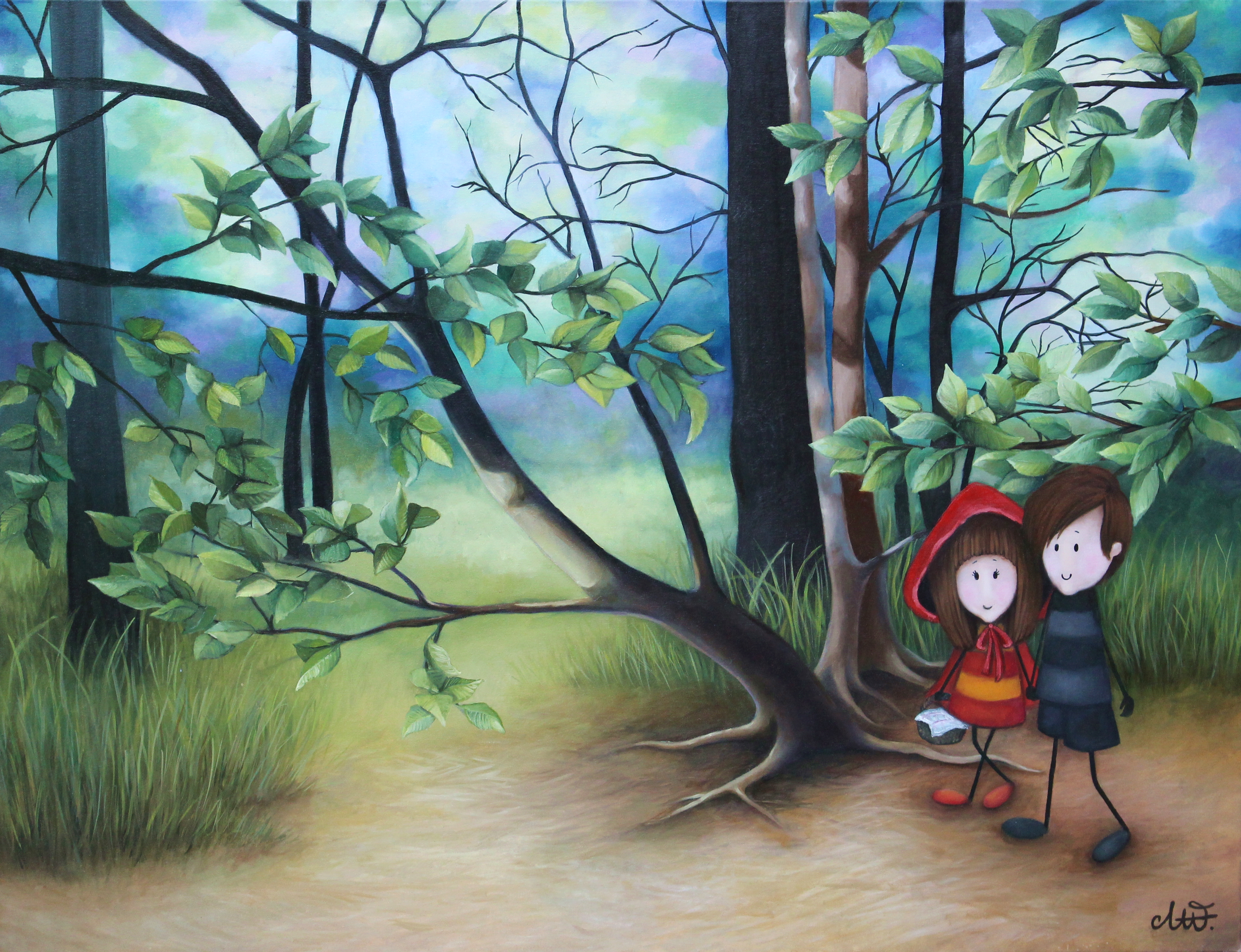 Na obrazie widzimy dwoje dzieci stojących pod drzewem w gęstym lesie. Dominują żywe kolory zieleni i błękitu, które przeplatają się w tle, tworząc magiczną, niemal bajkową atmosferę. Postacie są uproszczone, z dużymi głowami i cienkimi nogami, co przywodzi na myśl kreskówki. Dziewczynka w czerwonej pelerynie trzyma coś w ręku, jakby to było coś secret. Chłopiec obejmuje ją z troską, co buduje poczucie bezpieczeństwa i zaufania między nimi. Ale jak się tak bardziej zastanowić, czuć też nutę tajemnicy. Czujesz, że te dzieci wyruszają na jakąś wielką przygodę, prawda? Artystyczny styl obrazu przypomina techniki stosowane w ilustracjach książek dla dzieci, z miękkimi liniami i pastelowymi kolorami. Takie podejście wywołuje poczucie ciepła i nostalgii, ale daje też przestrzeń do marzeń. Może kojarzyć się z niekończącymi się przygodami w lesie, jakie pamiętamy z dzieciństwa. Jest tu jednak też coś "mysterious", jakby ilustracja skrywała tajemnicę do odkrycia. Patrząc na ten obraz, odczuwam spokój i radość, trochę jak dziecięce szczęście na widok tęczy. Można by godzinami patrzeć na tę scenę i snuć własne historie o tym, dokąd zmierzają te dzieciaki.
