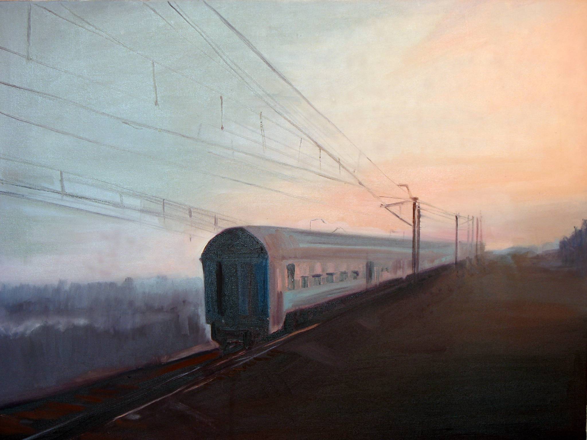 Ten obraz przedstawia samotny pociąg mknący po torach o zmierzchu, owiany mglistą aurą. Dominują subtelne, pastelowe barwy, które przechodzą od zimnych niebieskich tonów na lewo po ciepłe odcienie pomarańczu i różu po prawej stronie horyzontu. Kompozycja jest minimalistyczna, z liniami torów prowadzącymi wzrok w dal, aż po nieskończoność. Gdzie ten pociąg jedzie? Pewnie daleko! Atmosfera obrazu jest nostalgiczna, trochę sennie tajemnicza. Artysta wykorzystał miękkie pociągnięcia pędzla, co nadaje całości dreamlike quality, jakby to był tylko wspomnienie, a może i marzenie. Technika malarska jest delikatna, prawie impresjonistyczna, ale z mniejszą ilością detali, co pozwala odbiorcom skupić się na emocjach płynących z dzieła. Obraz może wywoływać uczucie tęsknoty, refleksji nad przeszłością i przyszłością. Czy to jest podróż w nieznane, czy może powrót do domu? Patrząc na niego, myślę o wieczornych spacerach, o tej cichej chwili, kiedy świat wokół zwalnia. Może sobie coś wyobrażam, ale ten obraz czuję jak rozmowę z samym sobą, jakby pytał: "dokąd zmierzasz?"