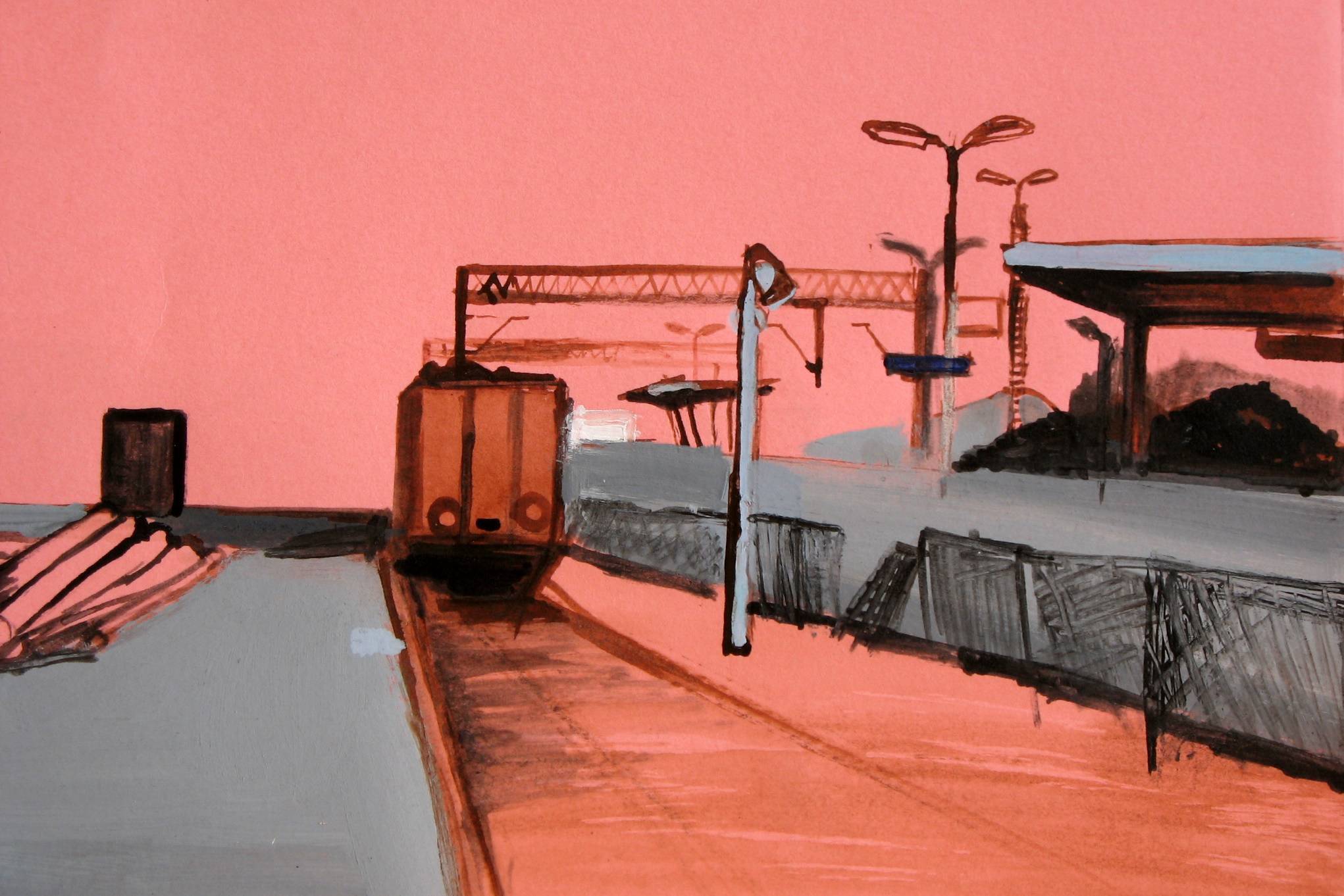 Na obrazie dominuje ciepły, różowy odcień, który otula całą scenę jak welon o zachodzie słońca. Wyraziste linie torów i zarys peronu przyciągają wzrok, prowadząc go ku horyzontowi, gdzie znikają za horyzontem. Kształty są szorstkie i surowe, co dodaje pewnego industrialnego charakteru temu przedstawieniu. Całość jest niczym moment wyjęty z codziennego pośpiechu, gdzie można poczuć nostalgię za minionymi chwilami. Czuje się tu spokój, może trochę osamotnienie. Ale jednocześnie, jest w tym coś pociągającego. Styl artysty jest prosty, a jednocześnie pełen wyrazu. Technika—prawdopodobnie akryl lub gwasz—nadaje obrazowi matowe wykończenie, co dodaje do surowego charakteru dzieła. Pociągnięcia pędzlem są zdecydowane, niczym ślady zostawione przez mijający czas. Dla mnie to przypomina stary film, może taki z lat 70., który ogląda się z lekką tęsknotą. Kiedy patrzę na ten obraz, odczuwam delikatne ukłucie melancholii. Co ciekawe, mimo tej prostoty, jest w nim coś, co mówi "chill out", wypocznij, złap oddech. Każda linia, każdy cień wydają się być na swoim miejscu, choć można by pomyśleć, że chaos dominuje scenę. Może to miejsce, gdzie czas zatrzymał się na chwilę, a może to po prostu czekanie na pociąg życia, który nigdy nie przyjeżdża na czas. Patrząc na to, dziecko by powiedziało: "To pociąg do nieba!". I być może miało by rację.