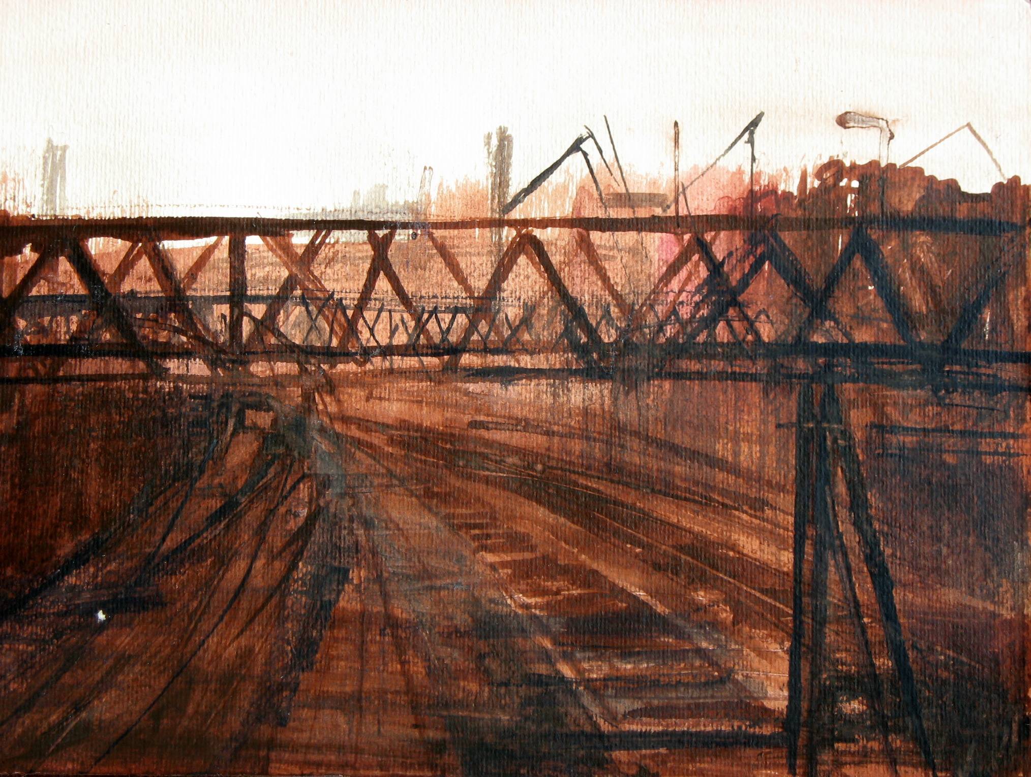 Obraz przyciąga wzrok ciepłymi odcieniami brązu i pomarańczu, które tworzą melancholijną atmosferę zachodzącego słońca. Dominującym elementem jest most, złożony z geometrycznych kształtów, krzyżujących się linii i ostrych konturów. Kompozycja obrazu przyciąga uwagę swoją surowością i przemysłowym charakterem, przypominając o tętniącym życiem mieście. Artysta zdaje się używać techniki akwareli, co nadaje całości lekko rozmyty i niemalże oniryczny wygląd. Pociąga to za sobą atmosferę intymności, przefiltrowaną przez wzrastające ciepło zmierzchu. Patrząc na obraz, można poczuć spokój po dniu pełnym zgiełku. Kojarzy się to z nostalgicznym westchnieniem po dniu w miejscu, gdzie "everything" wydaje się zatrzymane w czasie. Styl malunku dodaje mu nieco surowości, podkreślając przemijalność chwili. Dzieciak pewnie by powiedział: To wygląda jak miejsce, gdzie pociągi chcą spać. I w tym prostym zdaniu mieści się wszystko. Refleksje przychodzą niespiesznie, z lekka nutą zadumy nad miejskim pejzażem. Ten obraz emanuje ciepłem i spokojem, jak filiżanka gorącej herbaty w zimowy wieczór.