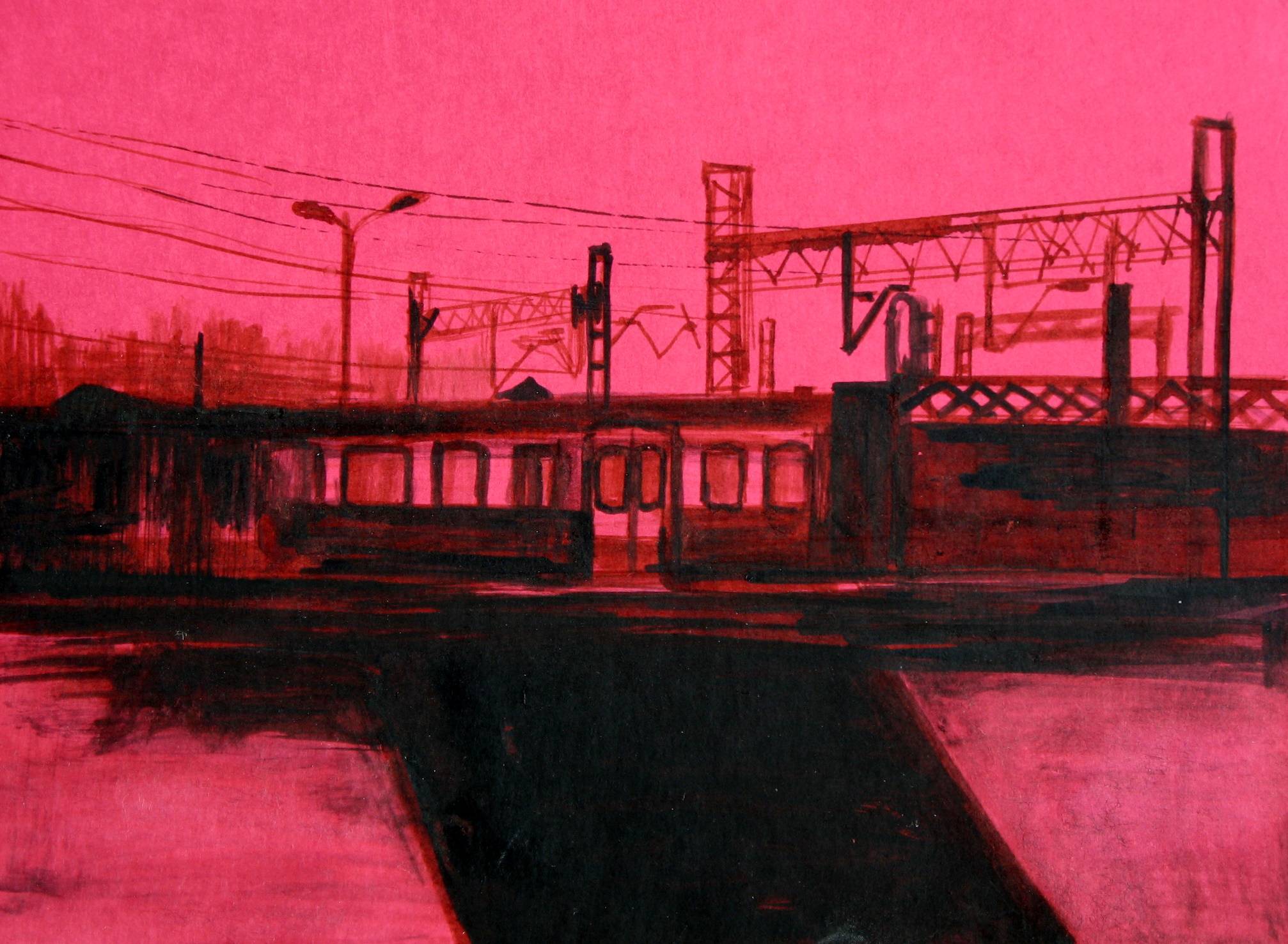 Obraz przedstawia miejską scenerię, w której intensywnie różowe niebo spotyka się z ciemnymi sylwetkami torów kolejowych. Dominują tu odcienie różu i czerni, które tworzą kontrast i nadają całości lekko surrealistycznego wrażenia. Prostokątne, wydłużone kształty wagonów kolejowych i geometryczne linie trakcji tworzą poczucie uporządkowania, jakby każdy element miał swoje miejsce. Taka właśnie tajemnicza atmosfera wciąga nas, niemal wsysa w swoją głębie. Artystą udało się zachować minimalistyczną estetykę, jednocześnie skupiając uwagę na detalach. Użycie tuszu lub akwareli dodaje iluminacji, a zastosowanie techniki ink wash potęguje efekt subtelnego przejścia między kolorami. Jakby cały świat został przepuszczony przez filtr nostalgii. Patrząc na obraz, można poczuć melancholię. Czasem przypomina młodzieńcze chwile spędzone na dworcu, gdy każda nowa podróż była tajemnicą i obietnicą. Switch point życia, gdy każda decyzja zmienia wszystko. Pociągi zawsze symbolizują ruch i zmianę, może nawet ucieczkę. Ale w tym przypadku, zatrzymują się, tworząc chwilę refleksji. „To jak na mojej zabawkowej kolejce!” mogłoby powiedzieć dziecko, zafascynowane widokiem. Dzieło to oddaje miejską samotność, w której znajdujemy poczucie wspólnoty i tęsknotę za nieznanym. Choć wszystko jest nieco abstrakcyjne, czujemy, że jesteśmy częścią tej spokojnej sceny. Coś missed, a jednocześnie pełne, jakby czekało, aż ktoś lub coś uzupełni brakujący element.