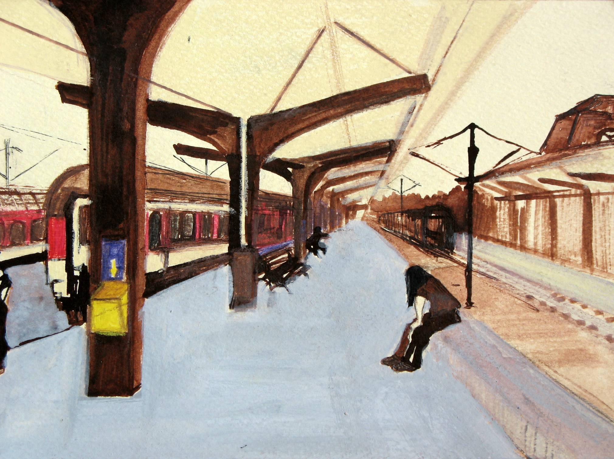 Na obrazie widzimy dworcową peron, pełen ciepłych, przytłumionych kolorów. Dominują brązy i beże, które nadają całemu dziełu nieco nostalgiczną aurę. Linia perspektywy prowadzi nas poprzez przestrzeń, akcentując długie, smukłe formy konstrukcji. Jednym z kluczowych elementów są ludzkie sylwetki, skąpane w cieniu, co dodaje kompozycji tajemniczości. Atmosfera obrazu jest introspektywna. Może przypominać chwile oczekiwania i przejściowości. Styl artystyczny jest lekko impresjonistyczny, malarz posłużył się dynamicznymi pociągnięciami pędzla, co dodaje żywotności. Ten obraz może wzbudzać w odbiorcy uczucia zadumy lub tęsknoty za chwilą ulotną. Patrząc na niego, można poczuć, jakbyśmy sami stali na peronie, czekając na pociąg. Dziecko powiedziałoby: „To jest miejsce, gdzie czekam na pociąg z tatą!”. Coś pięknego, choć nieco melancholijnego, przyciąga wzrok i serce. Osobiście ten obraz wywołuje u mnie uczucie spokoju. Wydaje mi się, że artysta chciał uchwycić moment zatrzymania czasu. A jaki storytelling kryje się za tymi postaciami i jaki jest ich "destination"? Pozwala to widzowi zastanowić się i przemyśleć własne podróże i przystanki życiowe. Obraz zachwyca swą prostotą, a jednocześnie bogactwem wyrazu.