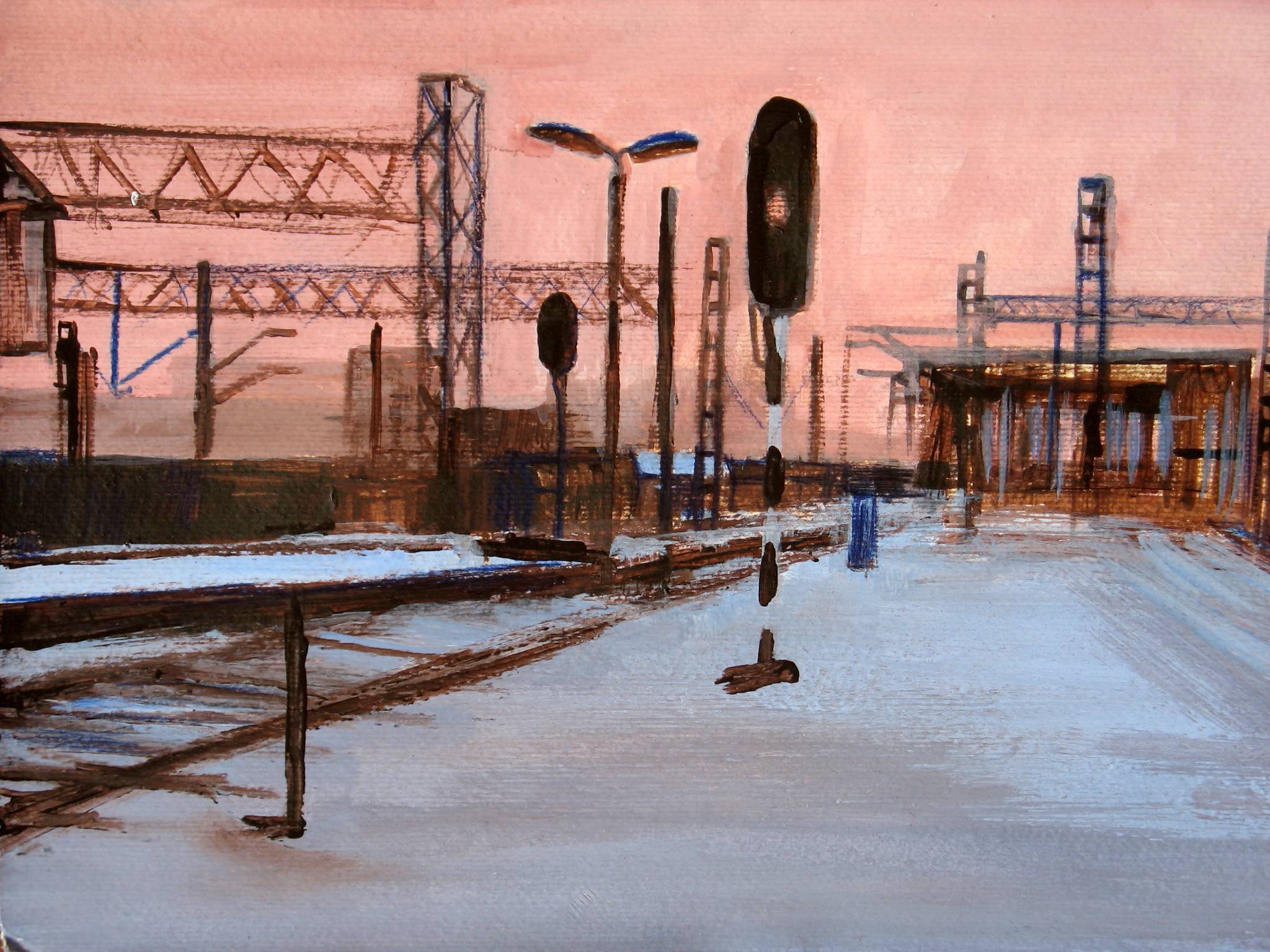 Obraz przedstawia scenę na pustym dworcu kolejowym, utrzymanym w przytłumionych odcieniach różu i błękitu. Dominującym elementem kompozycji są linie i konstrukcje stalowe, które tworzą niemal geometryczną, industrialną mozaikę. Te wieże i semafory, wznoszące się na tle różowego nieba, nadają całości pewien melancholijny nastrój. Rysunek przywodzi na myśl ciche chwile o zmierzchu, kiedy czas zdaje się zwalniać, a mroźne powietrze delikatnie szczypie w policzki. Artysta zastosował technikę akwarelową, co widać w miękkich przejściach kolorystycznych. Ta subtelność, połączona z wyrazistymi, ciemnymi liniami, sprawia, że obraz łączy w sobie delikatność i surowość. Tworzy to przestrzeń pełną kontrastów, gdzie urok tkwi w prostocie i spokojnej kontemplacji. Dla mnie, ten artwork wzbudza poczucie nostalgii. Może przywołuje wspomnienia dawnych podróży, kiedy świat wydawał się nieco inaczej zorganizowany. Jak dziewczynka, powiedziałabym, że tam jest pusto i chce mi się do domu. Duże przestrzenie i brak ludzi mogą budzić poczucie samotności, ale jednocześnie oferują moment na zatrzymanie się i refleksję nad własnym życiem. To jakby znaleźć się na kolei życia, nieco off the beaten path, czekając na następny pociąg ku nieznanemu.