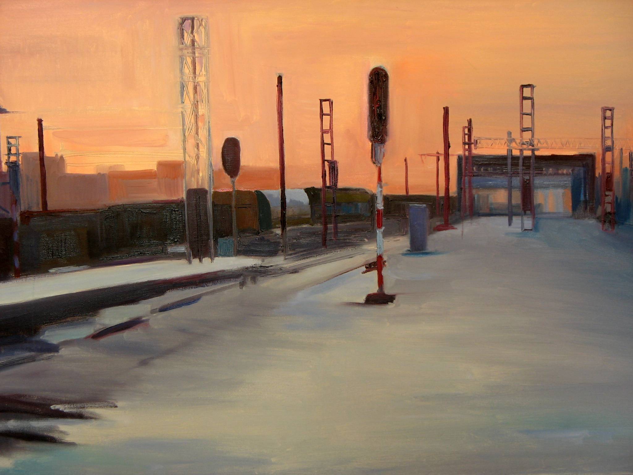 Na obrazie dominuje ciepły pomarańczowy zachód słońca, który delikatnie przenika przez struktury industrialne. Kształty są geometryczne, surowe, z rysunkiem wysokich masztów oraz prostokątnych brył budynków na horyzoncie. Kompozycja jest wyważona, ze skupieniem na centralnym elemencie – pionowo stojącym semaforze. Obraz emanuje spokojem, jednakże można wyczuć pewną tajemniczość, jakby miejsce to opowiadało ciche historie z przeszłości. Artysta zastosował technikę zacierania, blendowania kolorów, dodając obrazowi dreamlike quality. Czuję się zagubiony, patrząc na opustoszałe przestrzenie tego krajobrazu. Może to opowieść o przemijaniu, o tym, jak szybko świat się zmienia. Taki widok przypomina dziecięcą wyobraźnię – ogromne place z nieograniczoną przestrzenią do zabawy i tajemnic. Ktoś mógłby powiedzieć, że to miejsce zasypia po długim dniu pracy. Kolorystyka może też przywodzić na myśl ciepło i nostalgię za minionymi dniami. Obraz może wzbudzać refleksje nad cyklem życia – przemijalnością, ale także nadzieją na nowy dzień za każdym wschodem słońca.