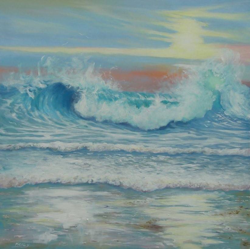 Obraz przedstawia falujące morze, doskonale oddane w subtelnych odcieniach błękitu i zieleni. Kremowa piana fal z niezwykłą precyzją odmalowana na tle pastelowego nieba, które zmienia się od jasnego turkusu do delikatnego różu. Kompozycja jest dynamiczna, jakby falowała razem z wodą, tworząc nieustanny ruch. Nastrój, jaki emanuje z dzieła, przywodzi na myśl letnie dni nad morzem. Czujesz ten lekki wiatr na twarzy? To jak moment zatrzymany w czasie. Artysta z pewnością bawił się techniką impasto, co dodaje tekstury i głębi. Ten styl nadaje obrazowi impresjonistyczny urok, sprawiając, że odbiorca ma ochotę w nim zatopić się. Wpatrujesz się, czujesz spokój, ale i pewną ekscytację. Może to nostalgia? A może tylko ucieczka od codzienności. Jedno jest pewne: ten obraz ma w sobie coś magicznego, taką "vibe", która przyciąga. Patrząc na to dzieło, można poczuć dreszczyk emocji i zobaczyć w nim odbicie własnych marzeń o podróżach i przygodach. Żeglujesz na falach wyobraźni, a światła refleksów mienią się na powierzchni wody. Nawet dzieci by to pokochały. Wow, ale fala. To proste, ale pełne emocji ujęcie, które zachwyci każdą wrażliwą duszę.