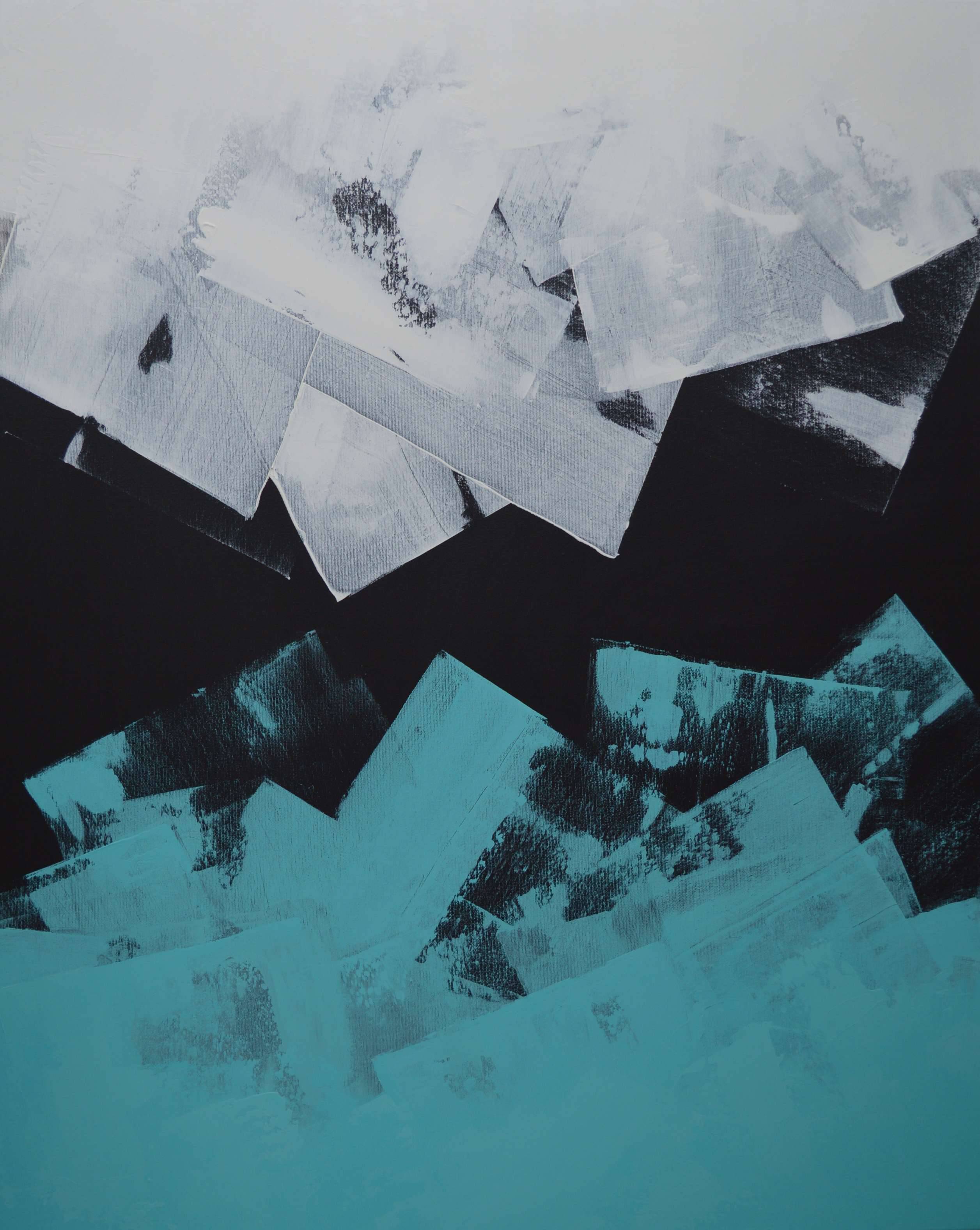 Na obrazie dominują zimne odcienie turkusu, bieli i czerni, tworząc hipnotyzującą kompozycję złożoną z geometrycznych form. Kolory przeplatają się, tworząc warstwy, które przypominają obłoki albo płyty lodowe, które można by spotkać w krainie lodu. Nastrój obrazu jest dość surowy i tajemniczy, ale jednocześnie odświeżający, jak poranny chłód po deszczu. Styl artysty przypomina ekspresjonizm abstrakcyjny z nietypową, swobodną techniką, jakby ktoś położył farbę paletą. Kiedy patrzę na to dzieło, odczuwam dziwną ochotę na zimowy spacer. Boże, jakby tak było można nacieszyć się chwilą! Tu forma goni formę, bez końca. Dzieciak powiedziałby: "To wygląda jak śnieżne góry!". Obraz wywołuje emocję spokoju, równowagi i pewnego dystansu od zgiełku codzienności. Czerń w tle przydaje całości głębi, kontrastując z jasnymi barwami, jakby mówiła: Hey, spójrz tu, nie przegap mnie. To dzieło to prawdziwy statement, który każe zatrzymać się na moment, zastanowić, jakie tajemnice kryją się pod powierzchnią tej zimowej symfonii.