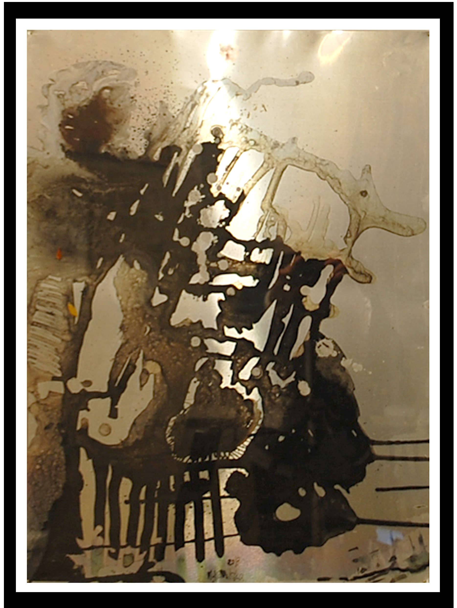 'Sprawiają nowe. Naświetlenie 2' z cyklu 'Kwartety'. Tusz na naświetlonej płycie introligatorskiej. Sygnowany przy dolnej krawędzi M.M. Kabulska 2018. Oprawiony w czarną, drewnianą ramę, plexi. Obraz powstał pod wpływem podświadomej intencji stworzenia nowych form muzycznych. Postać, jako czarna materia ciała idealnie czarnego wydobywa i zapisuje czynniki piękna w kształtującej się głowie . Zamysł 8. liniowego zapisu muzycznego.