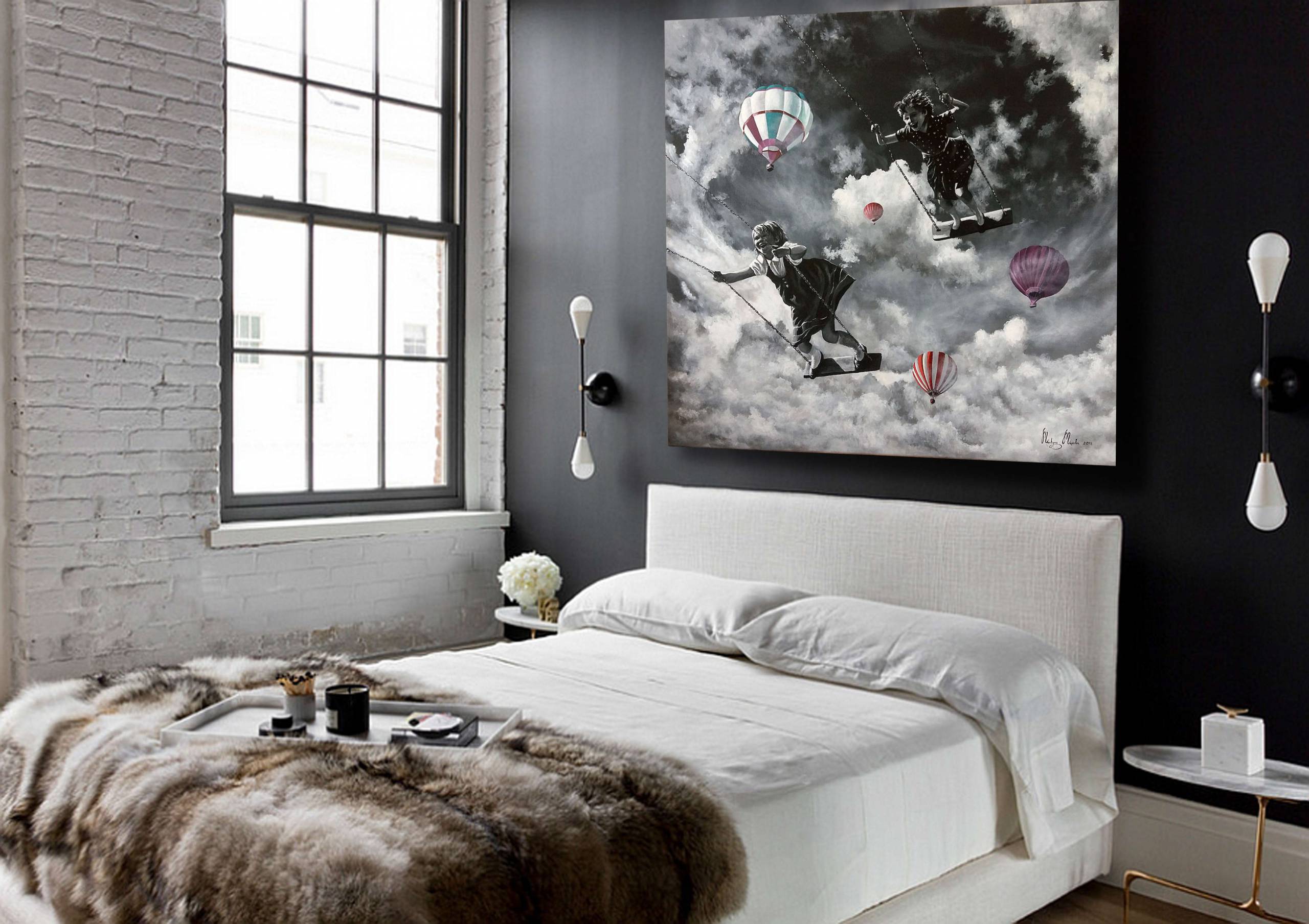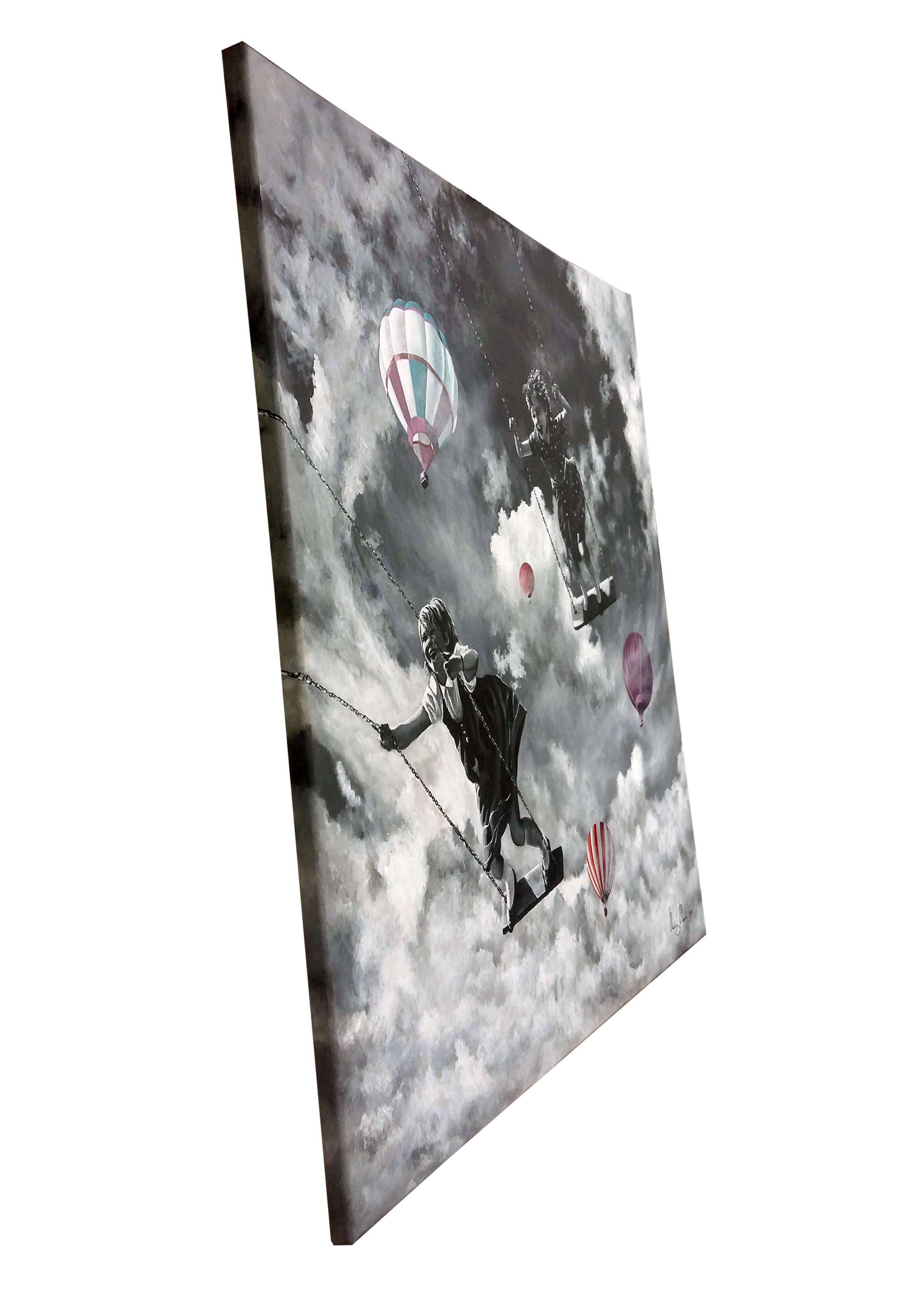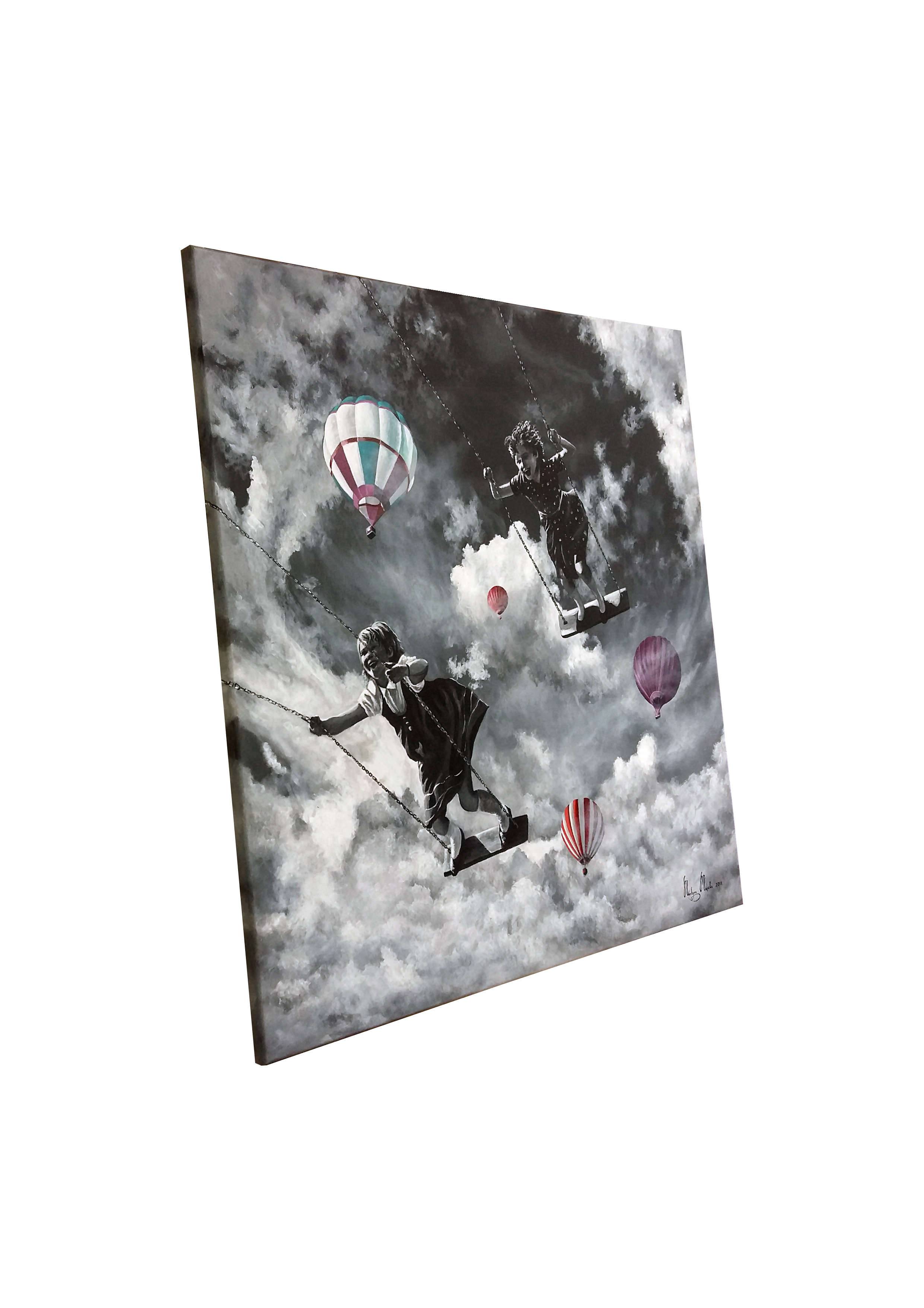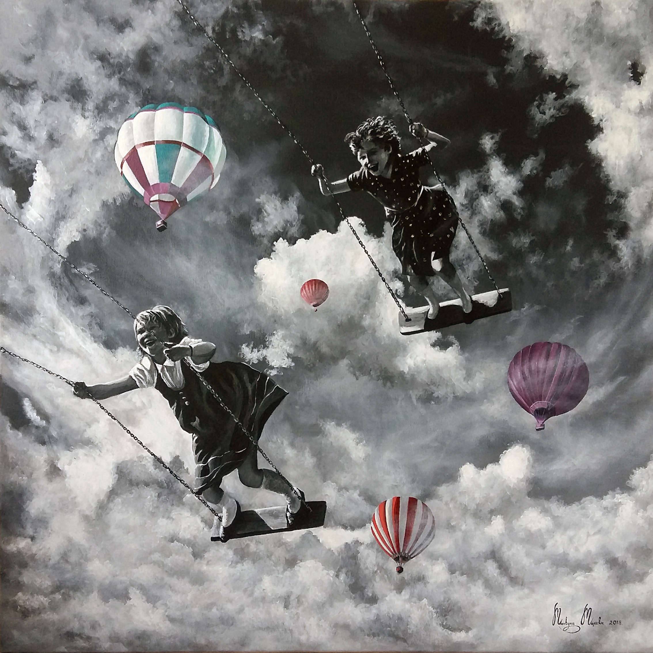 Na obrazie widać dwie dziewczynki huśtające się w obłokach na tle nieba pokrytego puchatymi chmurami. Czarno-biała kolorystyka postaci kontrastuje z kolorowymi balonami unoszącymi się obok, co przyciąga spojrzenie i dodaje dynamiki. To takie magiczne, jakby dziewczynki naprawdę szybowały w przestworzach. Artysta wykorzystał technikę mieszania rzeczywistości z marzeniem, tworząc surrealistyczną kompozycję, która emanuje nostalgią i dziecięcą beztroską. Patrząc na nie, można poczuć przypływ wolności, jakby samemu można było wzlecieć. Atmosfera na obrazie jest radosna i pełna cudów, przypominająca o nieskrępowanej wyobraźni dziecka. Poczucie ulotności i swobody jest wzmocnione przez delikatną grę światła i cieni. Dzieło skłania do refleksji nad dzieciństwem i marzeniami. Mieszając prostą narrację z głębszym przesłaniem, obraz wywołuje szeroki wachlarz emocji. Wow, te balony są jak z bajki! Artysta stworzył intrygujący świat, gdzie każda chwila staje się "magical".