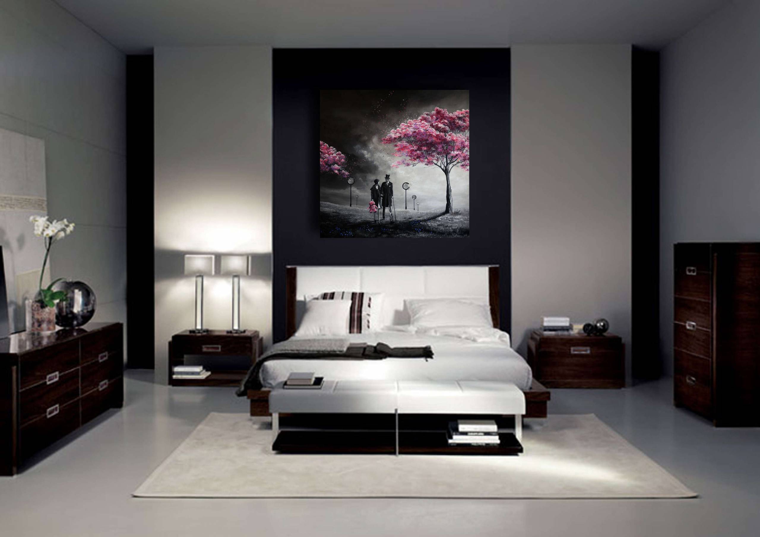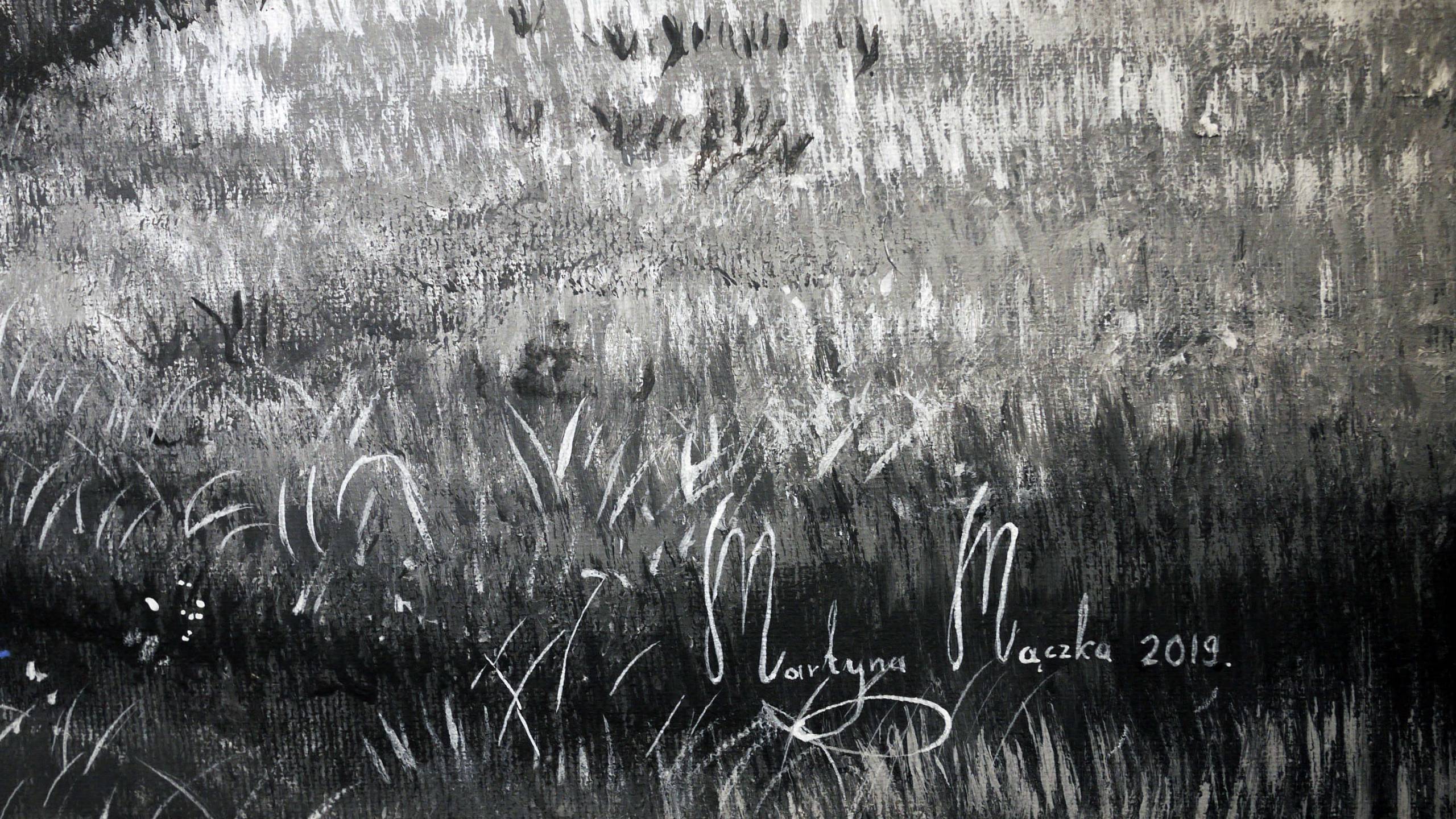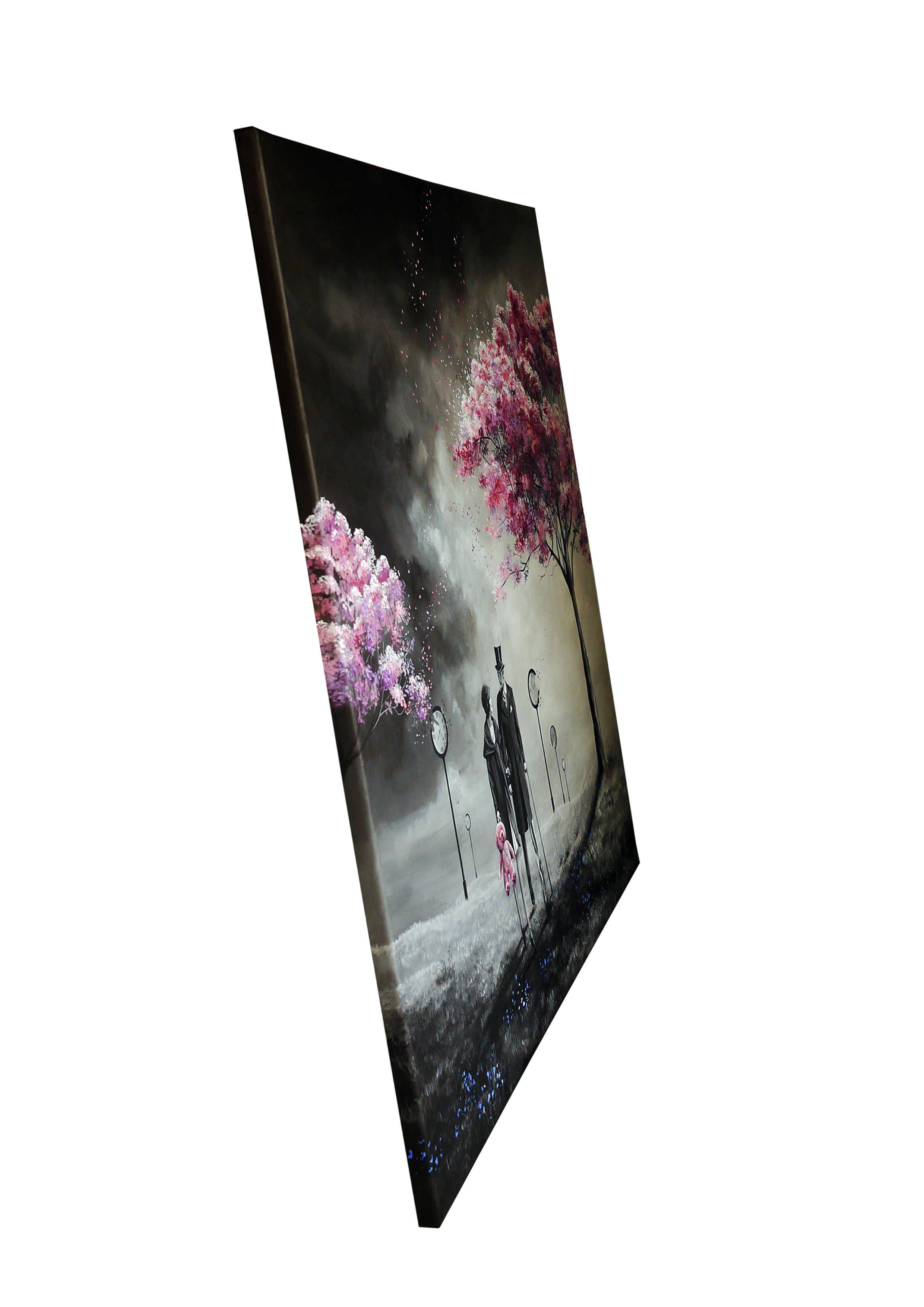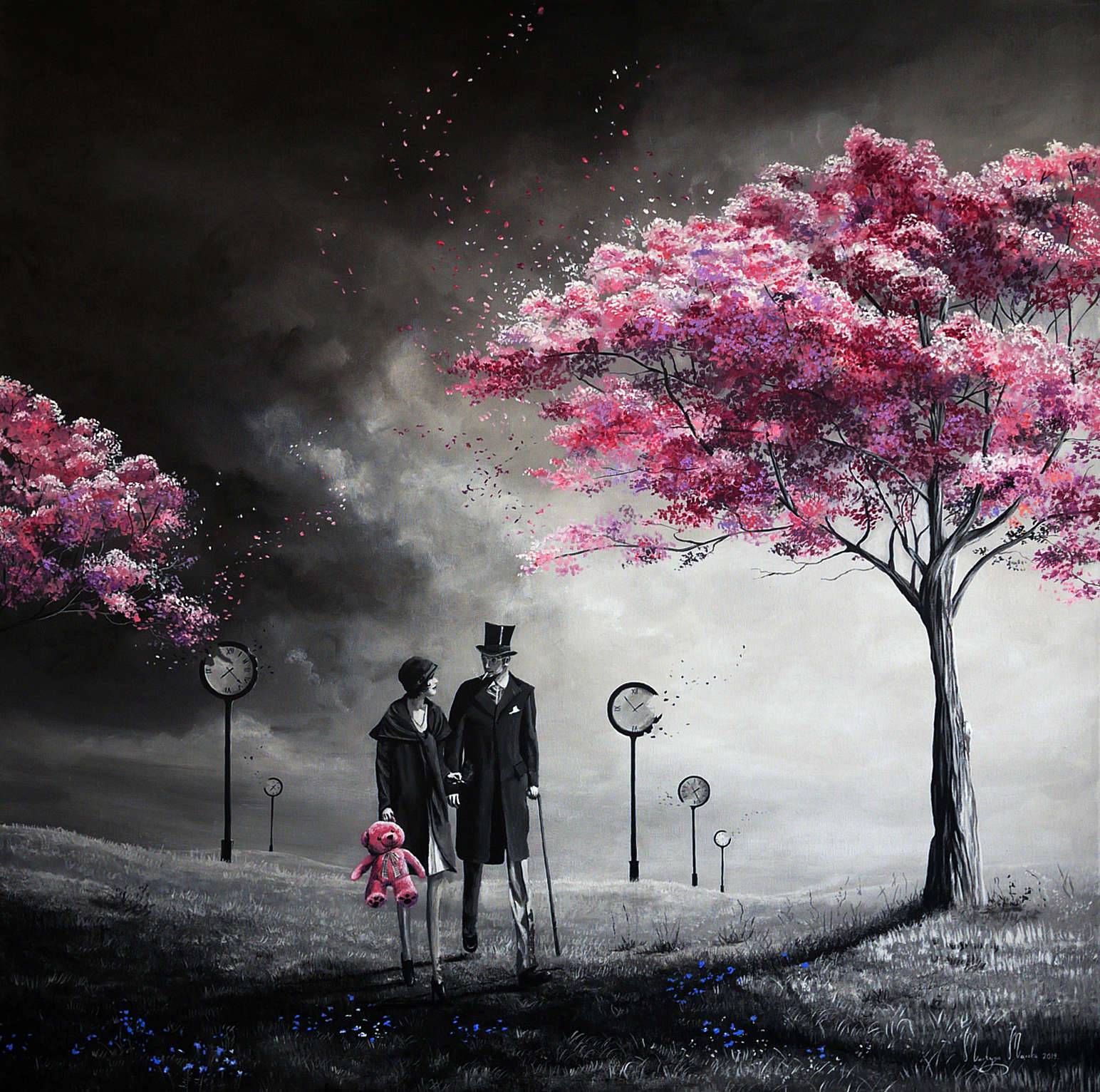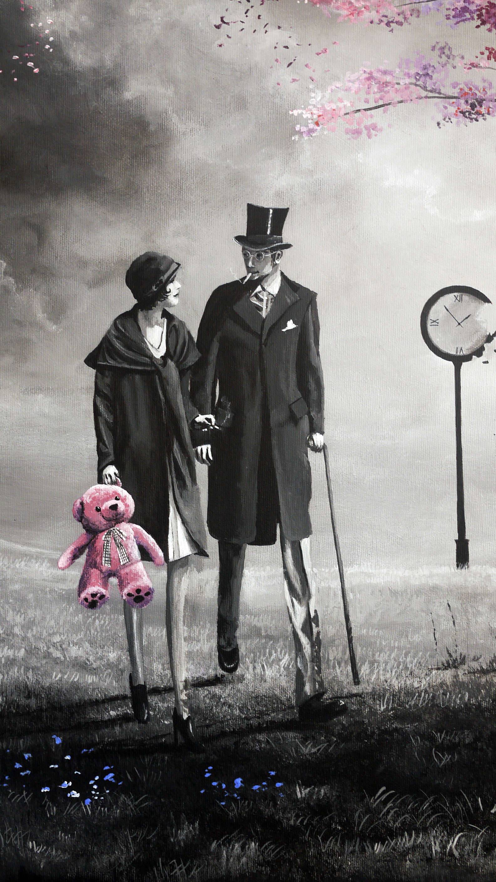 Obraz przedstawia niezwykłą scenę, która wciąga niczym magnes. Dominują tu kontrasty: czarno-biała sceneria ożywiona jaskrawym różem kwiatów na drzewach. Pośród tego pejzażu, para ubrana w eleganckie, wręcz wiktoriańskie stroje, przemierza krajobraz. Ona trzyma różowego misia, co dodaje nutki dziecięcego uroku w tej onirycznej scenie. W tle widoczny jest rząd zegarów, które zdają się zatrzymać w czasie. Wszystko tu przypomina mi trochę jak z bajki, ale takiej tajemniczej. Atmosfera jest dla mnie niezwykle melancholijna, pełna zadumy. Pomimo szarości, różowe akcenty symbolizują jakąś subtelną nadzieję i marzenie. Artysta wykorzystuje technikę połączenia kontrastów, umiejętnie łącząc elementy surrealizmu i klasycyzmu. Nastrój jest niepokojący, a jednocześnie fascynujący. Spoglądając na ten obraz, czuję jak czas zwalnia, a ja zatapiam się w jego jeg magic world. To dzieło może wywołać różnorodne emocje. Dla mnie jest jak szept przeszłości, który próbuje coś powiedzieć, ale słowa giną w oddali. Dziecko powiedziałoby: "Patrz, zegary są jak gigantyczne lizaki!". Takie małe rzeczy przypominają mi, jak wiele znaczeń może nieść jeden obraz. Czy to nostalgia, czy może tęsknota za tym, co nieuchwytne? Takie pytania pozostają bez odpowiedzi, a obraz zaprasza do refleksji.