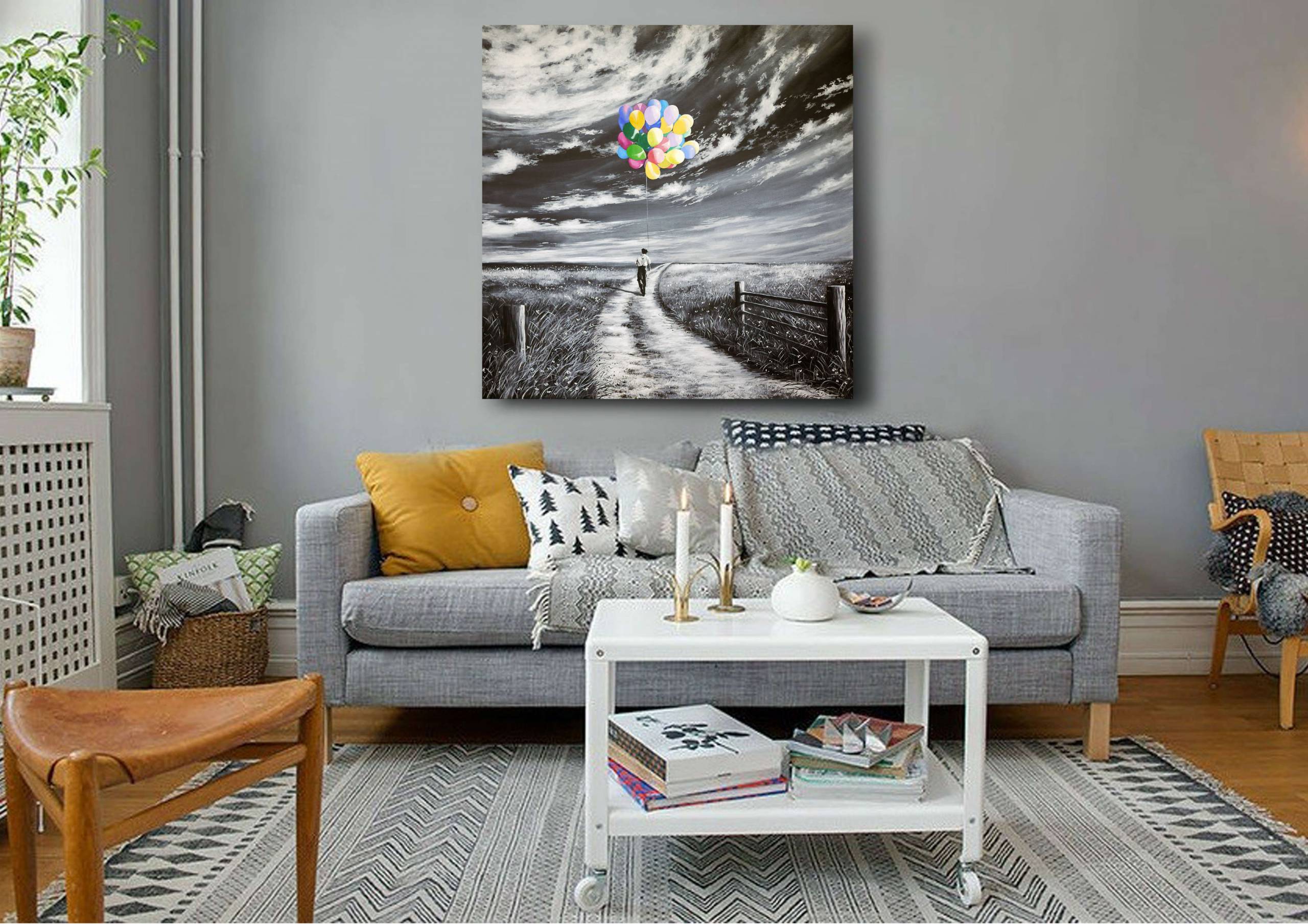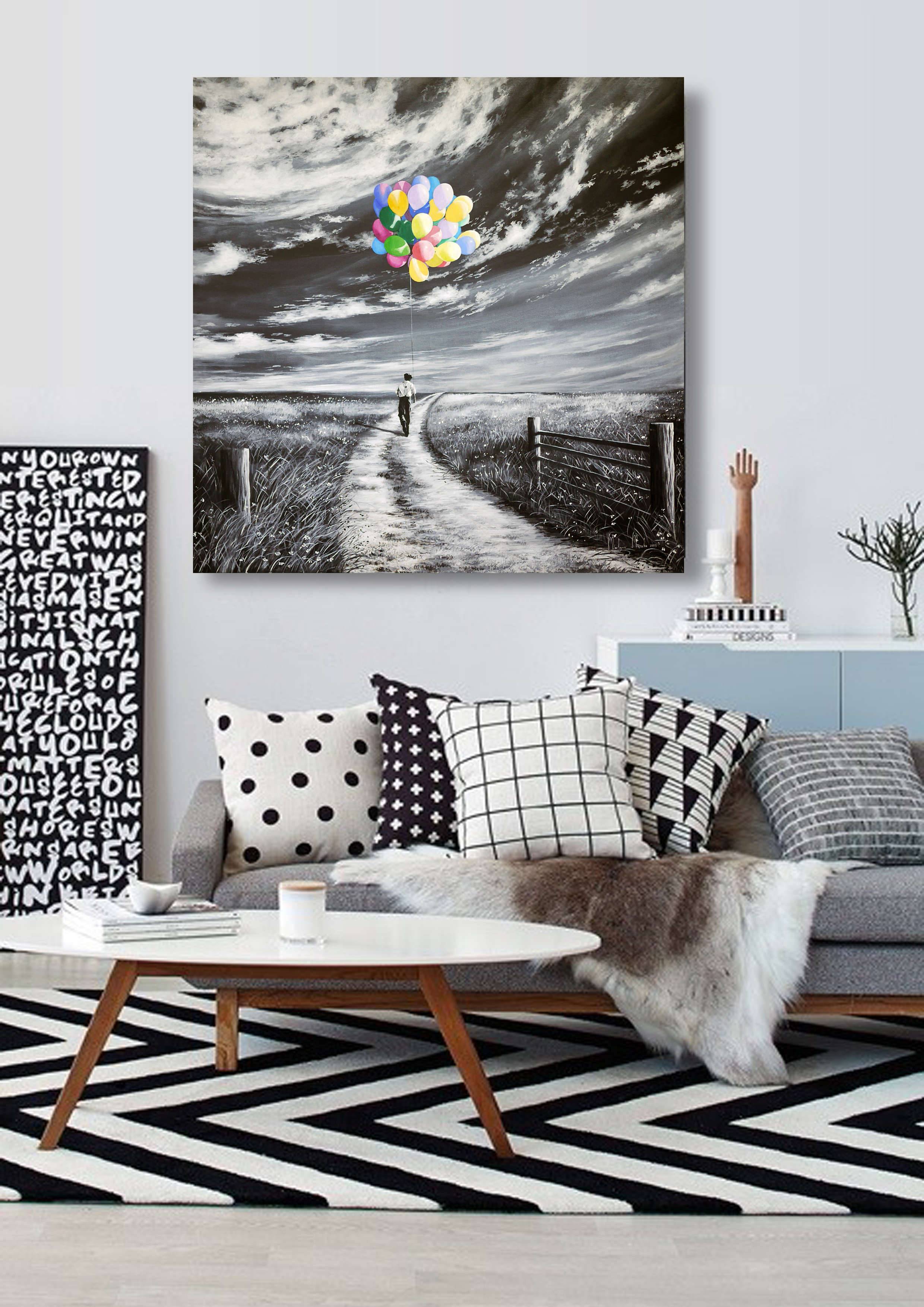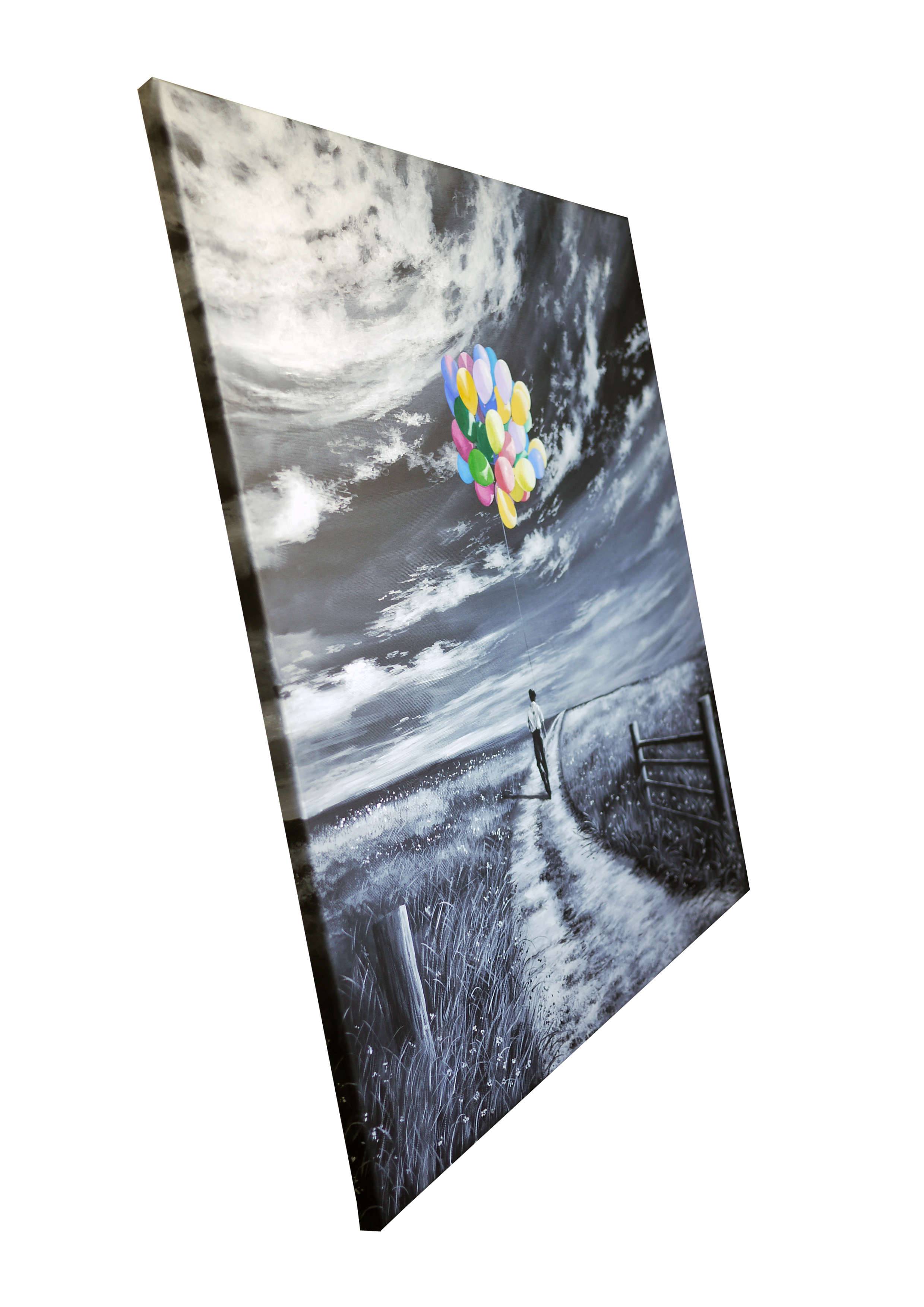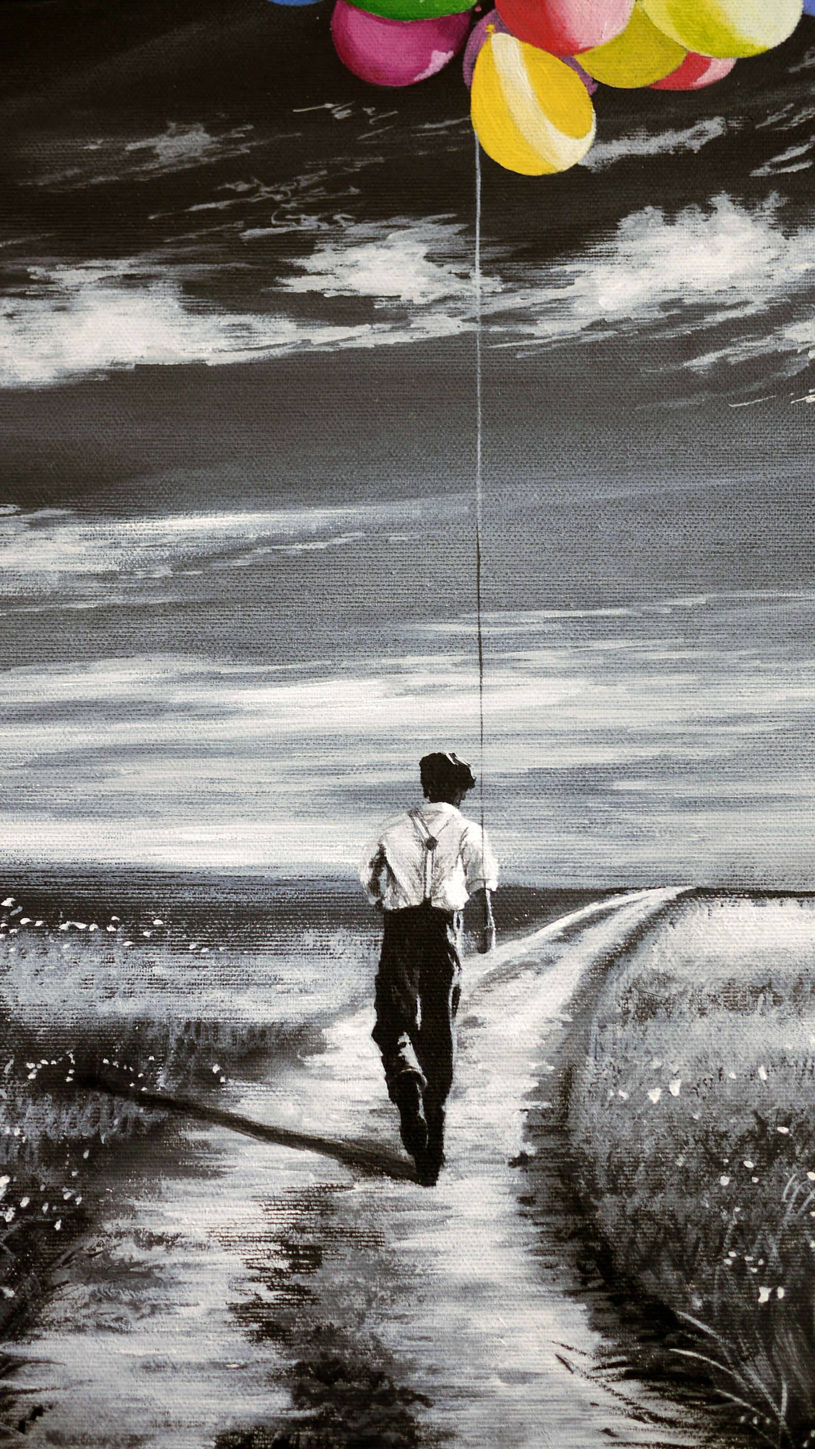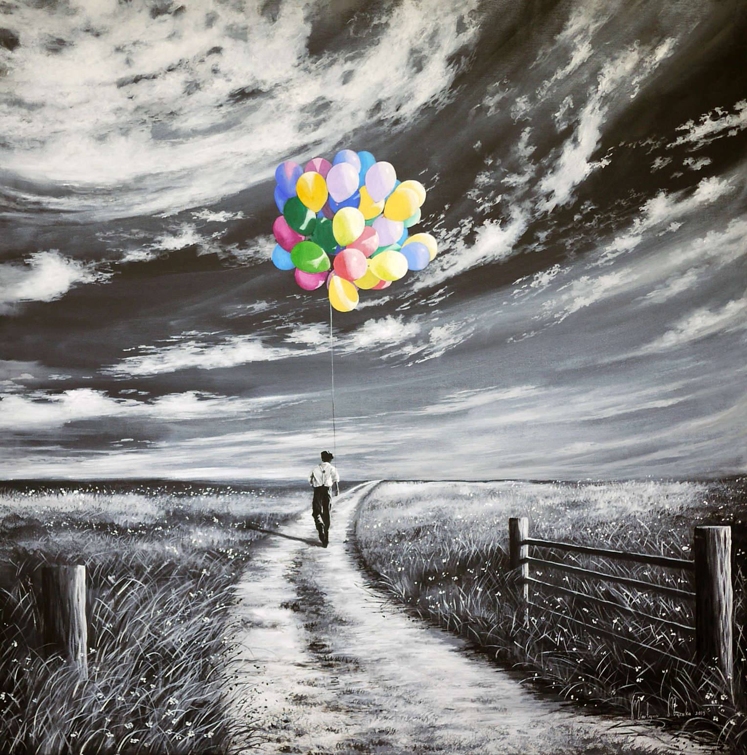 Na obrazie widzimy osobę zmierzającą samotnie po krętej ścieżce, trzymającą pęk kolorowych balonów. Reszta obrazu jest utrzymana w monochromatycznych odcieniach szarości, co nadaje mu nostalgiczną, niemalże melancholijną atmosferę. Tylko balony, pełne jaskrawych barw, wyróżniają się z szarego tła. Artysta zastosował dynamiczne pociągnięcia pędzla, by oddać ruch chmur na niebie. Ten kontrast między kolorami a szarością tworzy efekt wyobraźni i nadziei w świecie pełnym rutyny. Balony symbolizują marzenia i dziecięce pragnienia o unoszeniu się w stronę nieba. To jakby próbował powiedzieć: „Nigdy nie przestawaj marzyć!” Czuję, jakby to było dzieło o ucieczce do innego świata. Styl artystyczny jest swobodny, nieco impresjonistyczny, z naciskiem na emocje i ekspresję. Jako 7-latek powiedziałbym: „Balony są szczęśliwe i chcą latać!” Czy nie wydaje się wam, że te balony są jak 'freedom' dla duszy? Widok ten może wywoływać poczucie tęsknoty, ale i nadziei na przyszłość. Obraz skłania do refleksji nad samotnymi wędrówkami w poszukiwaniu czegokolwiek, co to your heart desires. Można poczuć dreszcz na plecach patrząc, jak postać kroczy w stronę nieznanego. Naprawdę, fascynujące dzieło pełne ukrytych znaczeń, które każdy odkryje z osobna.
