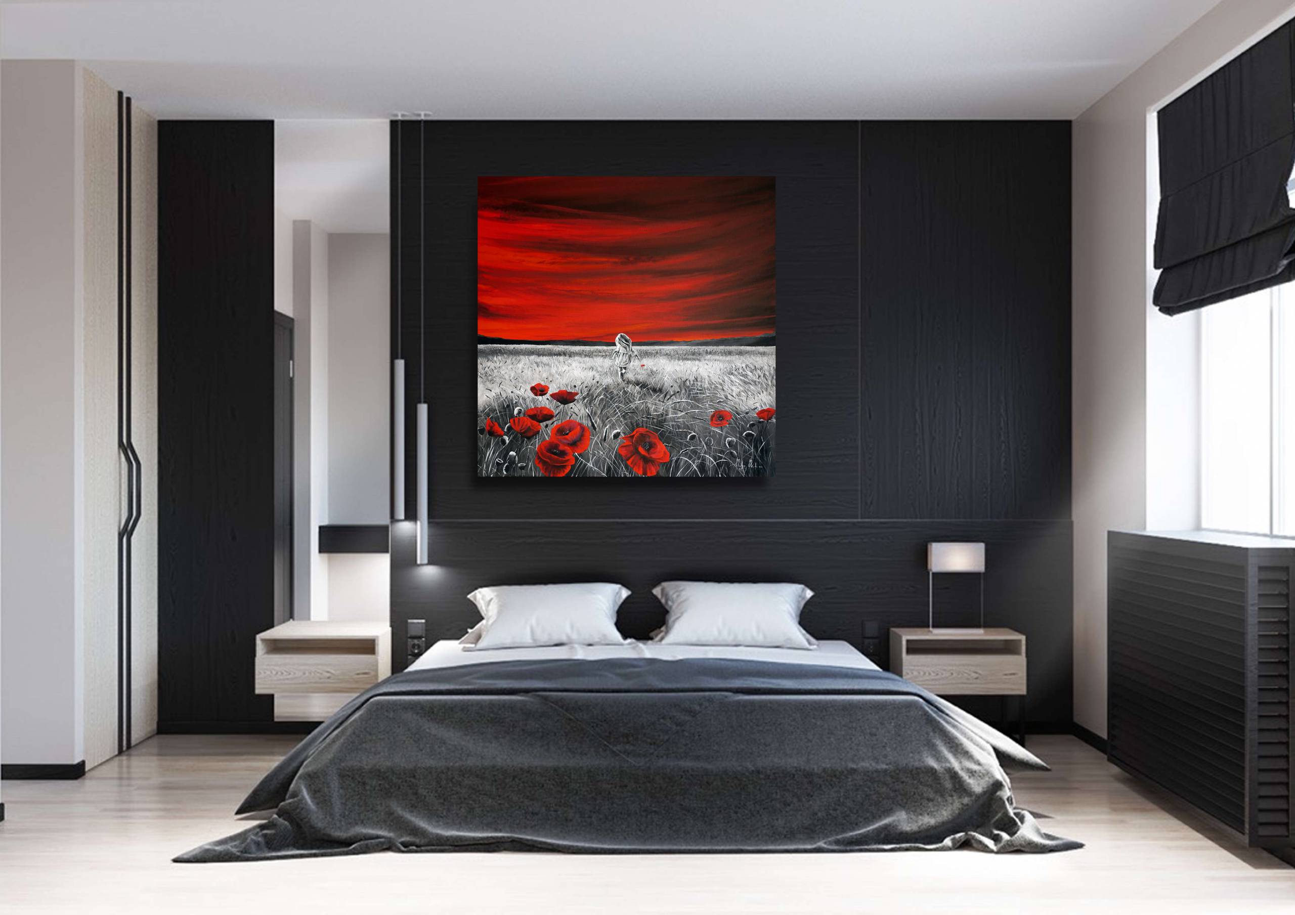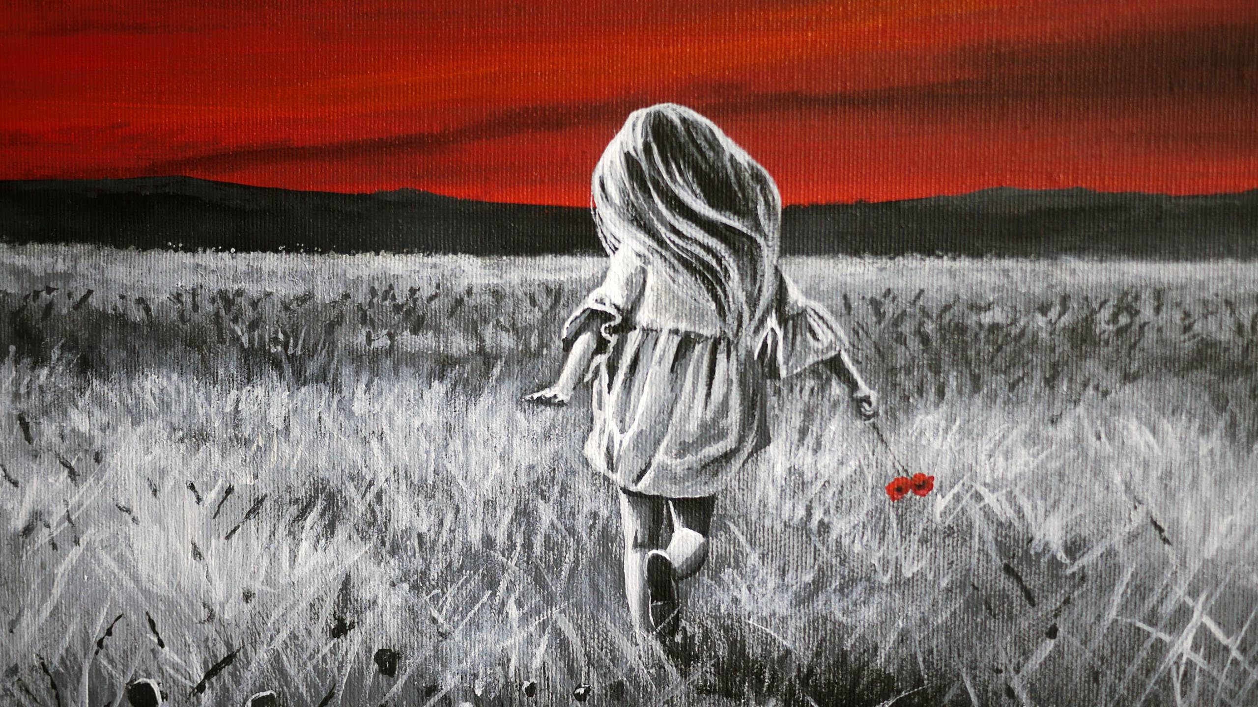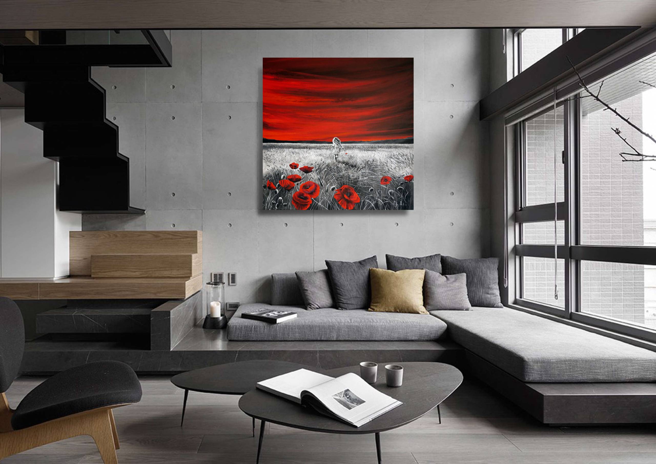 Obraz ujmuje pięknem i kontrastem kolorów. Dominują intensywne czerwienie nieba, które przywodzi na myśl niepokój i dramatyzm. Pole maków, czarno-białe, tworzy niesamowite tło dla jaskrawych czerwonych kwiatów, które wybijają się na pierwszy plan. W centrum widzimy dziewczynkę, która biegnie przez pole. Jej sylwetka jest pogrążona w monochromatycznej tonacji, co dodaje jej tajemniczości. Atmosfera dzieła jest pełna napięcia, ale i piękna. Czujemy jakby świat stanął w miejscu, jakby czas się zatrzymał. Artysta wykorzystuje technikę mieszania kolorów, łącząc surowość czerni i bieli z dramatycznym czerwienią, tworząc emocjonalny kontrast. To właśnie ten "punch" kolorystyczny sprawia, że obraz zostaje w pamięci. Czy to nie jest magiczne? Dla mnie, to scena zatrzymanej chwili. A dziecko na obrazie mówi "heja, biegnę do mamusi po kwiatek!". Te małe maki zdają się szeptać opowieści o dawnych czasach i marzeniach. Obraz może wywoływać mnóstwo emocji: od melancholii i spokoju po ciekawość i zachwyt. Trochę strach, ale tak w pozytywny sposób. Biorąc pod uwagę całość, to sztuka, która wywołuje w nas chęć zatrzymania się na chwilę i chwil refleksji. Amazing.