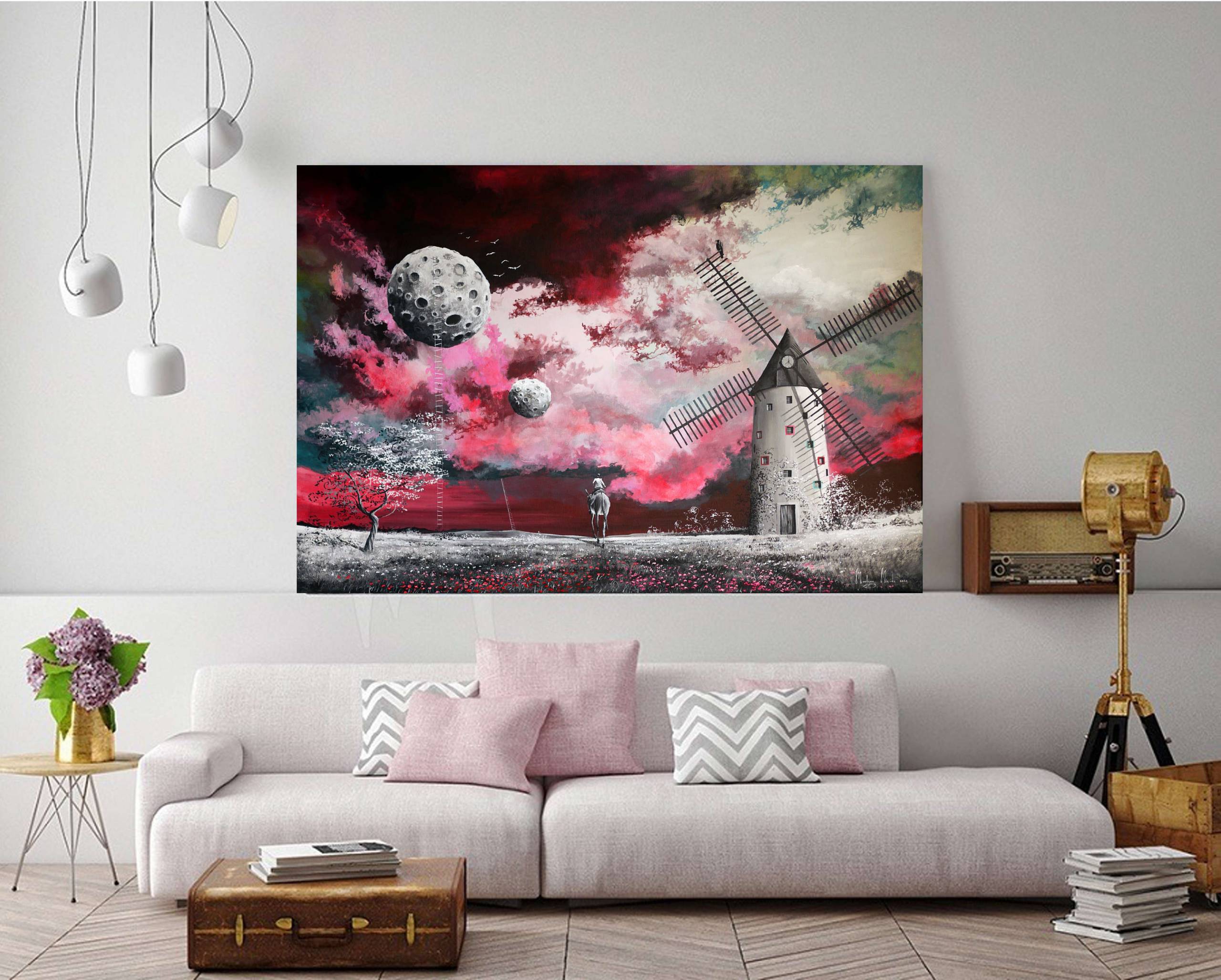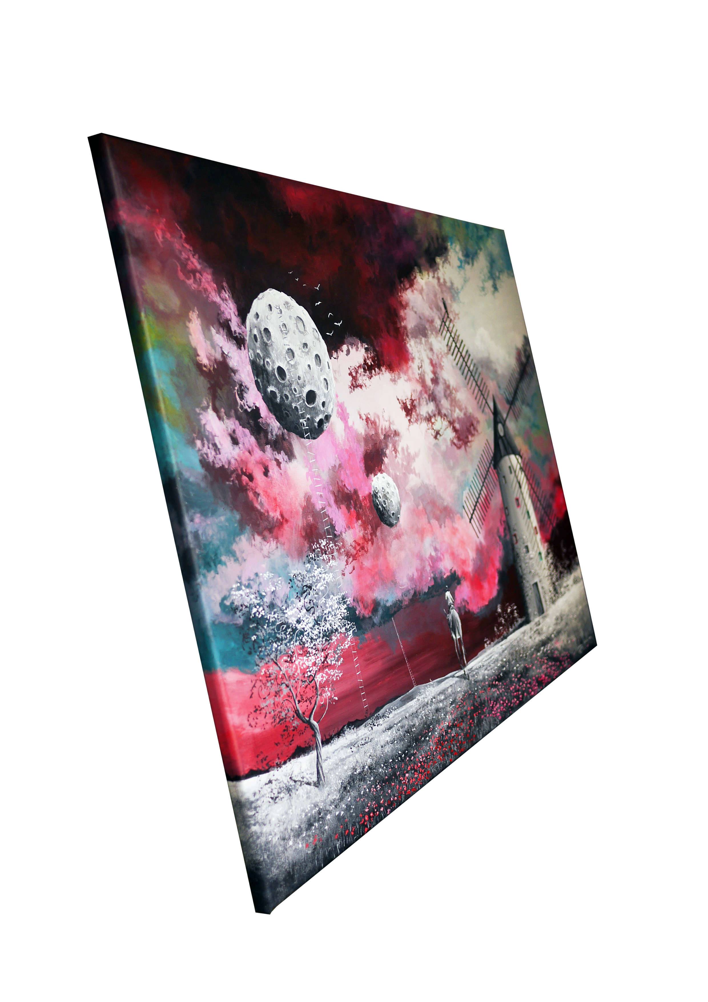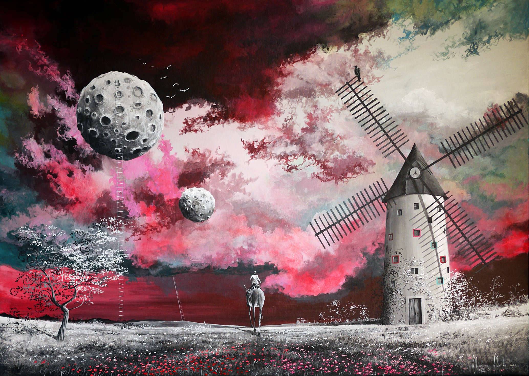 Obraz emanuje surrealistycznym klimatem jak z bajki, w którym rzeczywistość miesza się z fantazją. Dominują intensywne barwy czerwieni i różu, które tworzą tło jak z innego świata. Na pierwszym planie widzimy staromodny wiatrak z czarnymi skrzydłami, które wydają się przecinać niebo. Obok niego samotny jeździec na koniu, zmierzający w kierunku dziwnego nieba, pełnego dziurawych księżyców przypominających ser szwajcarski. Kompozycja obrazu jest dynamiczna, z jednej strony nostalgiczna, z drugiej wręcz kosmiczna. Technika, którą posłużył się artysta, to mieszanka realistycznych detali z abstrakcyjnymi elementami. Obraz budzi emocje niepokoju, ale jednocześnie zachwyca, jakby mówił "czyż nie jest to dreamlike?" Wywołuje refleksje na temat marzeń i tego, co mogłoby być poza zasięgiem naszej rzeczywistości. Wzrok przyciąga drzewo z kwiatami na białej łące, które kontrastują z ciemnymi, burzowymi chmurami. Styl jest eklektyczny, łącząc tradycję z nowoczesnością. Obraz może być interpretowany jako metafora podróży w nieznane, odkrywanie nowych światów we własnej wyobraźni. Ma się wrażenie, że podróż, którą obrazuje, jest jednocześnie wewnętrzną odyseją. Może to być także historia o marzeniach i szaleńczej znajomości z niepohamowaną wyobraźnią. Kiedy patrzę na ten obraz, czuję, jakby czas zatrzymał się na moment, pozwalając mi zanurzyć się w tej nierzeczywistej krainie pełnej magii.