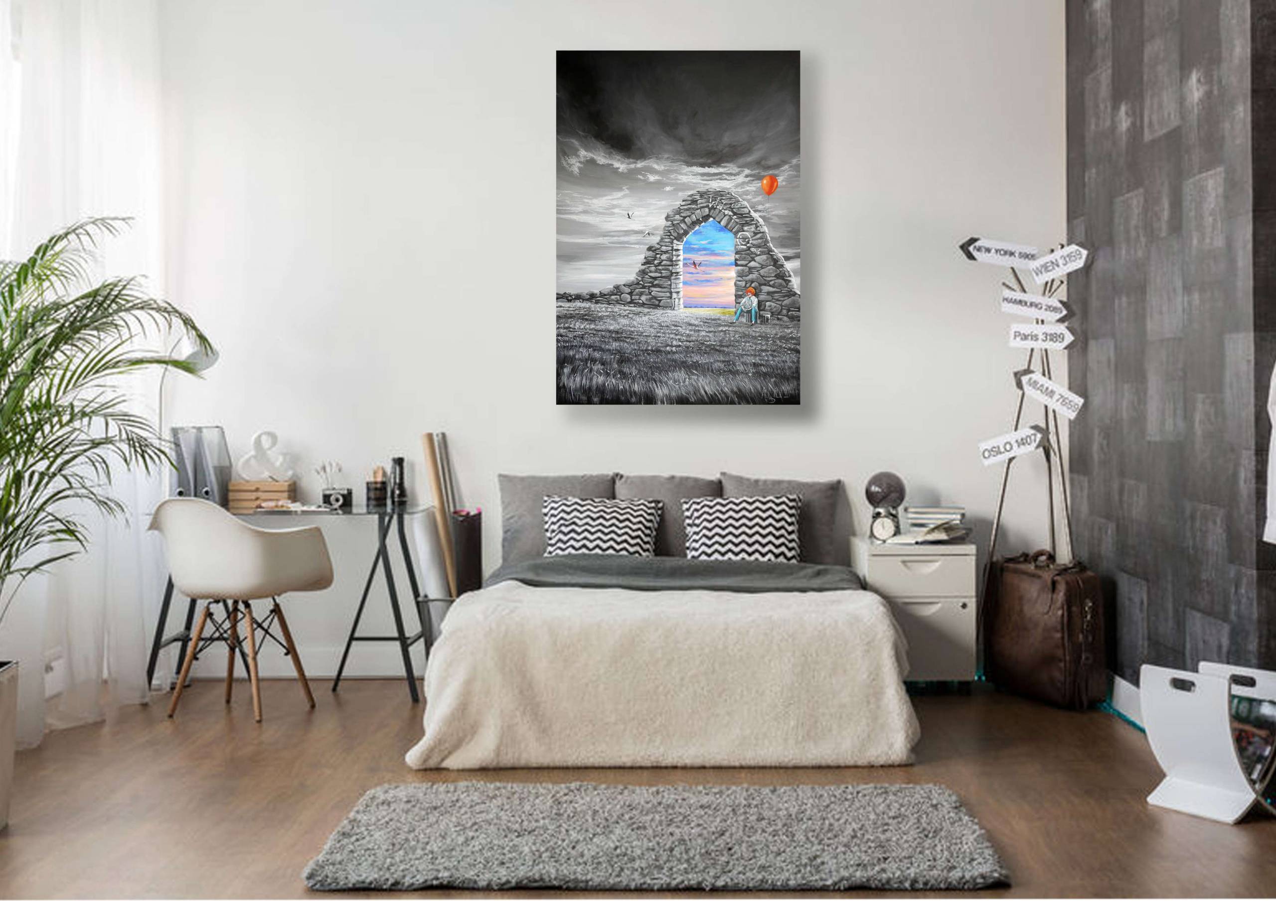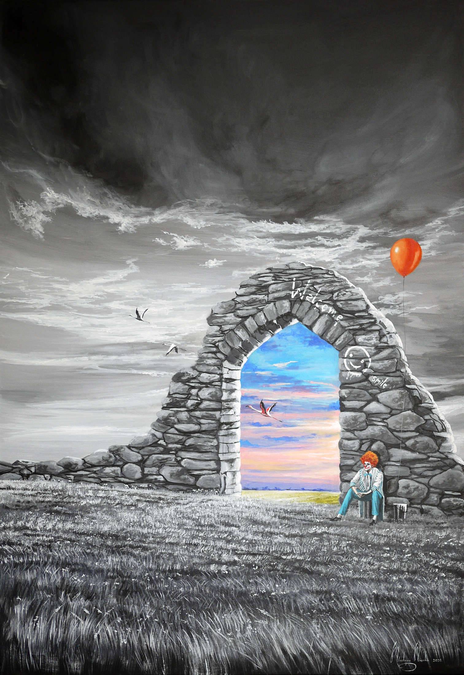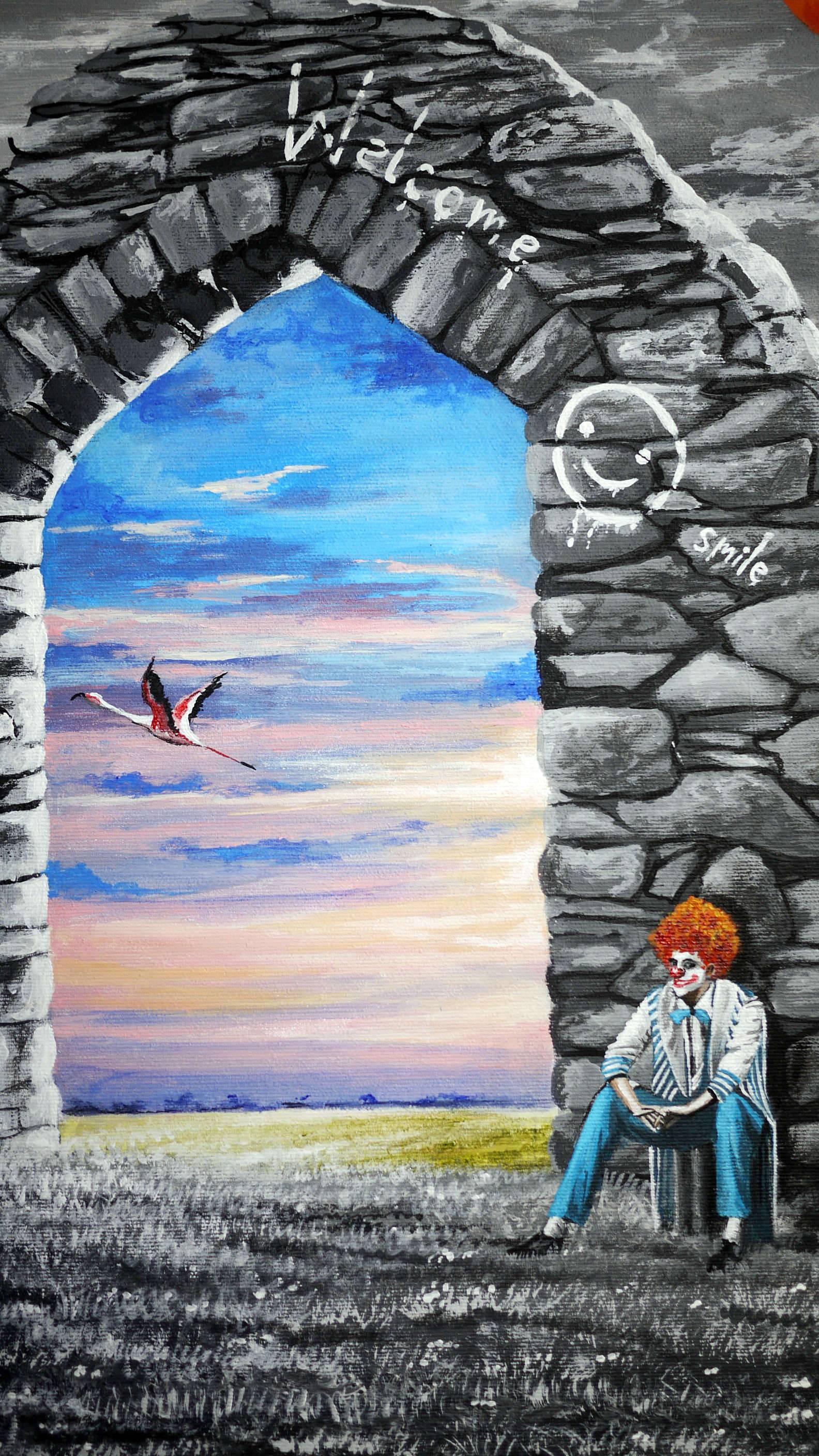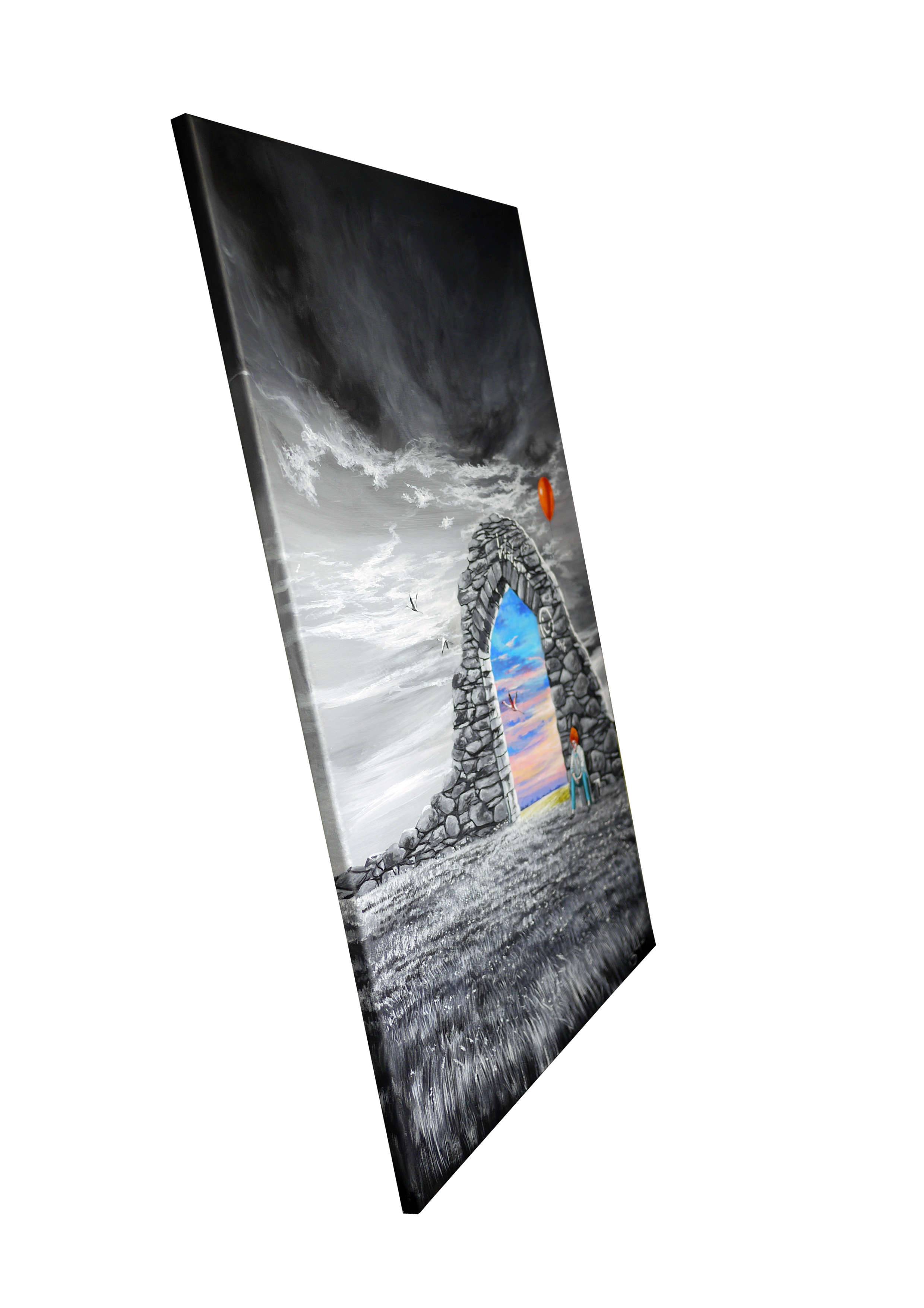 Na pierwszym planie obrazu widać mroczny krajobraz z monumentalnym kamiennym łukiem, który jest jak portal do innego świata. Po jednej stronie przeważają odcienie szarości, tworząc pochmurną atmosferę, podczas gdy przez łuk widać kolorowy, idylliczny pejzaż w jasnych odcieniach różu, niebieskiego i żółtego. Balonik w jaskrawej czerwieni zdaje się unosić nad postacią siedzącą obok łuku, dodając nieoczekiwany akcent w pośród ponurych tonów. Obraz emanuje poczuciem tęsknoty i nadziei. Szarość wokół doskonale kontrastuje z kolorami za łukiem, oddając silne wrażenie przejścia z rzeczywistości w marzenia. Atmosfera jest melancholijna, ale zarazem obiecująca. Technika malarska z wyraźnymi pociągnięciami pędzla i subtelnym użyciem światła przypomina stylem surrealistyczne dzieła. Widz może poczuć dreszcz ekscytacji, z odrobiną nostalgii, widząc obraz. Ten czerwony balonik przyciąga uwagę, jakby wołając: „hej, uwolnij swoją wyobraźnię”. Jakby portal był zaproszeniem do odkrywania nieznanego. To jak wiersz pełen zagadek, który mówi różne rzeczy różnym ludziom. Dla mnie osobiście, ten obraz jest jak marzenie o ucieczce do lepszego świata. Taki prawdziwy "gateway to happiness". 7-letnie dziecko mogłoby powiedzieć: „Wow, to jak drzwi do bajki!”. Cudny, jakby inny świat jest tuż za rogiem, wystarczy tylko przekroczyć... ten próg.