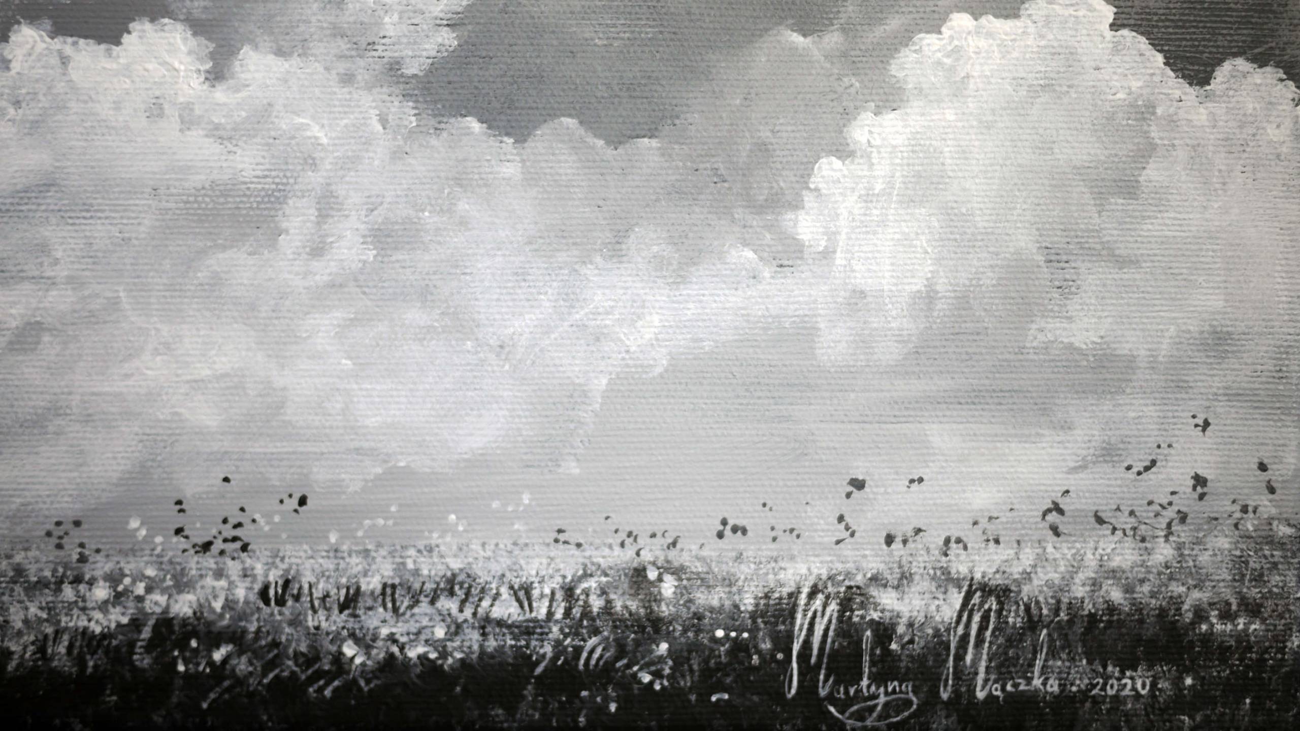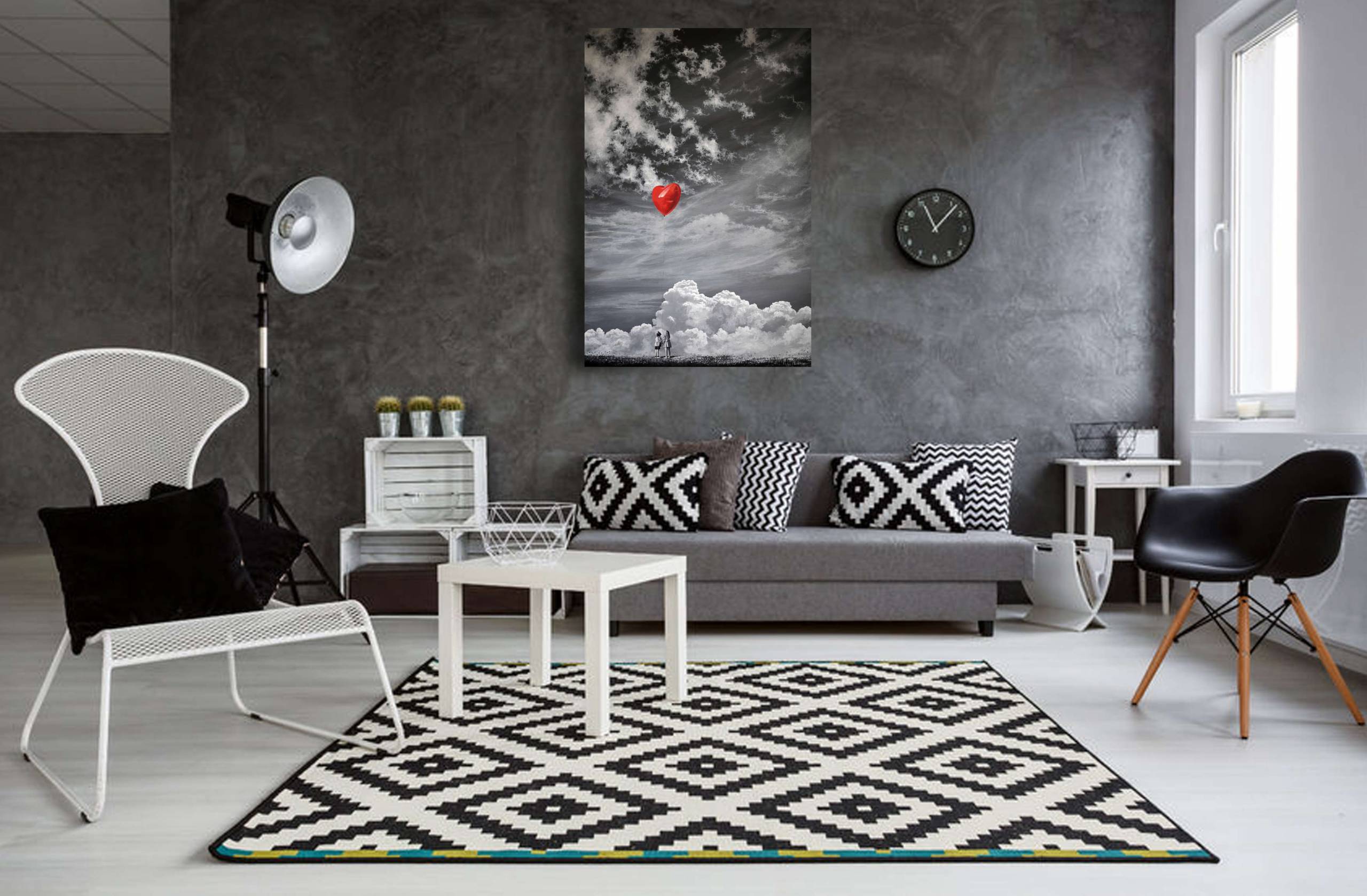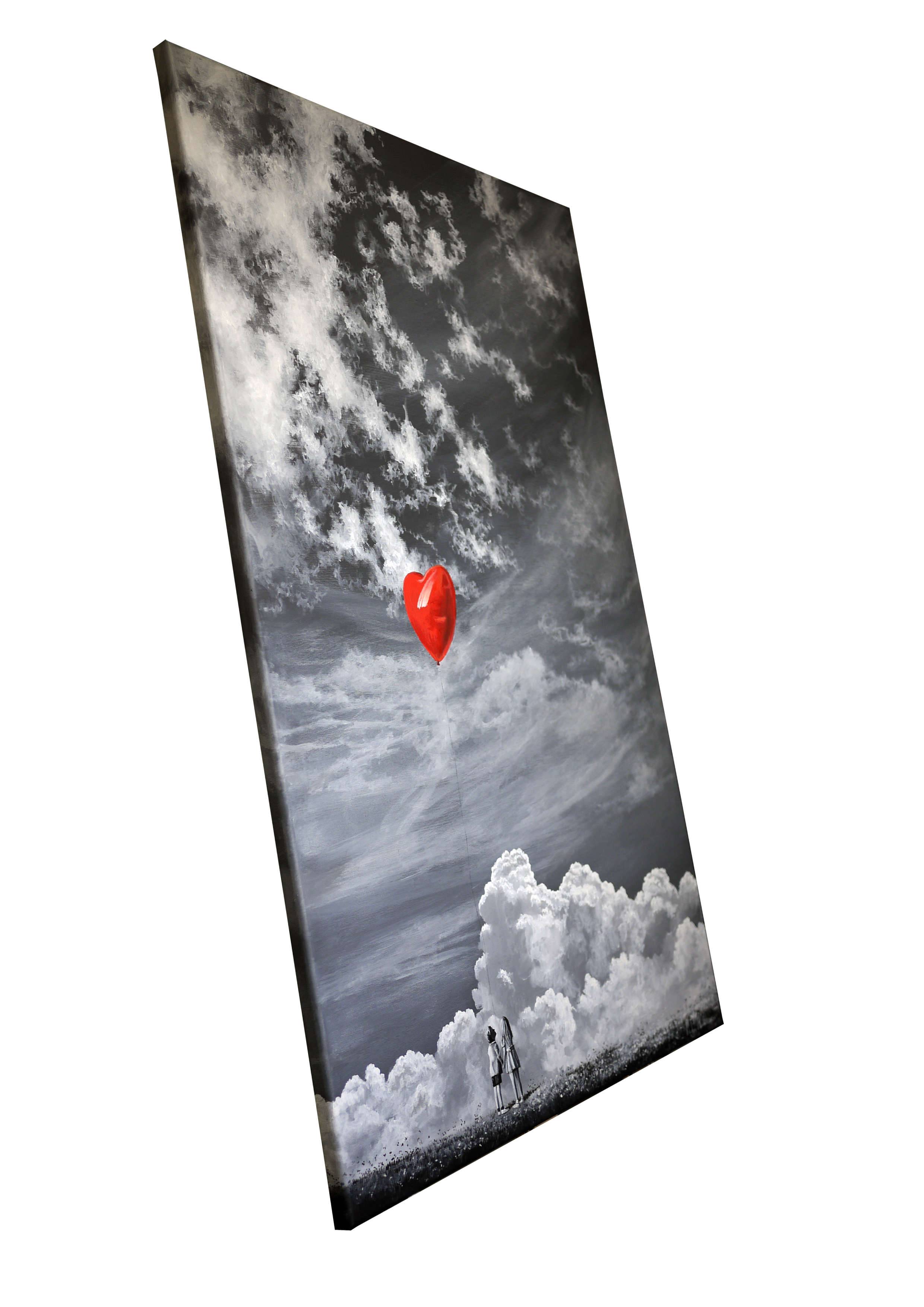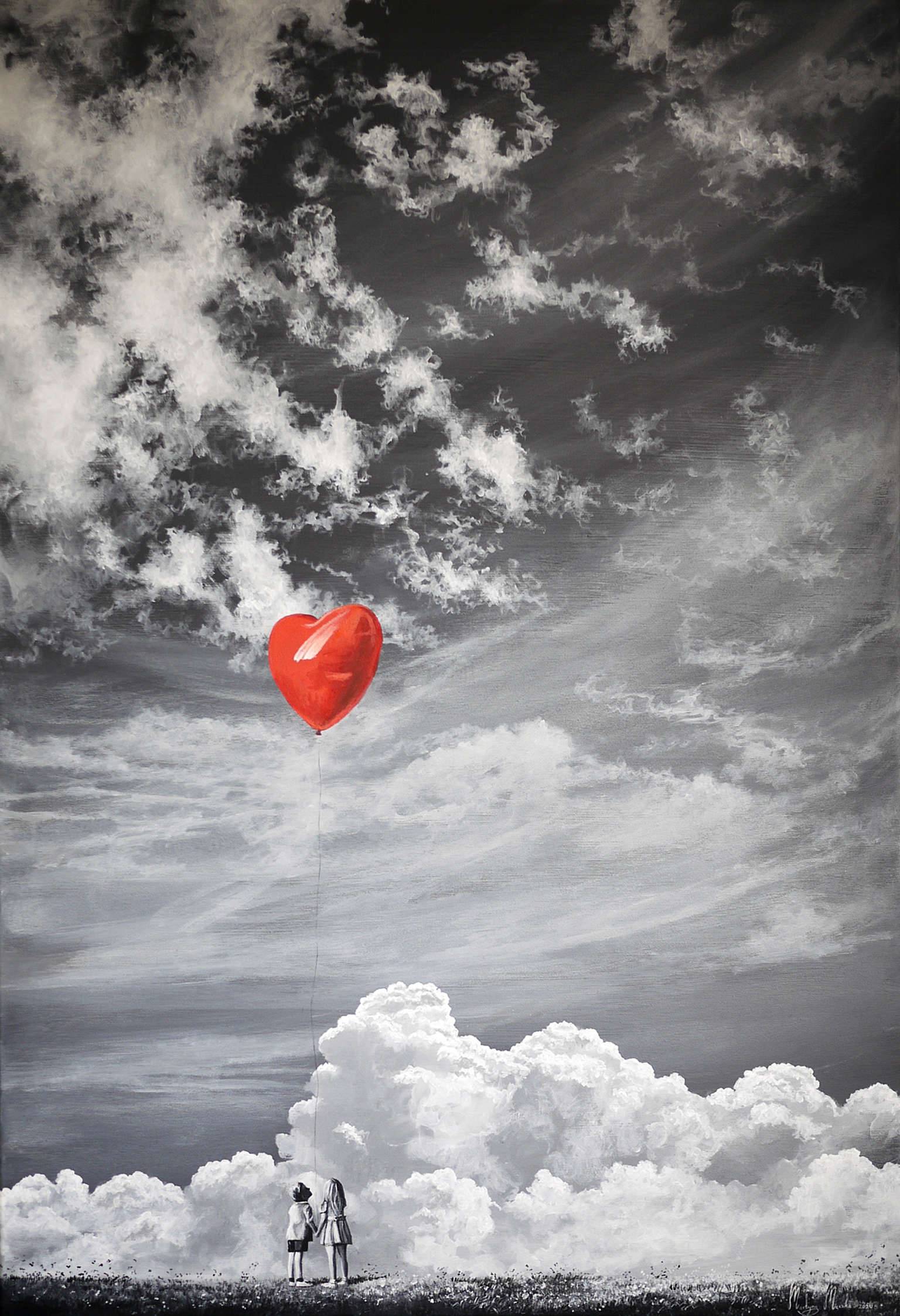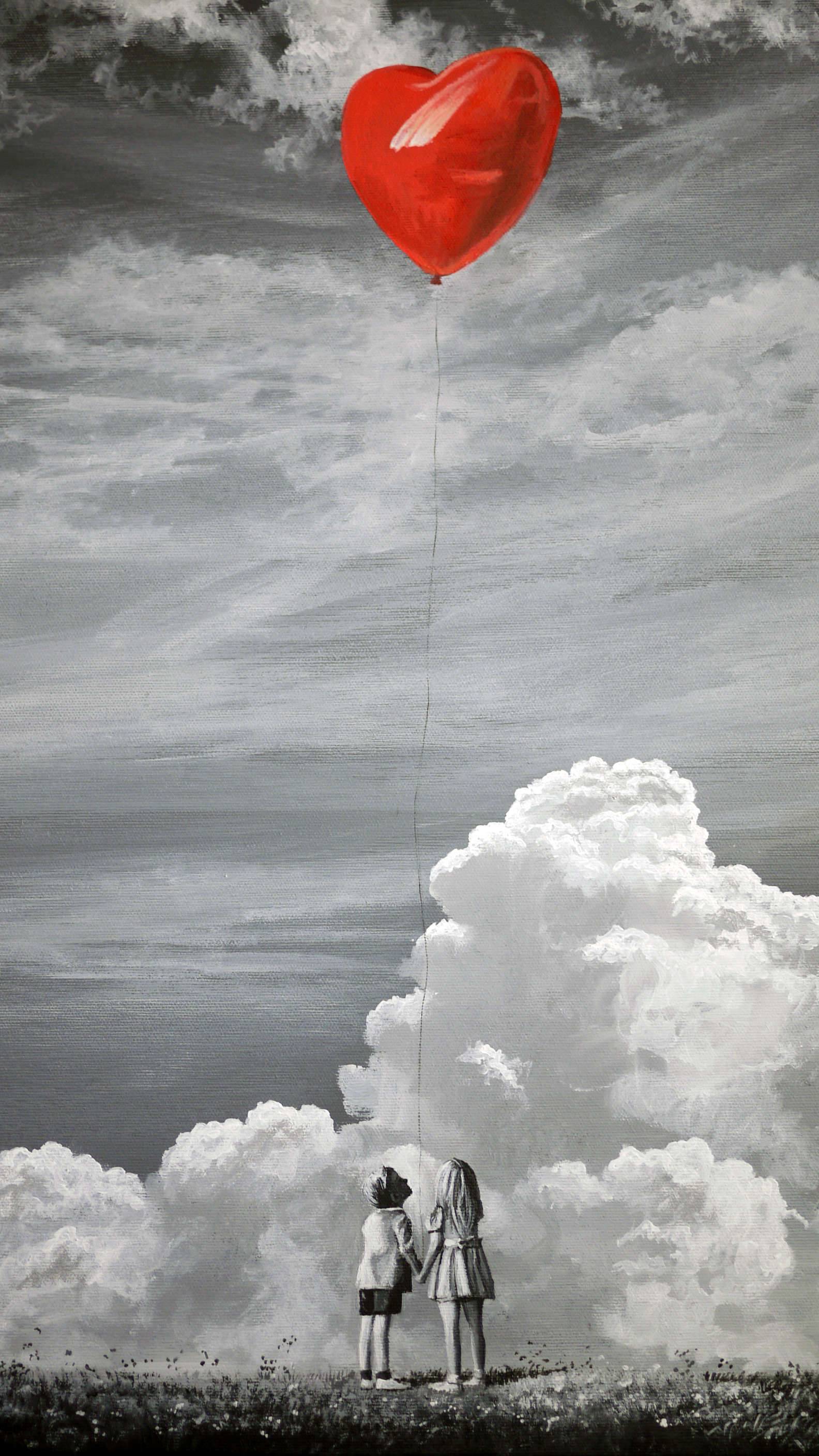 Na obrazie widzimy dwoje dzieci stojących na tle ogromnego, szarego nieba pełnego puszystych chmur. Jednak to, co przyciąga wzrok, to jaskrawo czerwony balonik w kształcie serca, który kontrastuje z monochromatycznym tłem. Kompozycja jest spokojna, ale zarazem pełna dynamiki dzięki wirującym chmurom i unoszącym się balonem. Nastrój dzieła jest melancholijny, ale też pełen nadziei. Artysta stosuje technikę mieszanej palety ograniczonej do czerni, bieli i jednej czerwieni. Obraz daje poczucie niewinności i dziecięcej radości, a jednocześnie może wywoływać refleksję nad kruchością chwil szczęścia. "Look!"— powiedziałby maluch, pokazując palcem na ten intensywnie czerwony punkt na niebie. Wzajemne trzymanie za ręce podkreśla więź między dziećmi, jakby świat był ich placem zabaw. Przeplata się tu styl realistyczny z surrealistycznym, co sprawia, że odbiorca czuje się jakby na granicy jawy i snu. Dla niektórych, obraz może być manifestacją miłości, dla innych symbolem beztroskiego dzieciństwa. Fascynuje mnie, jak ten jeden szczegół, balonik, potrafi przyciągnąć całą uwagę i skupić emocje w jednym punkcie!