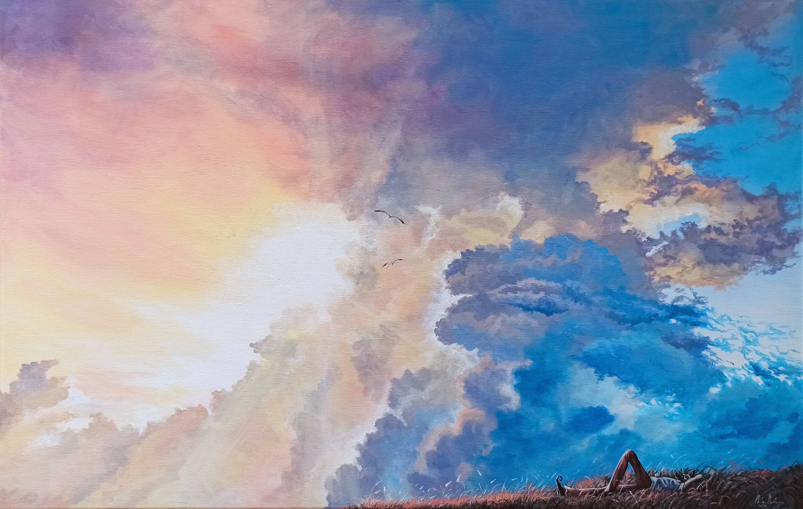 Obraz emanuje spokojem i subtelnością, tworząc niepowtarzalną atmosferę. Dominują na nim barwy pastelowe, gdzie róż przechodzi w błękit z puchatymi chmurami. Kolory te tworzą tęczowy, niemal magiczny gradient. Kompozycja jest niezwykle dynamiczna, a zarazem harmonijna. Błękit nieba miesza się z pastelowym różem i pomarańczem, co sprawia, że całość wydaje się żywa i pełna energii. W samym dole obrazu zauważamy postać leżącą na trawie, co dodaje całości intrygującego twistu. Wrażenie efemerycznego momentu nasila się wraz z niebiańskim krajobrazem, fascynując odbiorcę swoją intensywnością. Styl artystyczny to mieszanka realizmu z impresjonistycznym dotknięciem. Artysta posługuje się płynnymi pociągnięciami pędzla, co nadaje dziełu lekkości. Technika ta sprawia, że chmury wydają się niematerialne, jakby unoszące się w wiecznym tańcu. Można wręcz poczuć ich dotyk, a nawet lekki podmuch wiatru. Odbiorca może poczuć wewnętrzny spokój i zachwyt upływającym czasem. "Wow, to wygląda jak marzenie!" - mogłoby powiedzieć dziecko. Obraz skłania do refleksji nad pięknem natury i naszym miejscem w świecie. W tym dynamicznym chaosie barw kryje się "freedom" – wolność i przestrzeń, której często brakuje nam w codziennym życiu. A ja patrząc na to, czuję, jakby czas stanął na chwilę w miejscu.