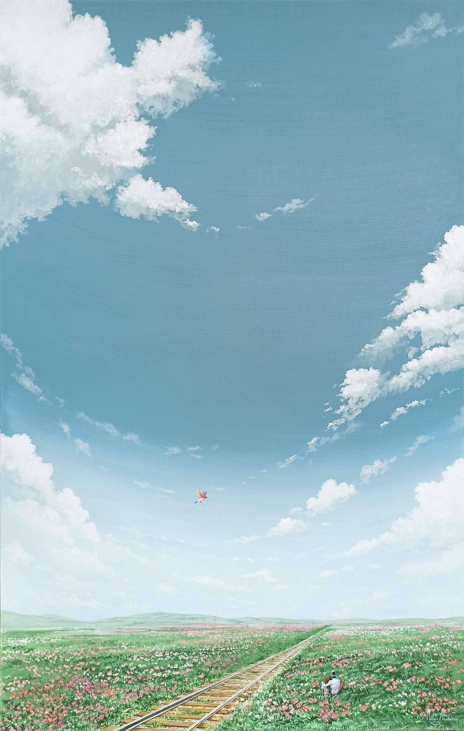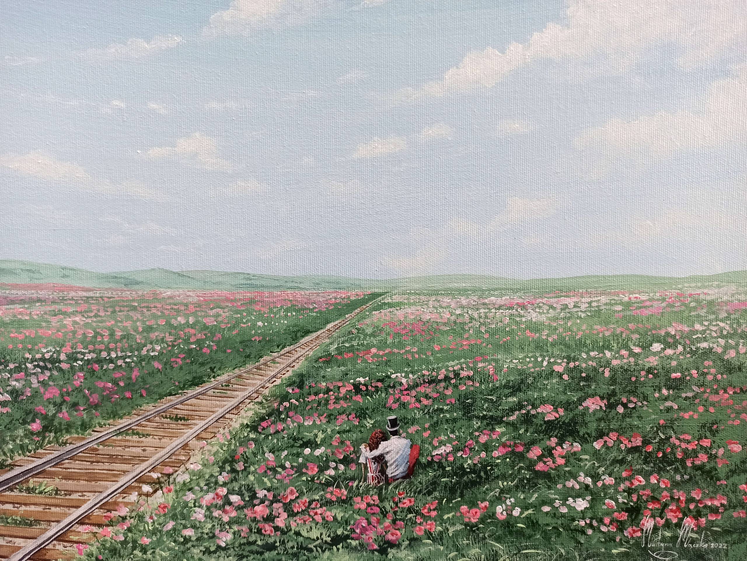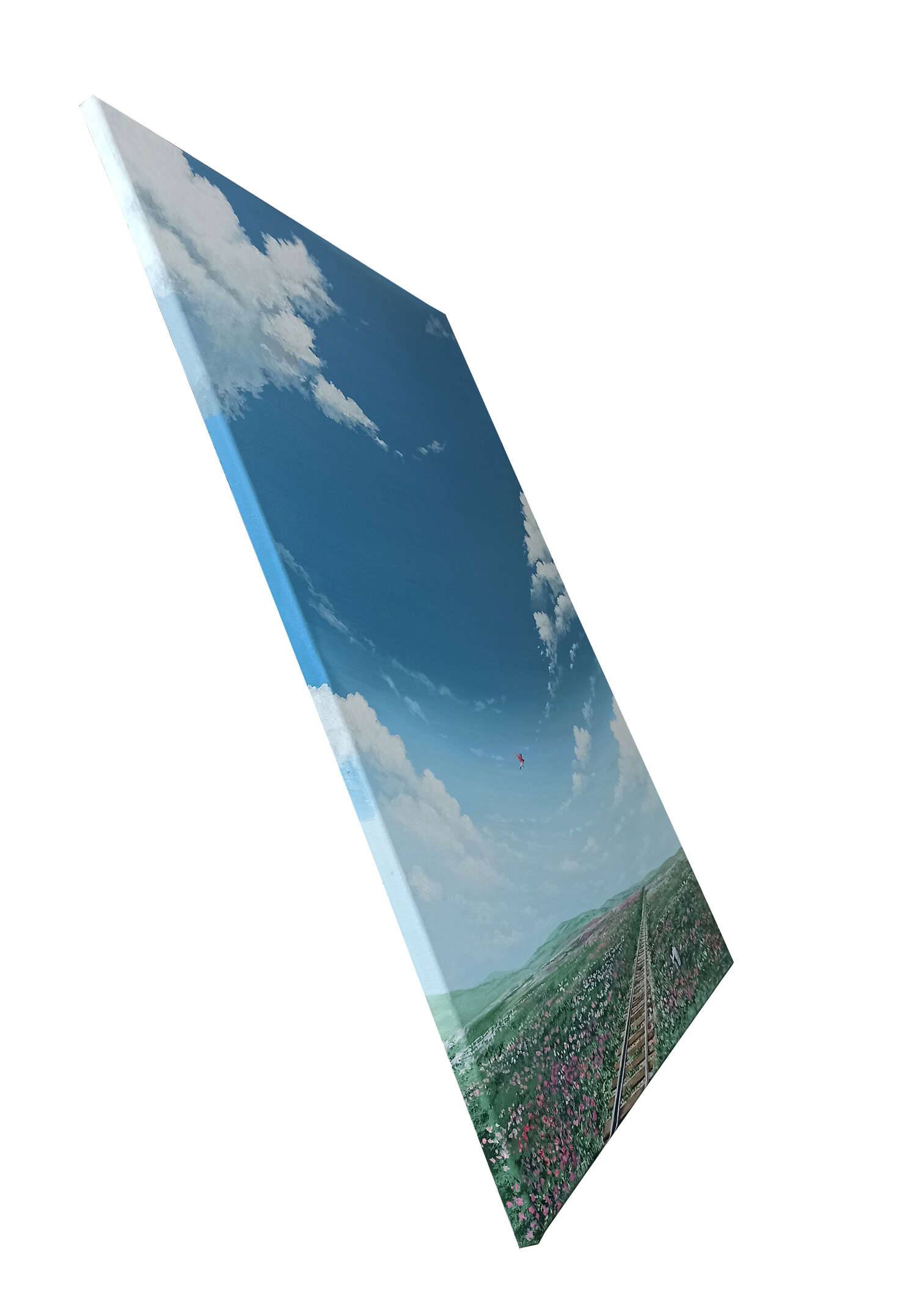 Na obrazie dominuje błękitne niebo przecięte delikatnymi, puszystymi chmurami. Już samo spojrzenie na nie wprowadza w stan spokoju i beztroski. Track biegnie gdzieś hen, przecinając morze różnobarwnych kwiatów. Taka kompozycja nadaje głębi, tworząc wrażenie nieskończonego horyzontu. Artysta używa subtelnych odcieni zieleni i różu, które kojarzą się z wiosną i nowym początkiem. Patrząc na obraz, można poczuć lekki powiew wiatru i zapach kwitnącej łąki. Technika malarska jest realistyczna, ale z nutą magicznego realizmu, podkreślając marzycielski nastrój dzieła. Obraz wywołuje emocje nostalgii i nadziei, a także przypomina o dziecięcej radości odkrywania świata. Gdzieś w oddali leci motyl, jak symbol wolności. Jak bym mogła, biegałabym tam cały dzień. Niebo jest tak piękne, że aż chciałoby się po nim "wylądować". To miejsce, które każdy chciałby odwiedzić, choćby w wyobraźni.