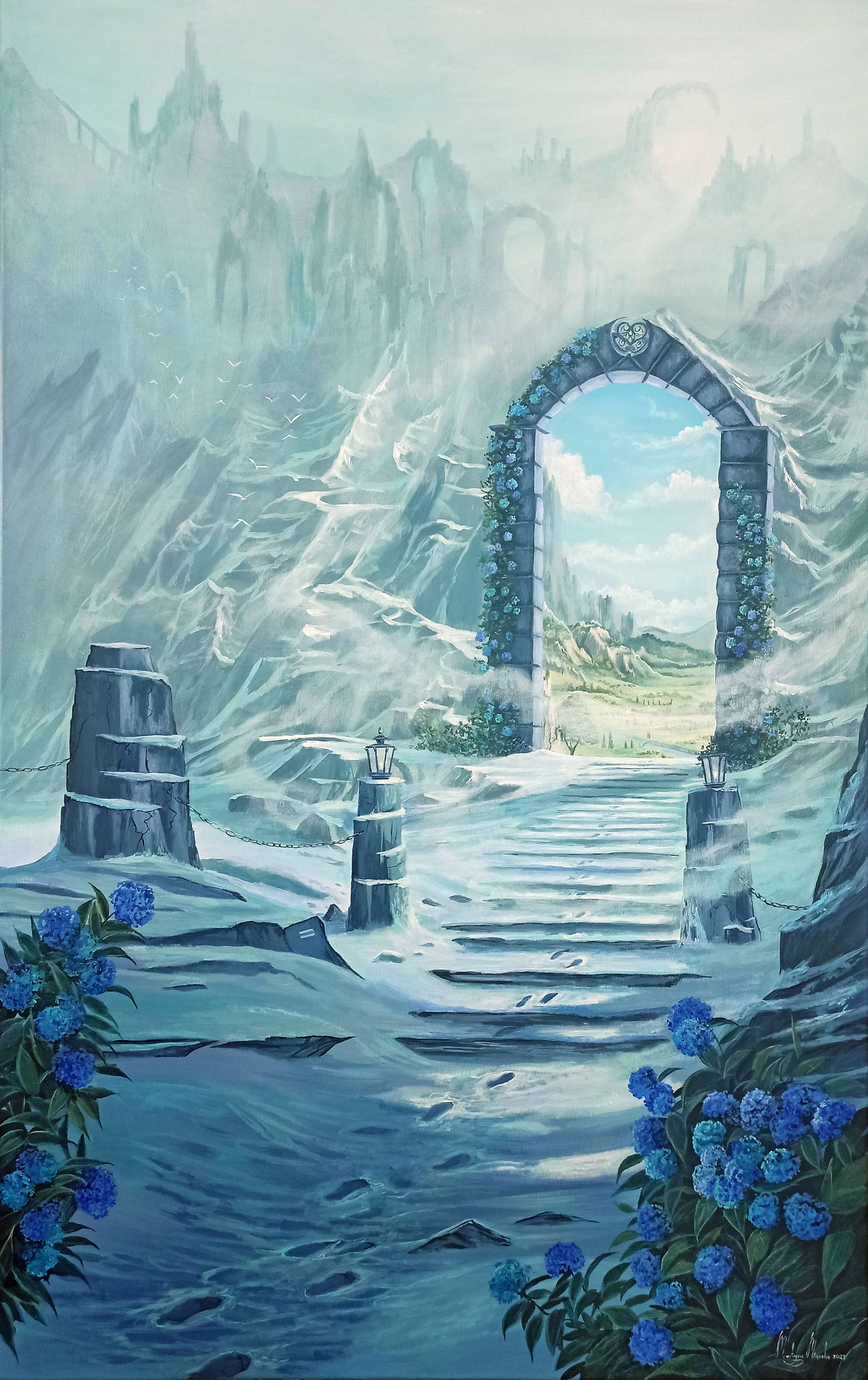 Na obrazie widzimy magiczną, eteryczną scenerię. Dominują pastelowe odcienie błękitu i zieleni, które tworzą harmonijną kompozycję. Na pierwszym planie znajduje się kamienny łuk, opleciony kwiatami o intensywnie niebieskiej barwie, prowadzący do tajemniczego krajobrazu. Schody przed wejściem przypominają tajemniczą ścieżkę ku nieznanemu. W tle unoszą się majestatyczne, niemalże zrujnowane struktury, które zdają się skąpane we mgle. Obraz emanuje spokojem i nutą tajemnicy. Widz ma wrażenie, jakby mógł przenieść się do innego świata pełnego magicznych przygód. Styl tego dzieła to subtelny realizm z elementami fantasy, a technika to delikatne pociągnięcia pędzlem, tworzące miękkie przejścia między kolorami. Obraz może wywołać u odbiorcy poczucie tęsknoty za czymś nieuchwytnym, „dreamlike” krajobrazy snów. Może też budzić ciekawość, co czeka po drugiej stronie łuku. Wow, chciałbym tam pobiec i zobaczyć, co jest dalej! To jak magiczne drzwi do świata, w którym wszystko jest możliwe.