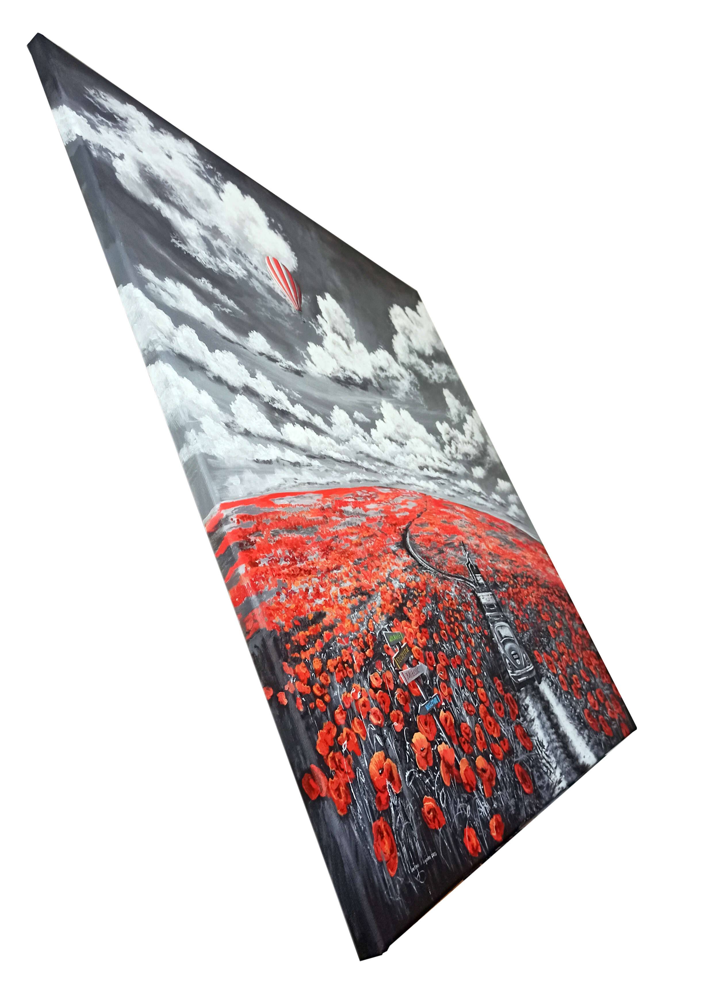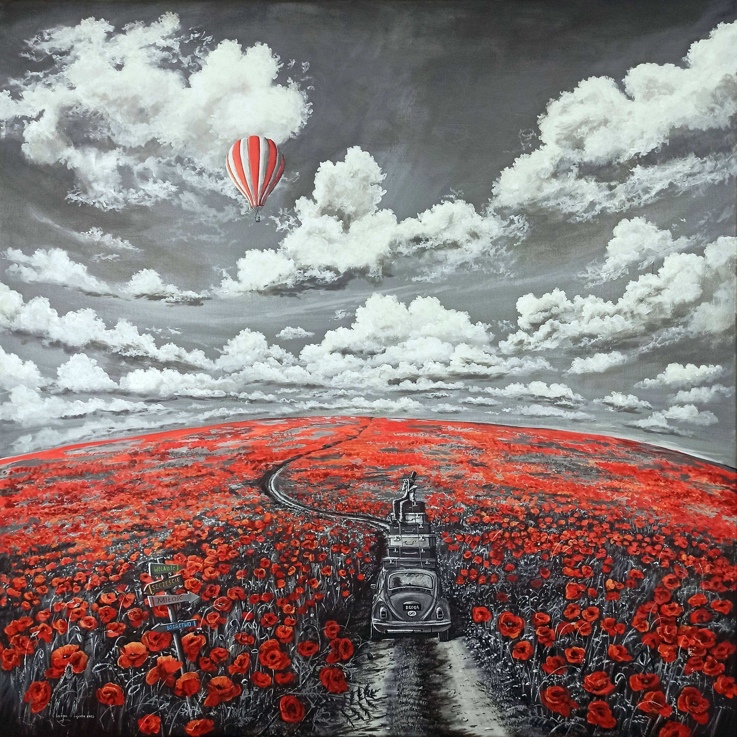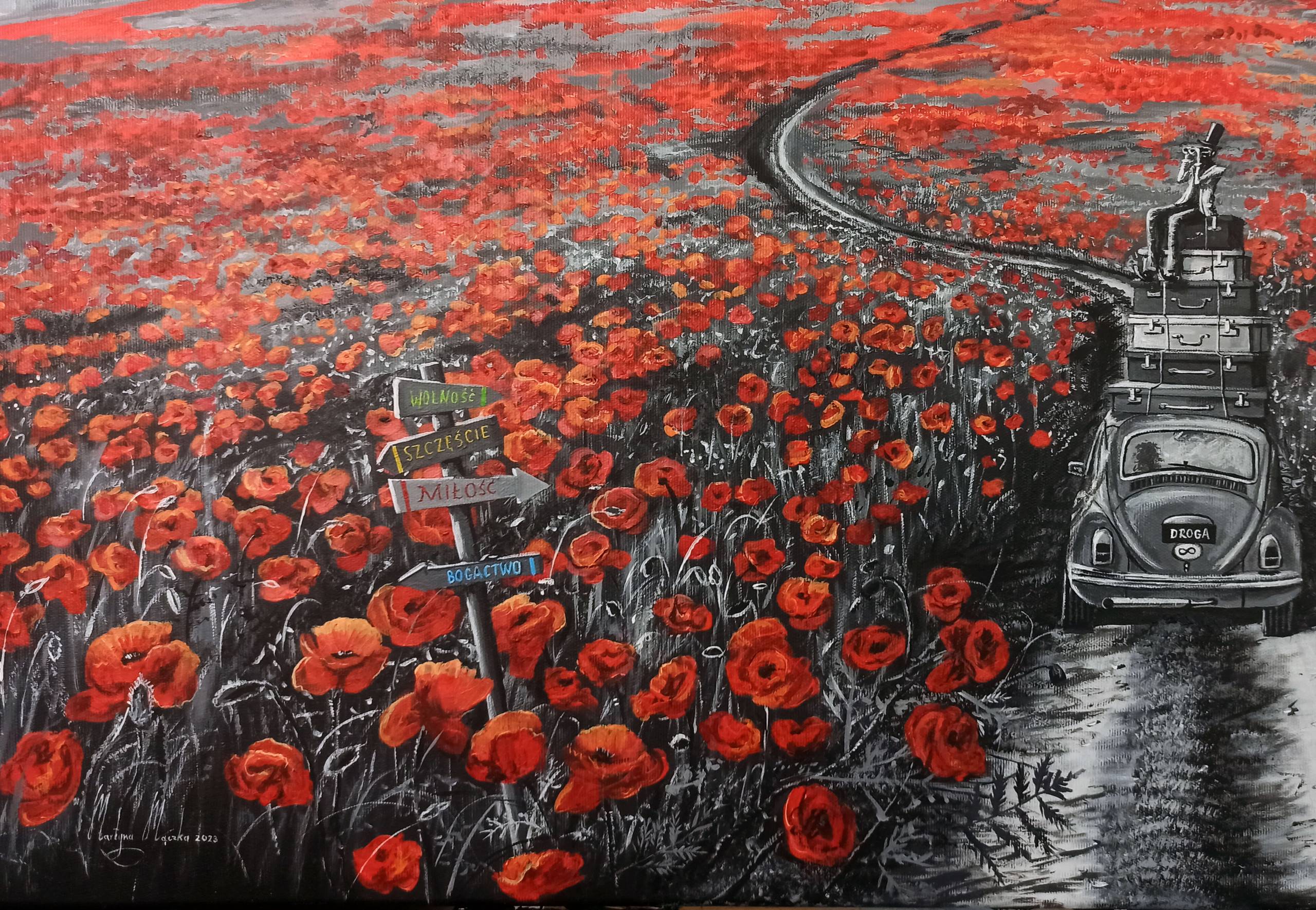 Na obrazie widzimy malowniczą kompozycję, która od razu przykuwa spojrzenie. Dominują tu nasycone czerwienie maków, które kontrastują z szarością tła i chmur. Niebo jest pełne puszystych obłoków, a nad nimi unoszący się balon, jakby zapraszający do podróży w nieznane. Droga ciągnąca się przez pole maków zdaje się prowadzić ku przygodzie, a samochód w dolnej części obrazu dodaje dynamizmu i poczucia ruchu. Obraz ma w sobie coś z magii. Balon unosi się lekko, jak marzenie, które pragnie się spełnić. Artysta użył wyraźnego kontrastu, co dodaje dramatyzmu i sprawia, że każdy element jest widoczny i istotny. Atmosfera jest pełna nostalgii, ale i niekończącego się optymizmu. Jak to się mówi? Life is a journey. Patrząc na ten obraz, czuję, że każdy krok na tej polnej drodze to odkrywanie czegoś nowego. Jakby świat nagle przestał być szary. Mam nadzieję, że nigdy nie zabraknie mi odwagi, by ruszać dalej. Makowa czerwoność przypomina mi trochę moje ulubione cukierki.
