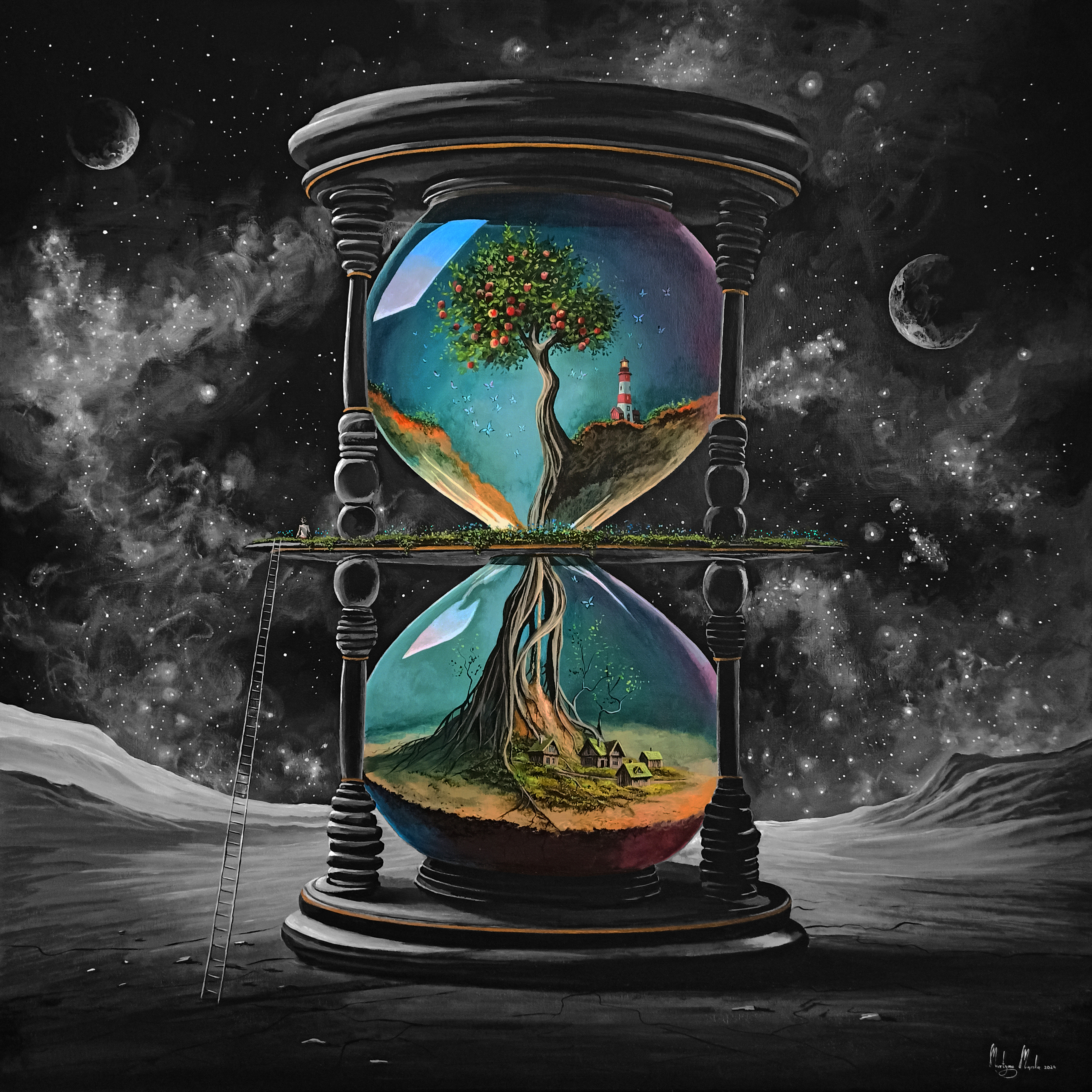 Surrealistyczny obraz namalowany farbami akrylowymi na płóciennym podobraziu. Praca nie wymaga ramy, boczne krawędzie płótna zamalowane - kontynuacja obrazu. Obraz jest zakonserwowany matowym werniksem, sygnowany w prawym dolnym rogu imieniem i nazwiskiem oraz rokiem powstania. Dzięki właściwościom farb akrylowych i werniksu, obraz posiada długoletnią trwałość od pęknięć, zżółknięć i blaknięcia farby. Życie jest jak drzewo, które swoje korzenie ma w przeszłośći. W przyszłości na bazie doświadczeń wydaje owoce, zmierzając w kierunku światła latarni, która wskazuje drogę do celu. Jednak najbardziej liczy się TERAZ, ta cieńka linia pomiędzy przeszłością a przyszłością, krótka i nieuchwytna jak jeden trzepot skrzydeł motyla...