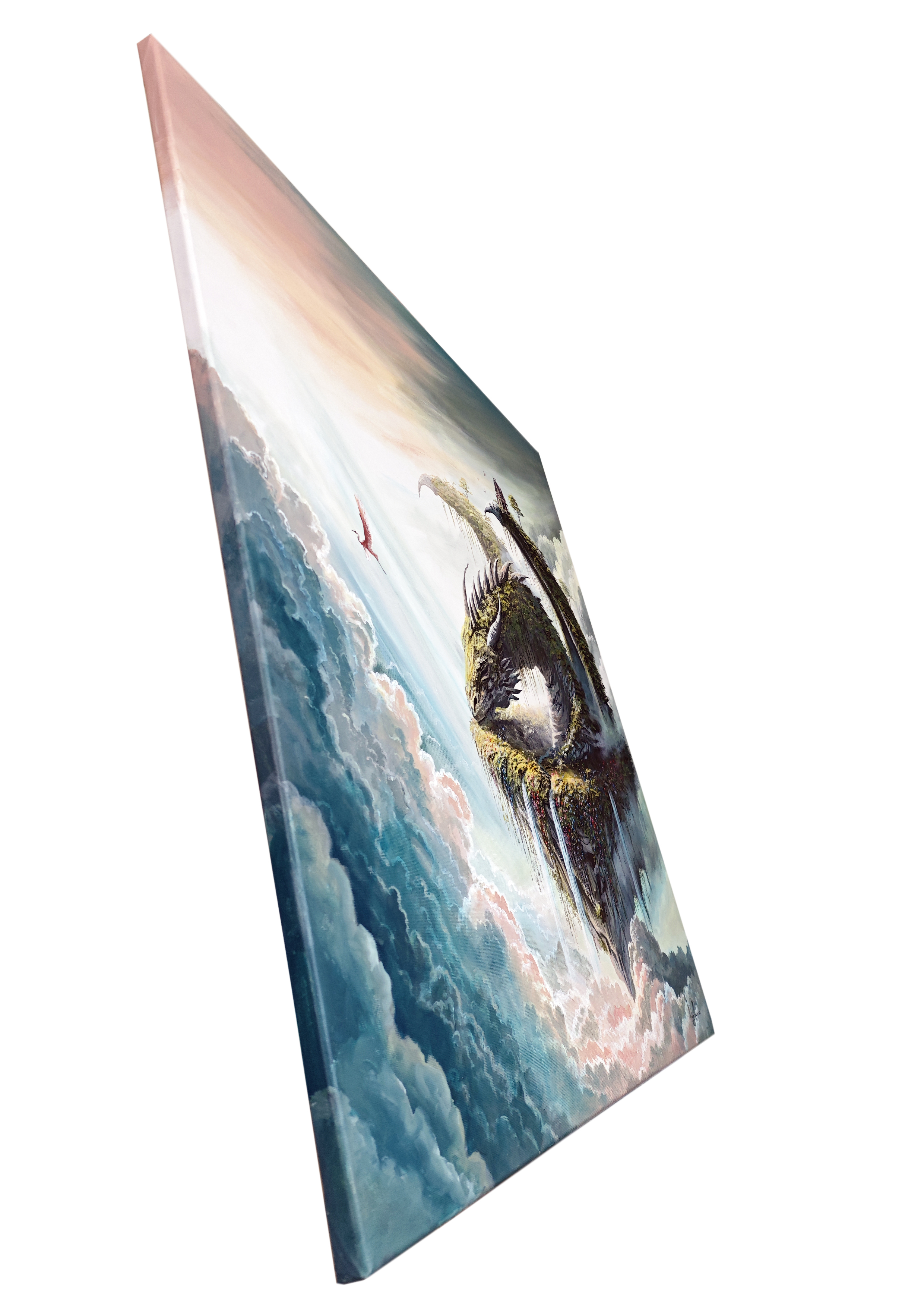 Wyspa w kształcie zwinietego smoka unosi się nad oceanem chmur, porośnięta mchem i kwiatami, z cienkimi wodospadami jak struny. Chłodne błękity i seledyny mieszają się z mlecznym różem nieba, a stalowe rogi tną przestrzeń. Spiralny grzbiet prowadzi wzrok do maleńkiego domku i dwóch drzew, drobny znak codzienności wśród mitu. To co co groźne i dzikie zostało uśpione, pozostał tylko spokój i swobodna lekkość wolności...