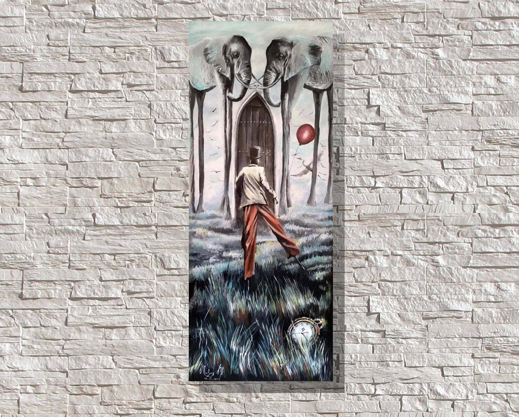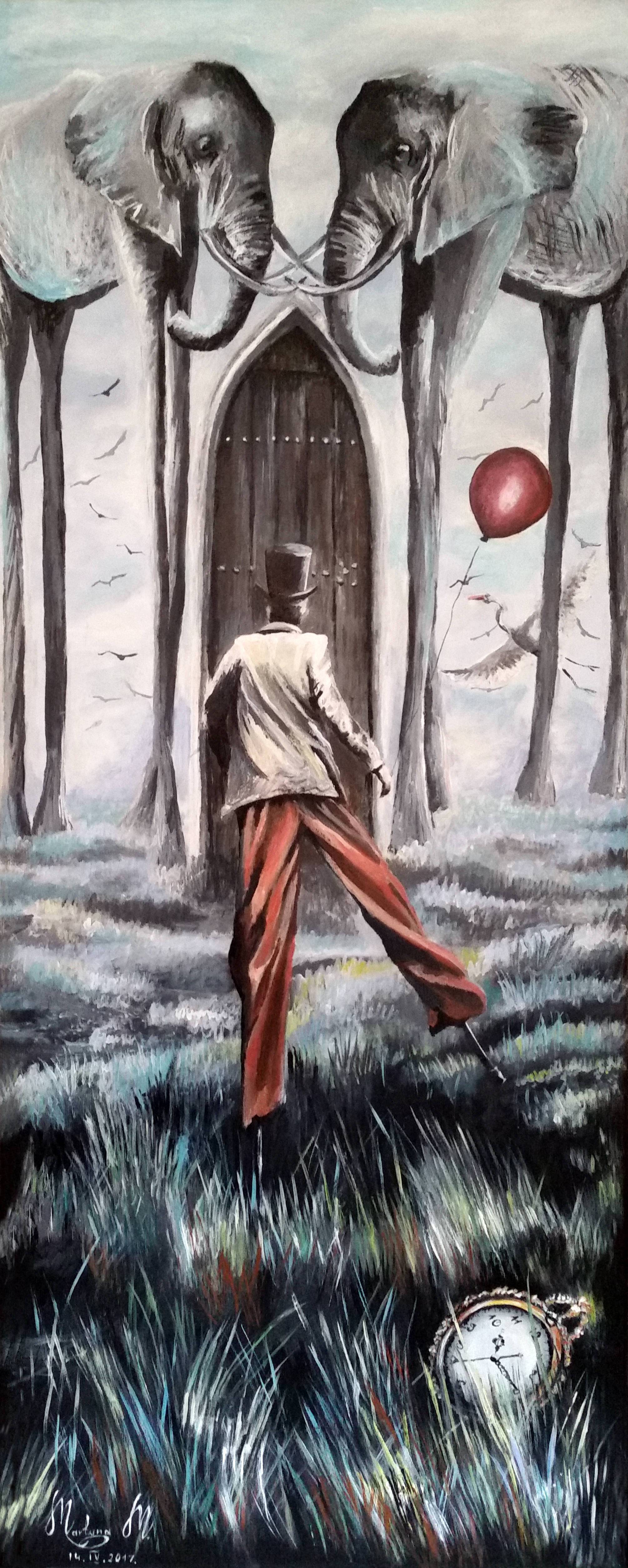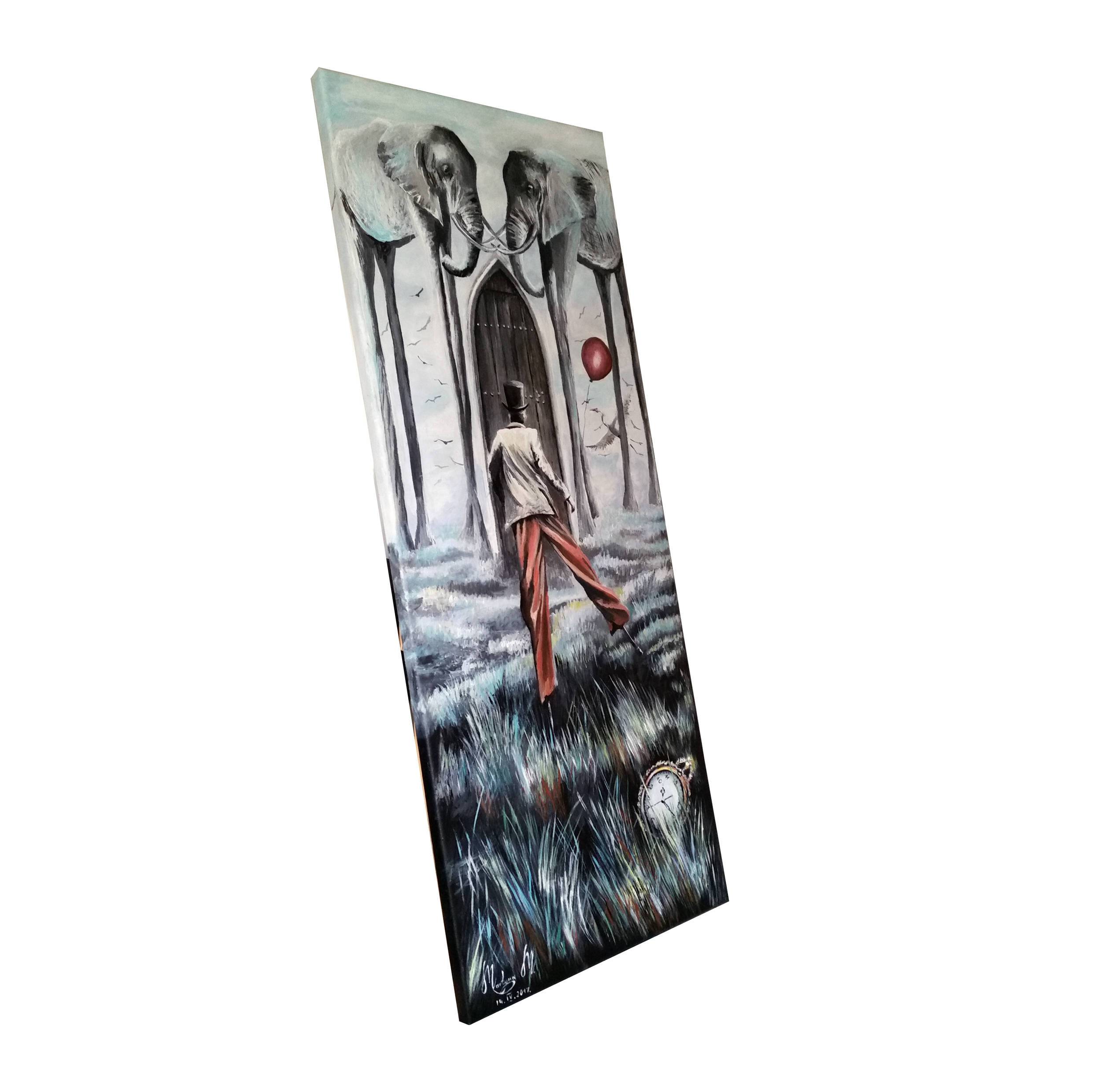 Obraz eksploduje surrealizmem jak z innego świata. W centrum widnieje postać skierowana plecami do widza, ubrana w ciemny płaszcz i kapelusz, jakby wędrowiec z dziwnej bajki. Przed nim masywne drzwi, strzeżone przez dwa gigantyczne słonie, które potęgują poczucie tajemnicy. Kolory są stonowane, dominują szarości i przybrudzone błękity, które nadają kompozycji nostalgiczną aurę. Na pierwszym planie trzyma się na wietrze balon, czerwony jak marzenie dziecka, żywy kontrast do reszty obrazu. Całość, jakby namalowana techniką impresjonistyczną, ma dynamiczny ruch pędzla, co sprawia, że trawa zdaje się falować w rytm niewidzialnego wiatru. Detale są subtelnie zarysowane, co podkreśla eteryczny klimat i zagadkowy nastrój. Obraz jest jak sen, który zaraz się skończy, zostawiając widza z subtelnym uczuciem melancholii i tęsknoty za czymś nieokreślonym. Dla mnie, ten obraz to podróż w nieznane, symboliczne przejście do krainy wyobraźni. Wow, to jak magiczna kraina z książki! Zegar leżący w trawie przypomina o ulotności czasu, zachęcając do refleksji nad przemijaniem. Jest tu coś nieuchwytnego, co skłania do zadumy, a może nawet trochę przeraża. W końcu, patrząc na to dzieło, myśli się tylko co dalej. Po drugiej stronie tych drzwi? Who knows!