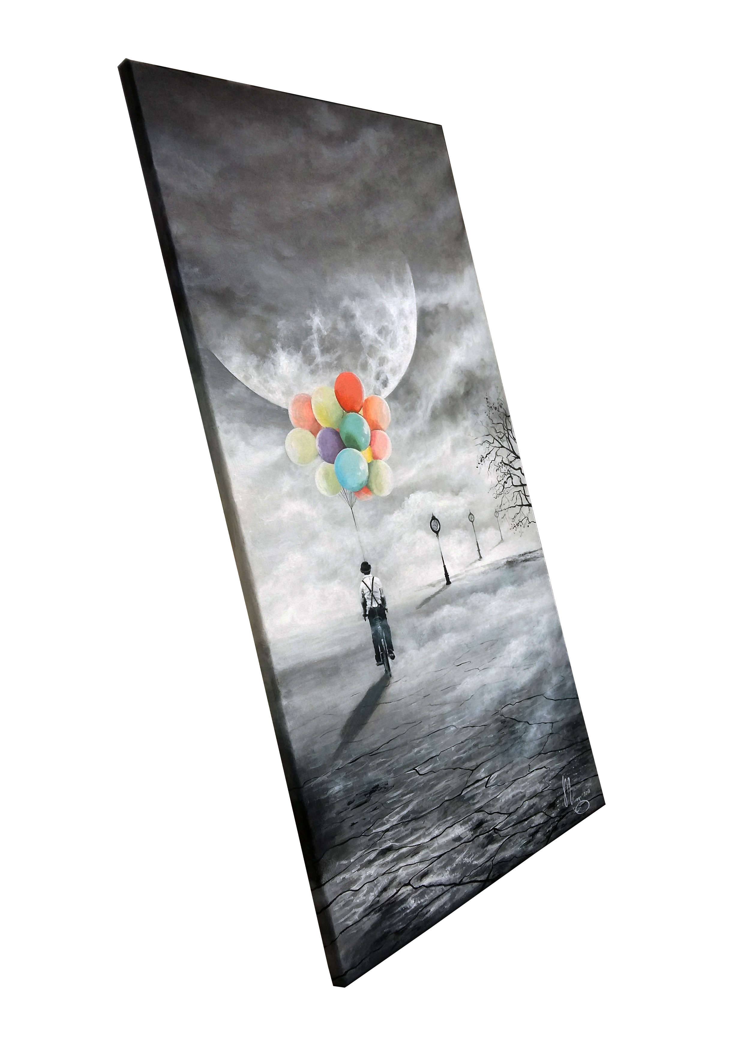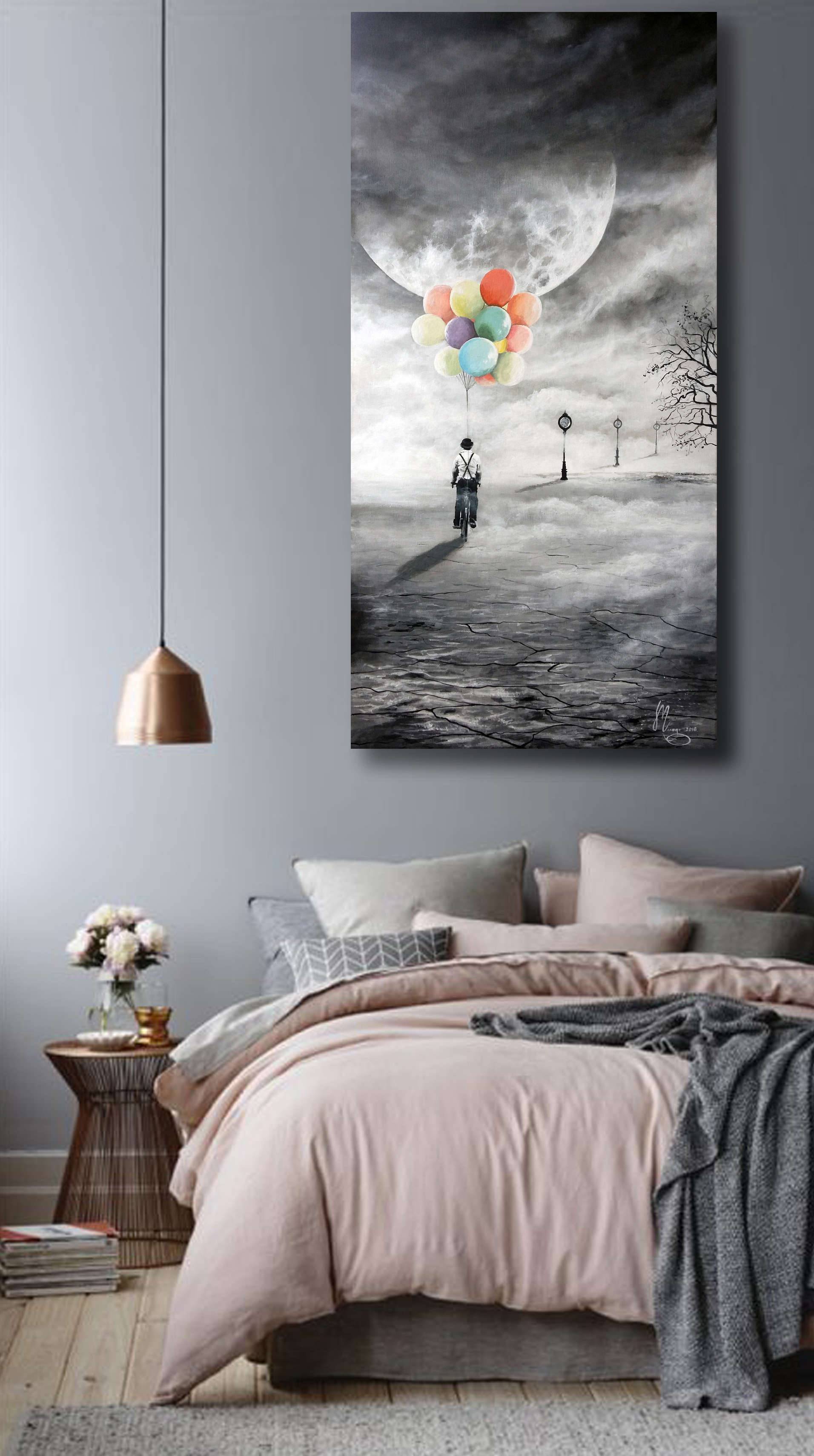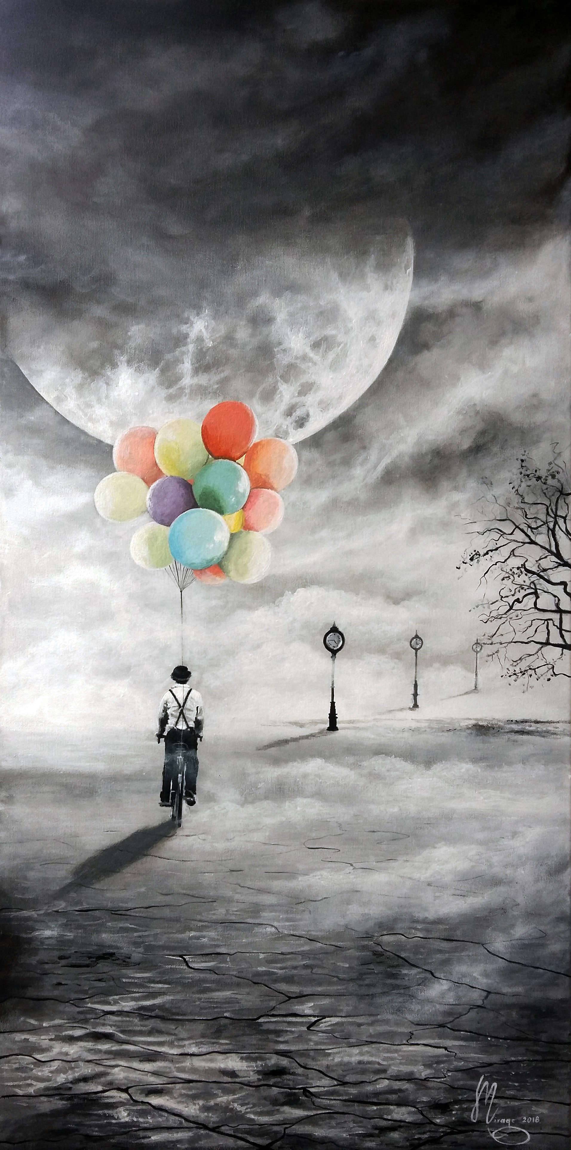 Na obrazie dominuje monochromatyczna paleta kolorów z subtelnymi akcentami żywych balonów unoszących się nad samotnym mężczyzną na rowerze. Te balony, w jasnych odcieniach czerwieni, zieleni i błękitu, są jak małe kolorowe dreams pływające w szarej rzeczywistości. Księżyc w tle, przyciemniony przez chmury, dodaje całości tajemniczej aury. Kompozycja jest dynamiczna, prowadzi wzrok od postaci jadącej w głąb drogi aż po pnące się ku niebu latarnie biegnące w dal. Nastrój obrazu można opisać jako melancholijny z nutą nadziei. Jest coś magicznego w tej scenie; coś, co sprawia, że odbiorca zaczyna marzyć. Prostota linii i miękkie przejścia między barwami nadają dziełu specyficzny, nieco surrealistyczny styl przypominający poetycką impresję. Obraz może wywołać u widza uczucie nostalgii, a nawet tęsknoty za dzieciństwem, kiedy to balony mogły wynieść nas w świat wyobraźni. Patrząc na to dzieło, można zastanowić się, dokąd ten człowiek jedzie i czy balony symbolizują jego marzenia czy ciężary. Malujac ten pejzaż, artysta zastosował technikę delikatnych pociągnięć pędzla, co dodaje lekkości i ulotności. Ja chcę też takie duże balony i polecieć nimi do nieba! Ten obraz pozostawia lekki uśmiech na twarzy, przypominając o magii, która czai się w codziennym życiu.