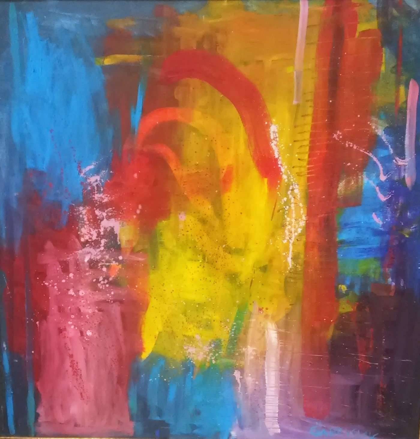 Piękny obraz abstrakcyjny, który dodaje energii, ożywia wnętrze. Oprawiony w złote ramy, sygnowany. Pasuje do nowoczesnego wnętrza, ale również - poprzez ciekawy kontrast może zdobić również bardziej "barokowy" salon.