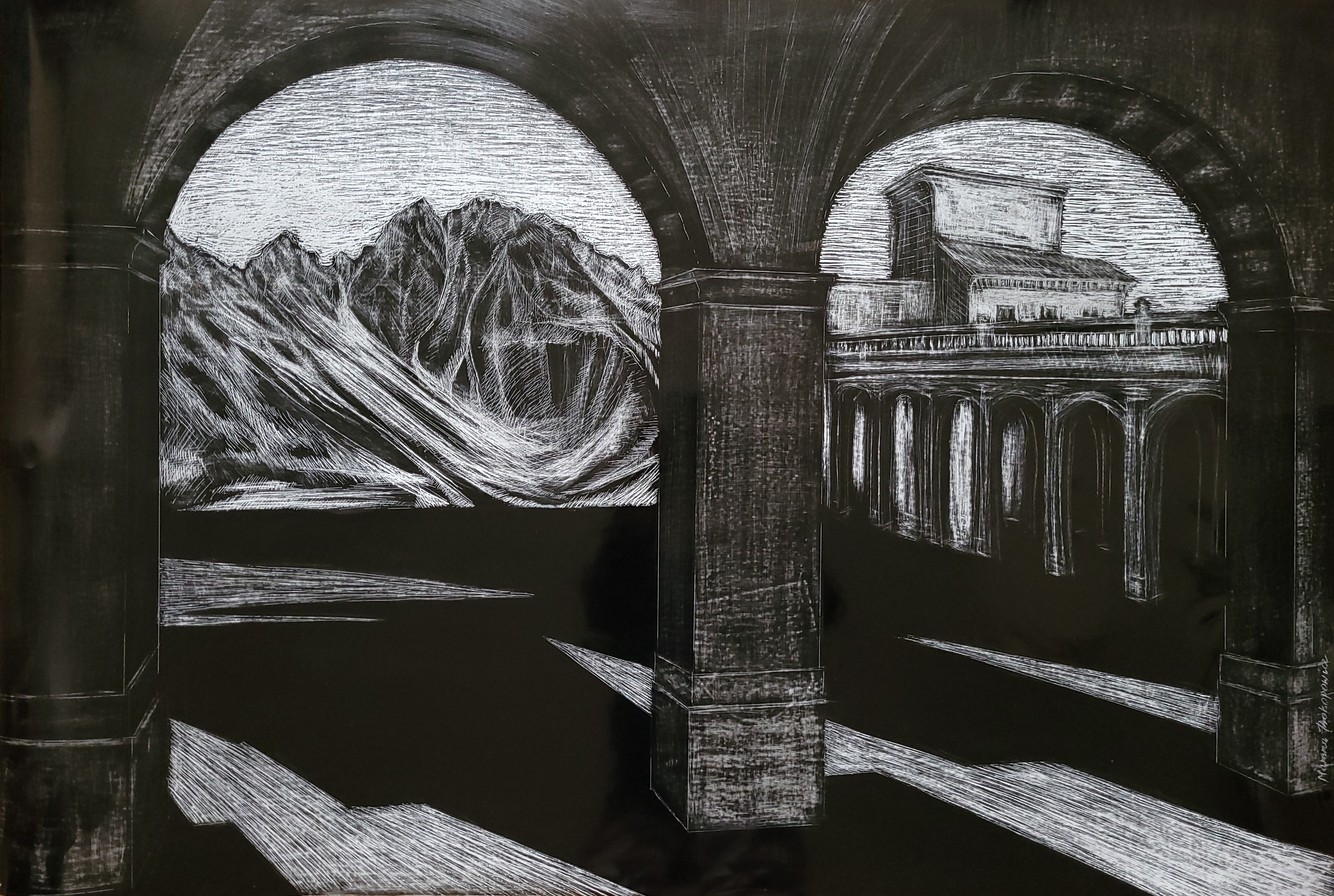 Praca wykonana jest w technice własnej, na wywołanym papierze fotograficznym. Tematem jest interpretowany pejzaż górski z elementami dawnej architektury. Interesują mnie wejścia, przejścia – jest to element drogi, ciekawości z nią związanej i odkrywanie niezwykłości po wkroczeniu w tę przestrzeń.