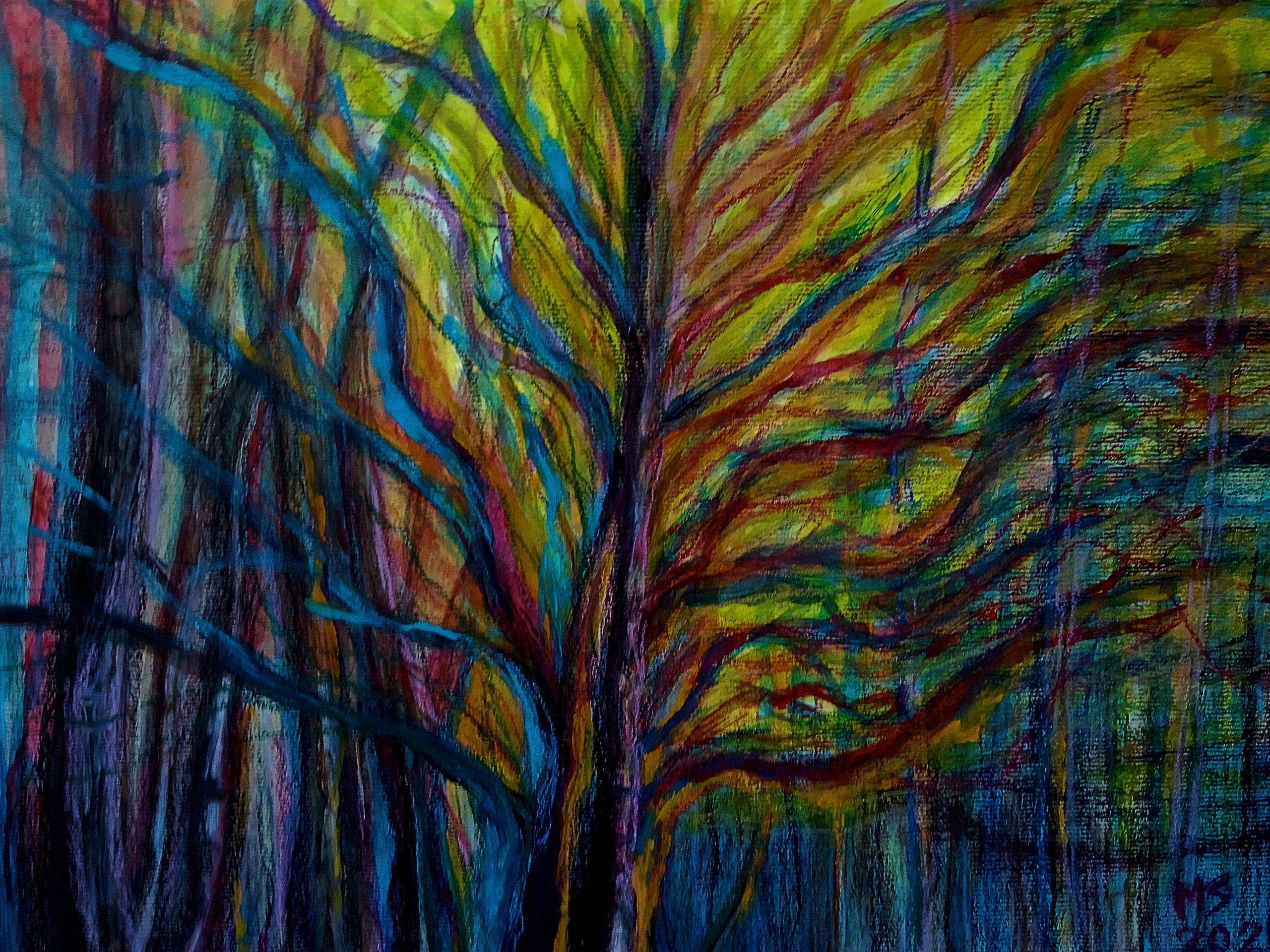 Obraz eksploduje paletą kolorów, jakby cała tęcza postanowiła zatańczyć na płótnie. Przeważają intensywne zielenie i błękity, które przeplatają się z czerwieniami i żółciami. Kompozycja jest dynamiczna; gałęzie drzewa rozrastają się na boki, tworząc sieć żył, jakby drgały w rytmie natury. Atmosfera jest pełna energii i żywości, przywodzi na myśl świeżość wiosennego poranka. Styl obrazu jest ekspresjonistyczny, artysta używa odważnych pociągnięć pędzla, aby oddać spontaniczne emocje. Czuję w tym jakąś moc, jakby drzewo szeptało "life" prosto do uszu. Dzieło wywołuje uczucie spokoju, ale i intensywności - jakby mówiło: "zatrzymaj się na chwilę". Kolory mieszają się nieprecyzyjnie, tworząc wrażenie ruchu i zmienności. Jakby świat wokół pulsował. Patrząc na ten obraz, można poczuć się jak w lesie, gdzie każda gałąź ma swoją historię. Mały chłopczyk mógłby powiedzieć: "Drzewo jest magiczne i tańczy!". To jest coś więcej niż obraz, to okno do innego świata.