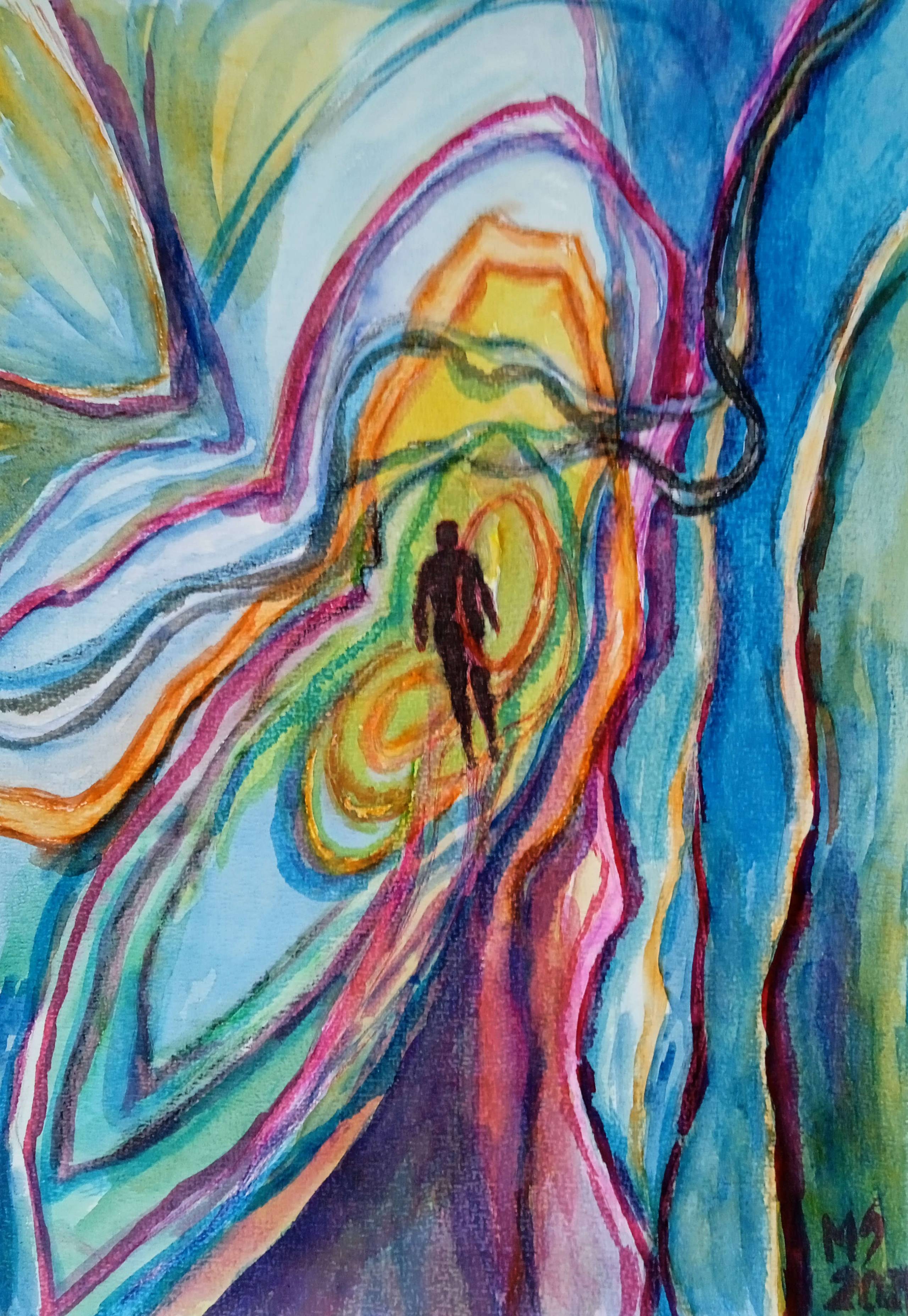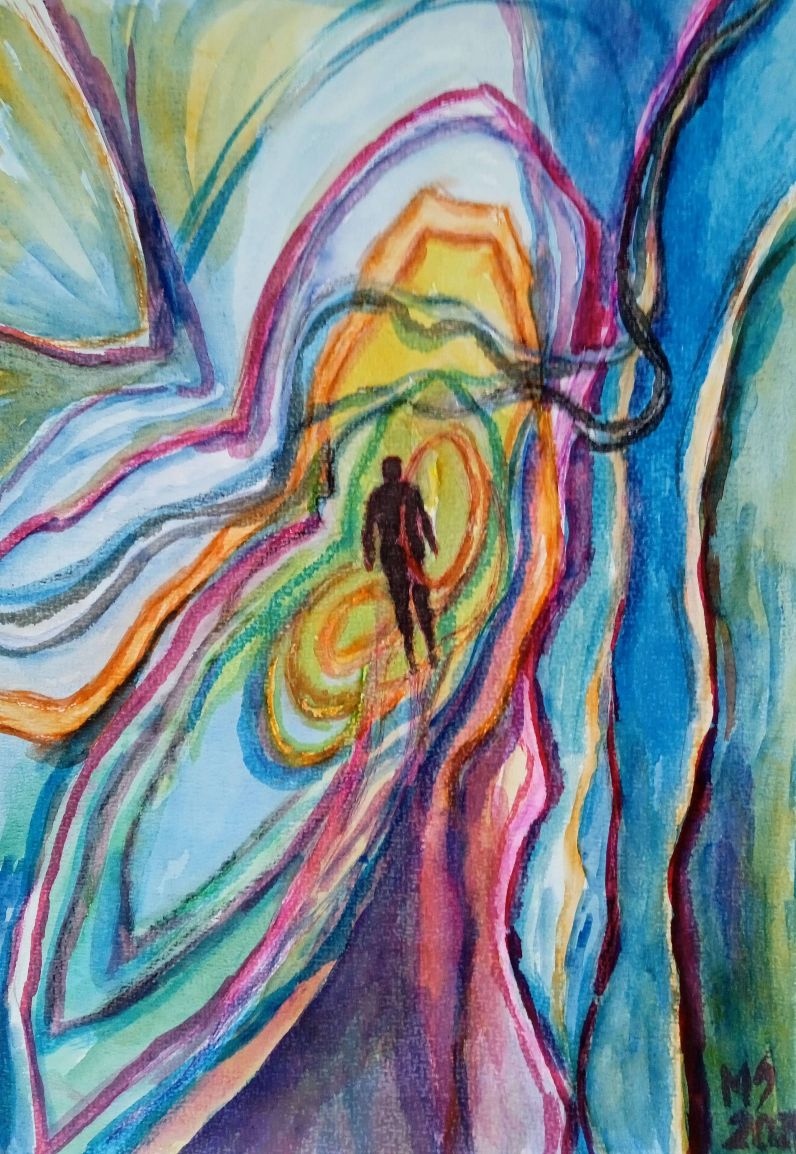 Obraz emanuje eksplozją kolorów, zdominowaną przez intensywne odcienie niebieskiego, zielonego, pomarańczowego i różowego, które tworzą dynamiczne wiry i fale. W centrum, na tle świetlistego wiru, wyróżnia się sylwetka człowieka, która można by powiedzieć, wisi pomiędzy rzeczywistością a jakąś intrygującą fantazją. Kompozycja spiralnych linii przyciąga uwagę ku środkowi i sprawia wrażenie, jakby postać była na granicy magicznego przejścia do innego świata. Atmosfera jest niemalże oniryczna, z nutą mystery. Styl, lekko abstrakcyjny, podkreśla użycie akwareli, co dodaje pracy lekkości i wdzięku. Kolorowe linie wprowadzają element chaosu, ale jednocześnie harmonię. „Wow, to wygląda jak kosmos!” - zauważyłby 7-latek. Obraz może budzić różne emocje. Dla jednych będzie to podróż w głąb własnej wyobraźni, dla innych symbol przemiany. Technika artystyczna z pewnością może skojarzyć się z pracami impresjonistów. Praca, z jej „flow” i pięknymi liniami, jest niczym zaproszenie do refleksji nad tym, co leży poza codziennym spojrzeniem. Z każdym spojrzeniem dostrzegamy coś nowego, co sprawia, że obraz jest tak fascynujący.