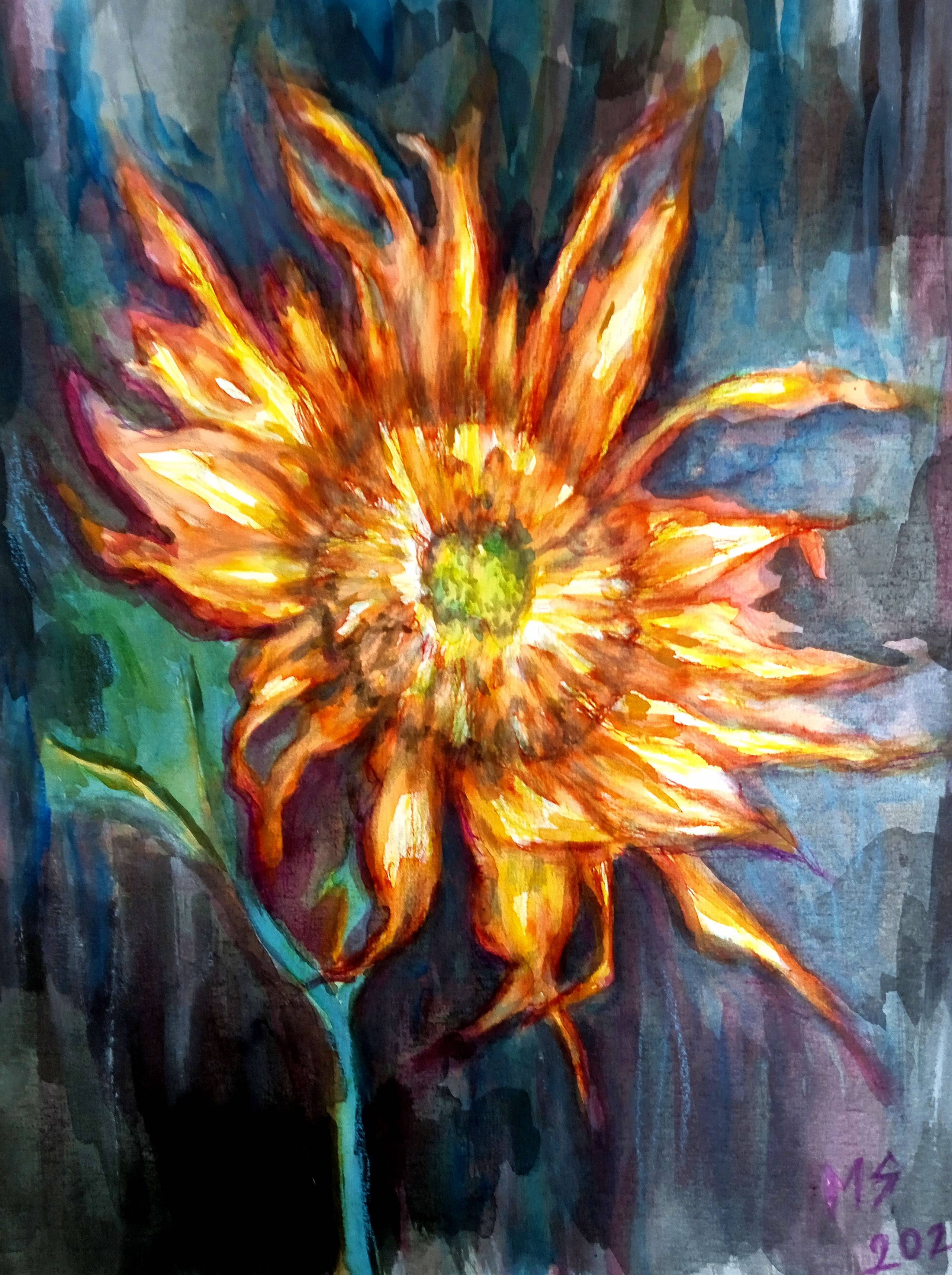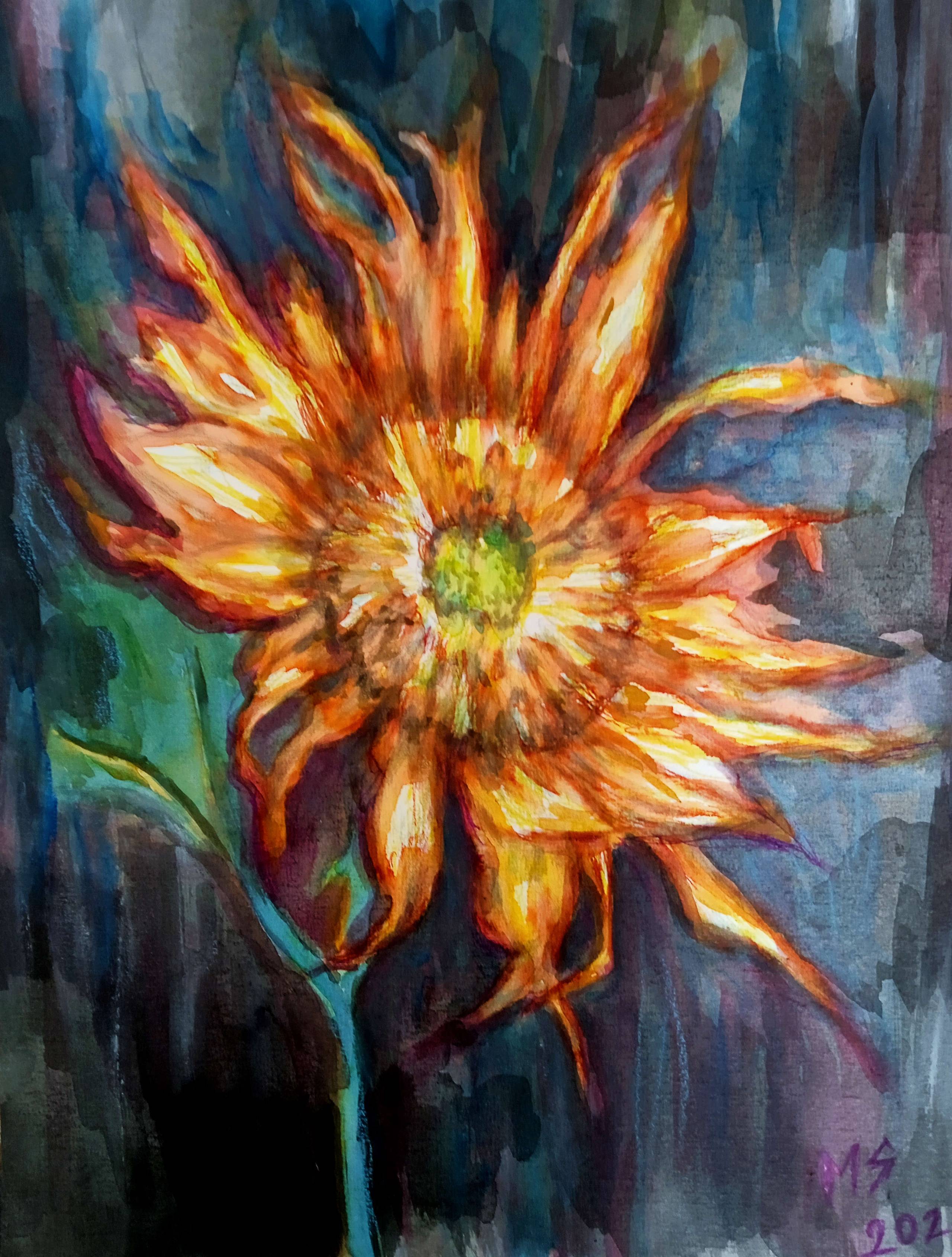 Na obrazie widzimy olśniewający, soczyście kolorowy kwiat, który eksploduje na tle głębokich, ciemnych, złowieszczych tonów. Jego płatki płomiennie pomarańczowe i czerwone, przypominają żywy ogień, który rozbłyskuje intensywnością i energią. Chciałoby się niemalże wyciągnąć rękę i dotknąć tego kwiatowego słońca. Sposób, w jaki artysta połączył zielenie z błękitami w tle, tworzy efekt kontrastu z żywymi barwami kwiatu, dodając kompozycji głębi i dynamiki.