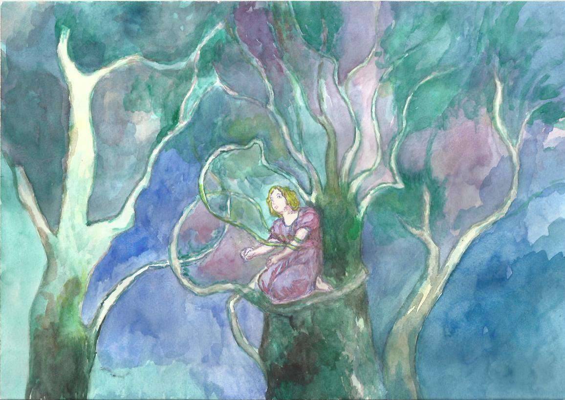 Obraz ukazuje tajemniczą scenę, w której centralną postacią jest kobieta siedząca wśród poskręcanych gałęzi. Dominują tu odcienie zieleni, niebieskiego i fioletu, które tworzą harmonijną ale nieco niepokojącą paletę. Tło zdaje się być otulone mgłą, podkreślając ulotną atmosferę. Kompozycja jest dynamiczna, z nieprzewidywalnymi liniami drzew, które wydają się żyć własnym życiem. To jakby zatrzymana chwila magicznego "wonderland", gdzie rzeczywistość splata się z fantastyką. Styl artysty jest subtelnie oniryczny, przypominający akwarelowe sny pełne delikatności. Technika malarska z zastosowaniem rozmytych konturów nadaje temu dziełu eterycznego charakteru. Obraz może budzić w odbiorcy uczucie zagubienia, ale i zaciekawienia. Wyobraźnia dziecka powiedziałaby pewnie: "Pani bawi się w drzewo." Głębsza interpretacja rodzi pytanie o więź człowieka z naturą. Może to być dialog z samotnością, a może odkrywanie własnej ścieżki życiowej. Czuję wewnętrzny spokój i lekką tęsknotę za czymś nieuchwytnym. Jest to "dreamy" klimat, który zostawia miejsce dla osobistej refleksji. Atmosfera obrazu może przyciągać tych, którzy szukają w sztuce zarówno odpowiedzi, jak i nowych pytań.