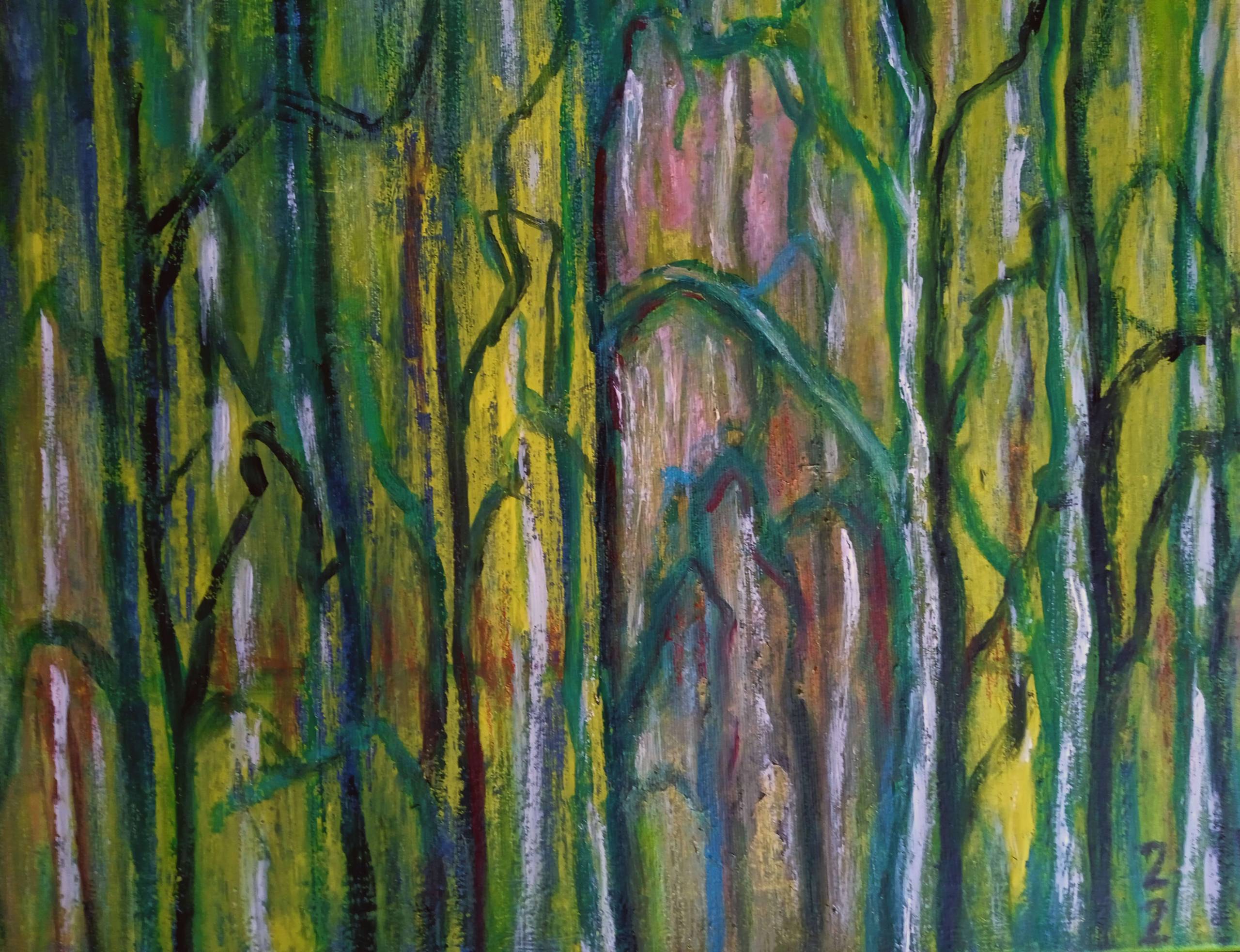 Ten obraz przypomina zanurzenie się w tajemniczym lesie pełnym bujnych zieleni i przebijających się promieni światła. Dominują odcienie zieleni, żółci i subtelne nuty różu. Kształty są miękkie, jakby drzewo gałęzie tańczyły w wietrze. Kompozycja jest chaotyczna, ale w tym chaosie kryje się harmonia. Patrząc na obraz, czuje się spokój, ale też dzikość. Atmosfera jest niemal baśniowa, jakbyśmy wkroczyli do magicznego świata. Technika artystyczna wydaje się impulsywna, z dynamicznymi pociągnięciami pędzla, które nadają dziełu nieco ekspresjonistyczny styl. „To wygląda jak las, który widziałem podczas wakacji!” – mógłby powiedzieć jakiś dzieciak. Obraz przywodzi na myśl przemyślenia o ulotności chwili, o naturalnej harmonii i pięknie. Może nawet kogoś skłonić do zastanowienia się nad sensem życia i relacją z naturą. It's like stepping into a dream. A Ty, co widzisz, gdy spojrzysz na te kolory?