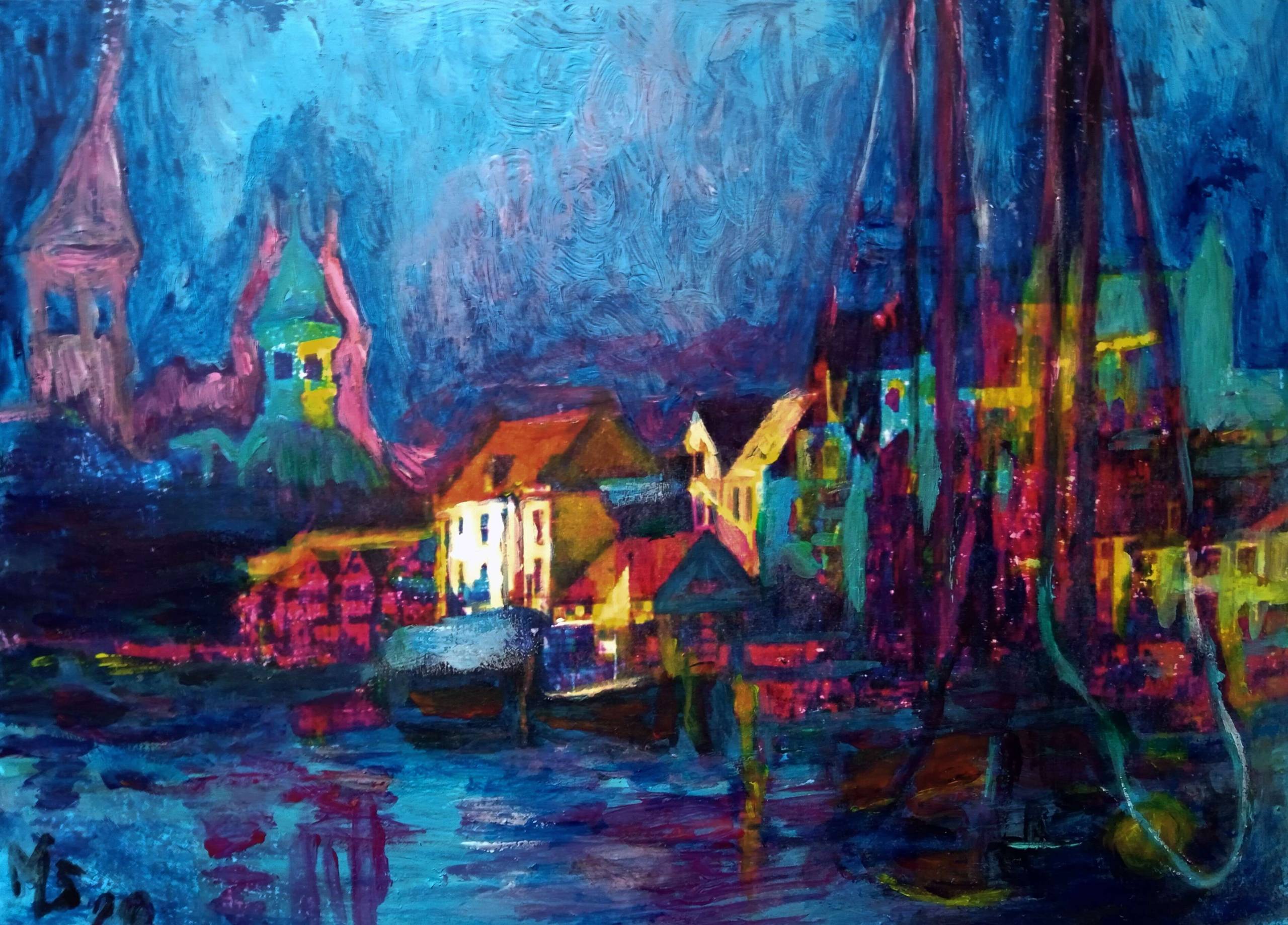 Na obrazie widzimy malownicze miasteczko nocą, skąpane w błękitnych tonach. Kolory eksplodują na powierzchni płótna, łącząc odcienie niebieskiego, różu i zieleni z drobnymi akcentami żółci. Budynki wyglądają jakby były utkane z kolorowych świateł, a niebo zdaje się wirującą masą, pełną energii. Latarnia i łódki na pierwszym planie dodają kompozycji surrealistycznego uroku. Artysta posługuje się techniką impastu, co widać po grubo nakładanej farbie, której tekstura jest niemal namacalna. Obraz emanuje ciepłem i tajemniczością, przyciągając wzrok i pobudzając wyobraźnię. Każdy może znaleźć coś innego w tym obrazie. Dla jednych to spokojna przystań, dla innych wirujące miasto pełne życia. Może przypomnieć o chwili w życiu, kiedy wszystko wydawało się magiczne i pełne możliwości. Dla dziecka wygląda jak bajkowe miasteczko, które chowa skarby na każdym zakręcie. A ja widzę coś jeszcze: "It's mesmerizing!" - myślę sobie, patrząc na te kolory. Ten obraz zaprasza do zatrzymania się na chwilę, do marzenia i zagubienia się w jego czarującej, nocnej scenerii.