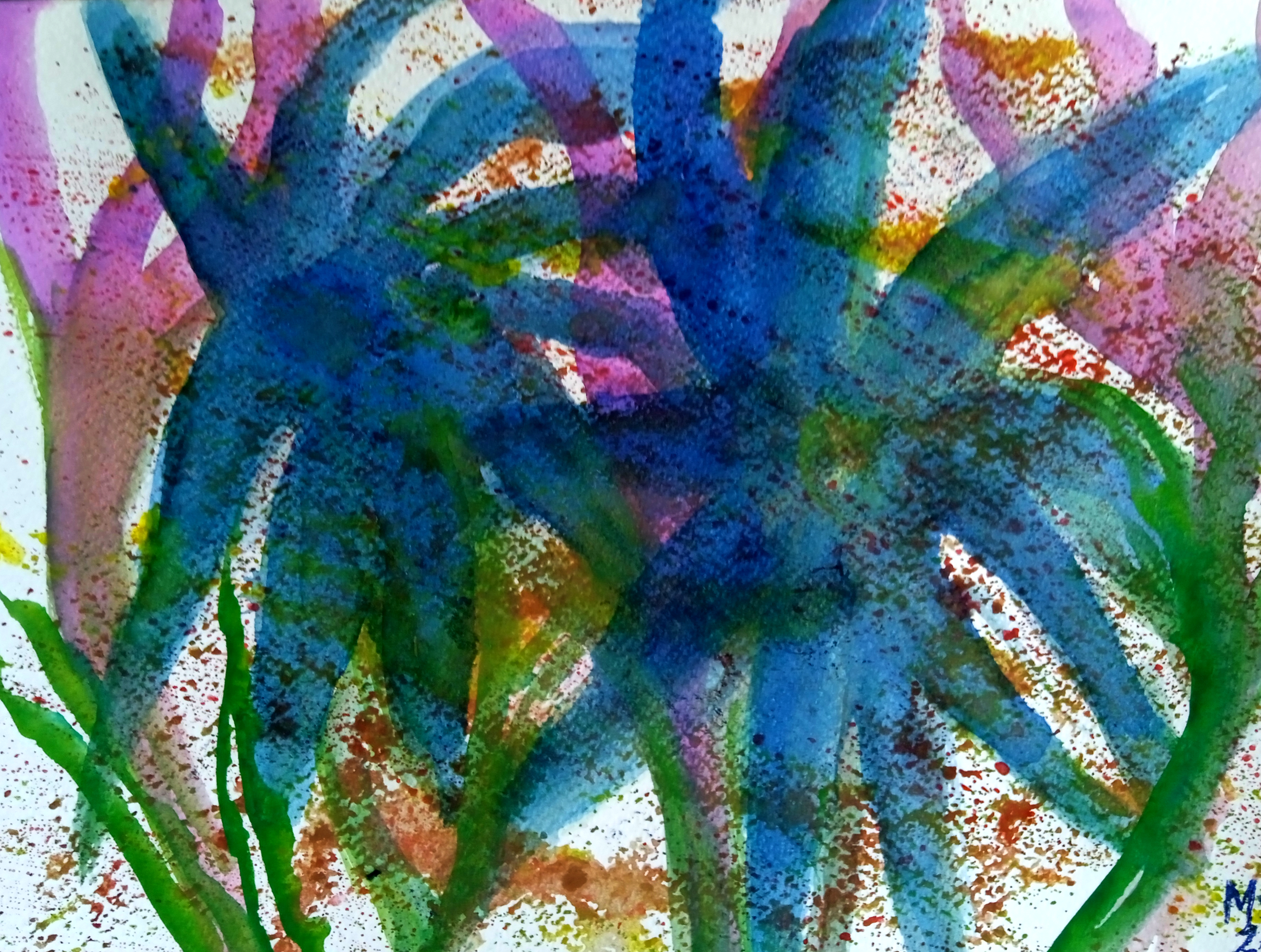Obraz akwarelowy powstały metodą monotypii. Baza obrazu została przeniesiona, jakby odbita z abstrakcji utworzonej wcześniej przez autorkę na płycie. Następnie z tak powstałego tła wydobyte zostały wyobrażone rośliny.